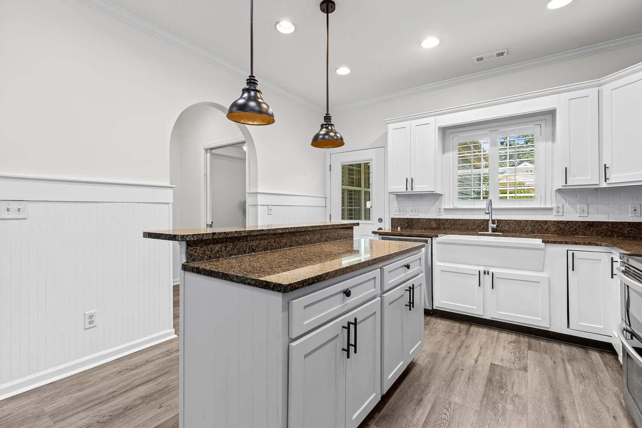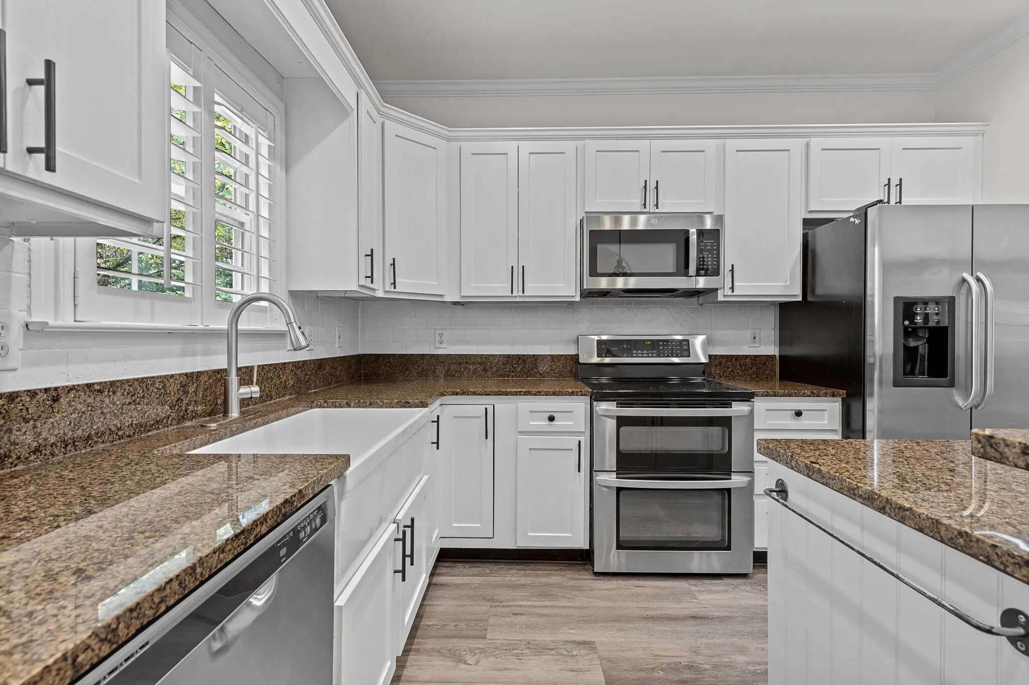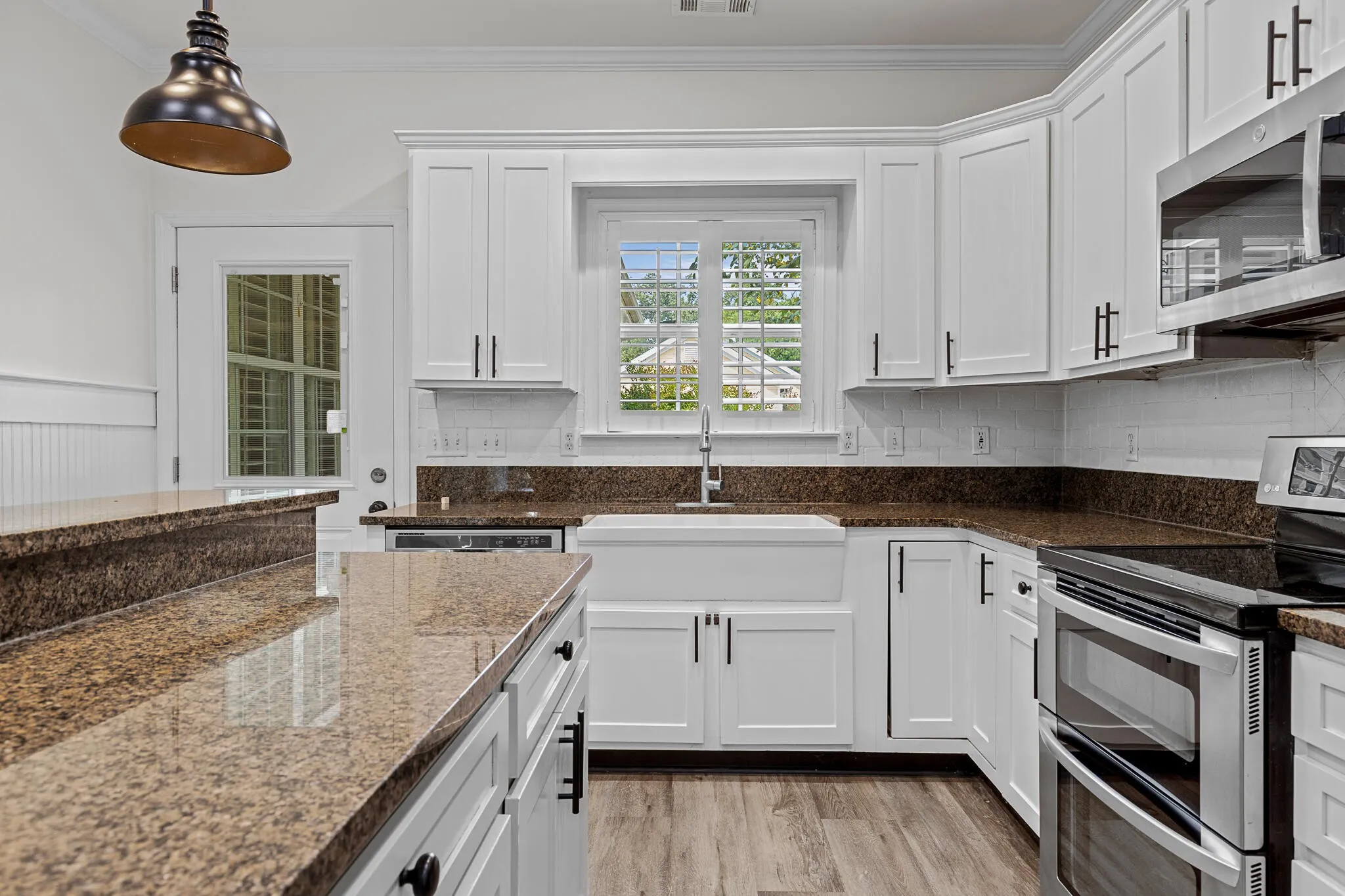Welcome to 854 Callaway Court, a stunning two-bedroom, two-bath condo that blends timeless design with elegant finishes. As you step inside, you’re greeted by vaulted ceilings and a spacious living room centered around a fireplace with a white wooden mantle. French doors, accented by a transom window above, flood the space with natural light, while the adjoining dining room—tucked behind sliding dark oak barn doors—creates the perfect balance of openness and privacy.
