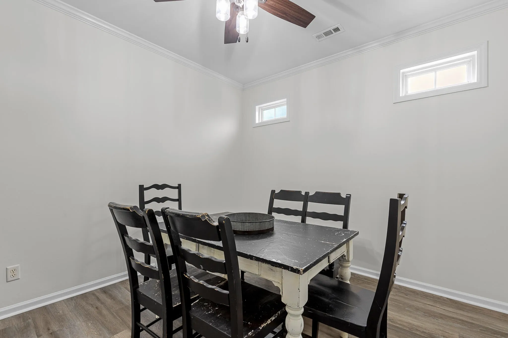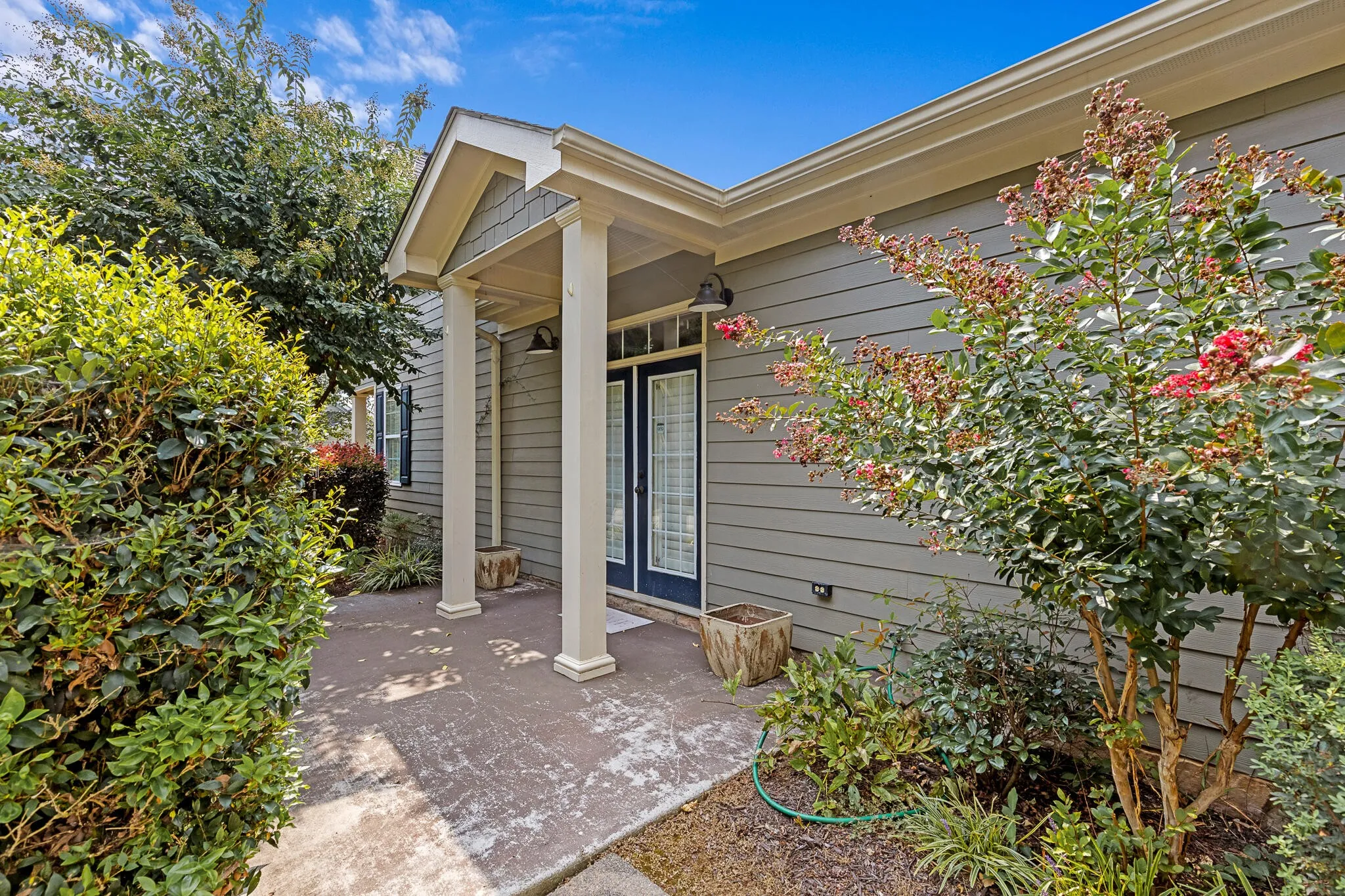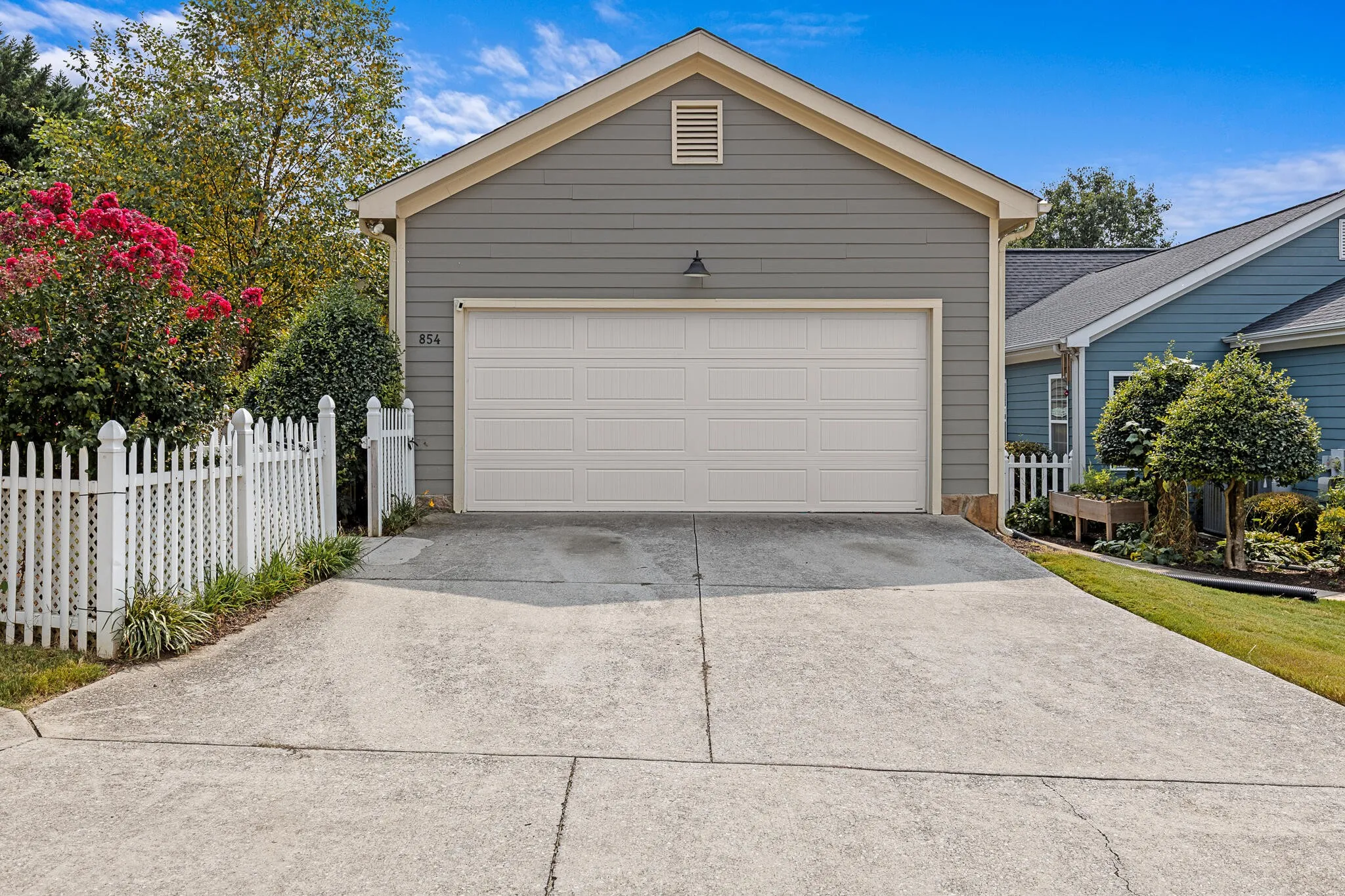 For those who work from home or simply love a quiet escape, the dedicated library or office space is a highlight, complete with built-in dark wood shelving and charming French windows. Outside, the fenced yard is a private sanctuary, landscaped with flowering trees and bordered by a white picket fence that creates a Nantucket-inspired feel. A two-car garage adds convenience, while the close-knit community offers privacy, shared green spaces, and a welcoming neighborhood atmosphere.