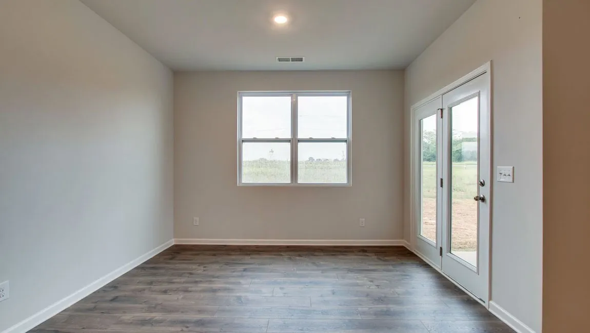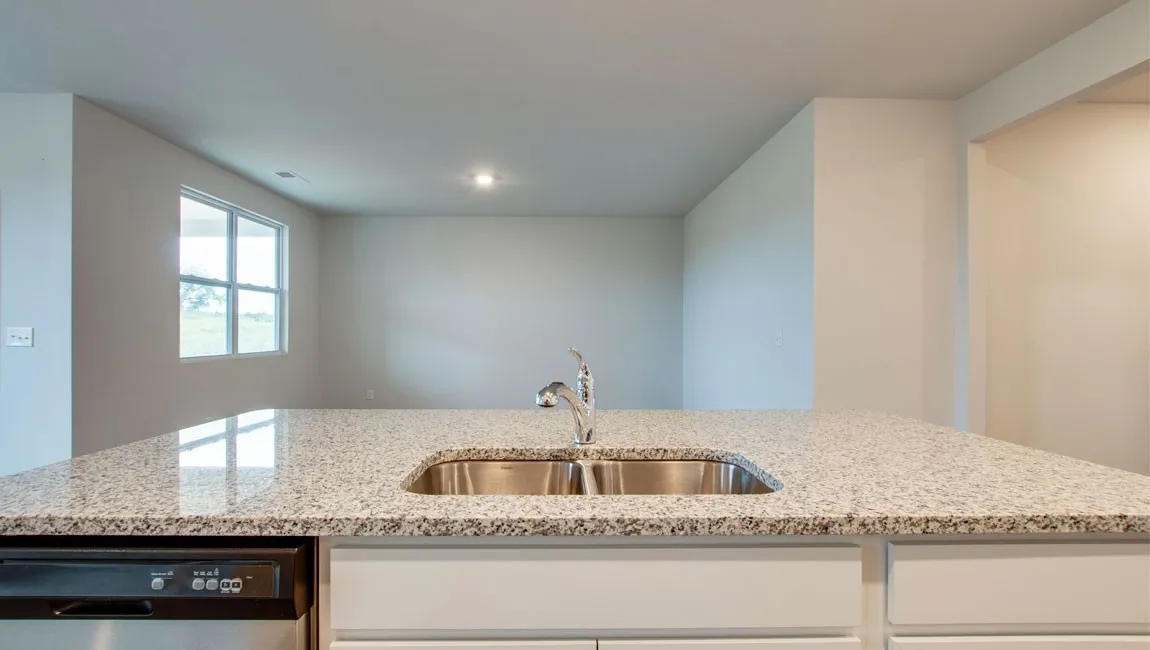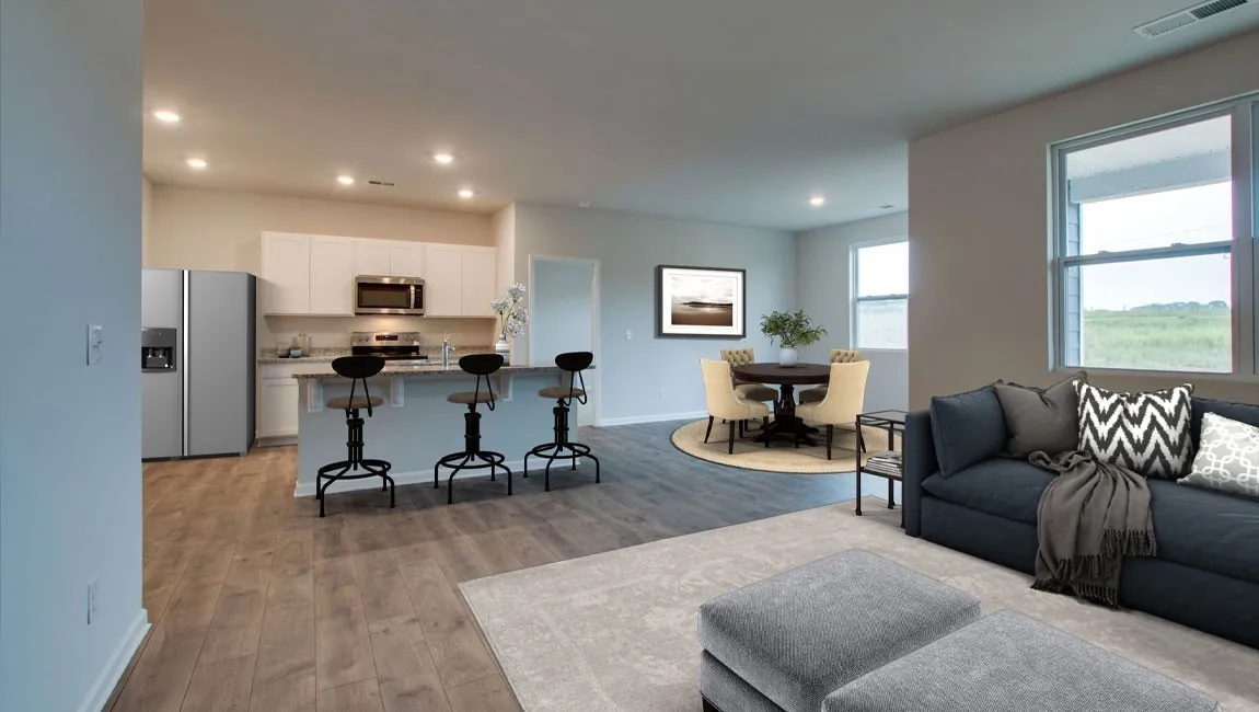 Welcome to the Aria, a standout single-story floorplan at The Parks! Blending sleek modern design with budget-friendly appeal, the Aria offers both value and quality in a stylish package. Inside, you’ll enjoy 9′ ceilings and an open-concept layout that fills the home with natural light. The kitchen is equipped with a large island perfect for bar-style seating or entertaining, plenty of cabinetry, quartz countertops, and a walk-in pantry. Adjacent dining and living areas seamlessly open to a covered porch, ideal for outdoor dining or relaxing. The primary bedroom, located at the rear of the home for privacy, easily accommodates a king-size bed and features an en suite bathroom with a double vanity, walk-in closet, and separate linen storage. 2 additional bedrooms at the front share a second full bathroom, also with quartz countertops. The roomy 2-car garage connects directly to the front hallway, where the laundry room is conveniently located. Each bedroom is thoughtfully designed with carpeting and closet space, offering flexibility for bedrooms, home offices, or bonus rooms. Whirlpool stainless-steel appliances & a smart home technology package that lets you control your home’s lighting, temperature, and security remotely.