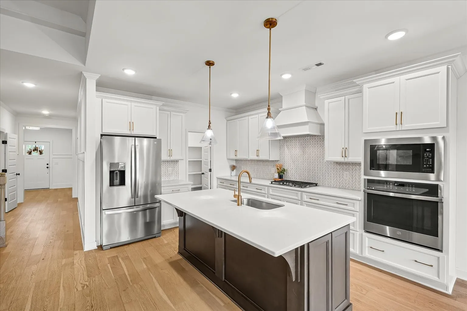 The primary suite promises privacy and tranquility with its location at the back of the main floor. Indulge in the spa-like bathroom, complete with a soaking pedestal tub, a walk-in tile shower, a double vanity, and a huge walk-in closet. The second bedroom suite on the 1st floor, conveniently located in the front of the home, also offers a private bathroom and a walk-in closet.