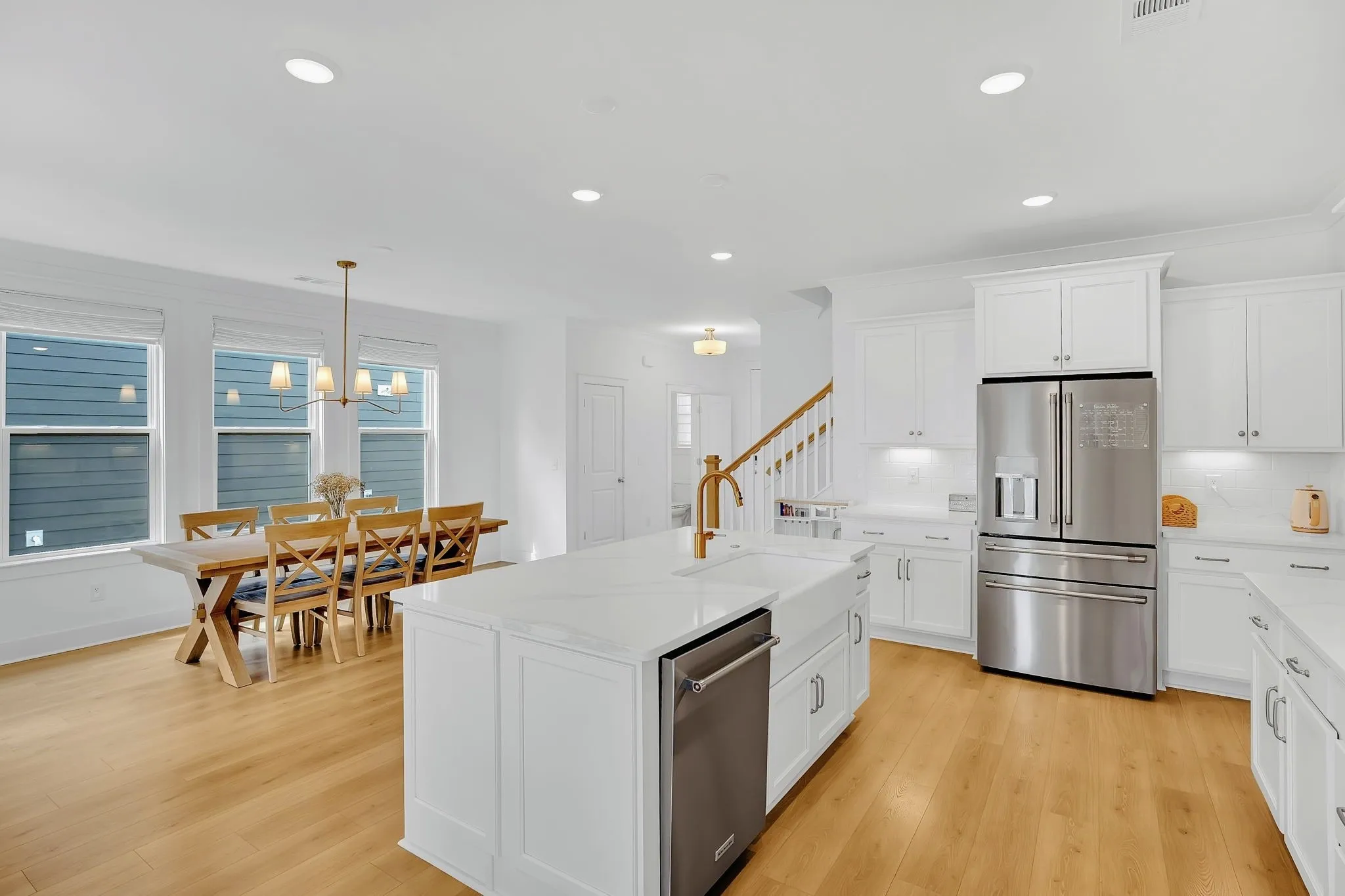 Chef’s kitchen with quartz countertops, farmhouse sink, 42” cabinets, under-cabinet lighting, designer backsplash, gas stove, large island, walk-in pantry, and butler’s pantry.