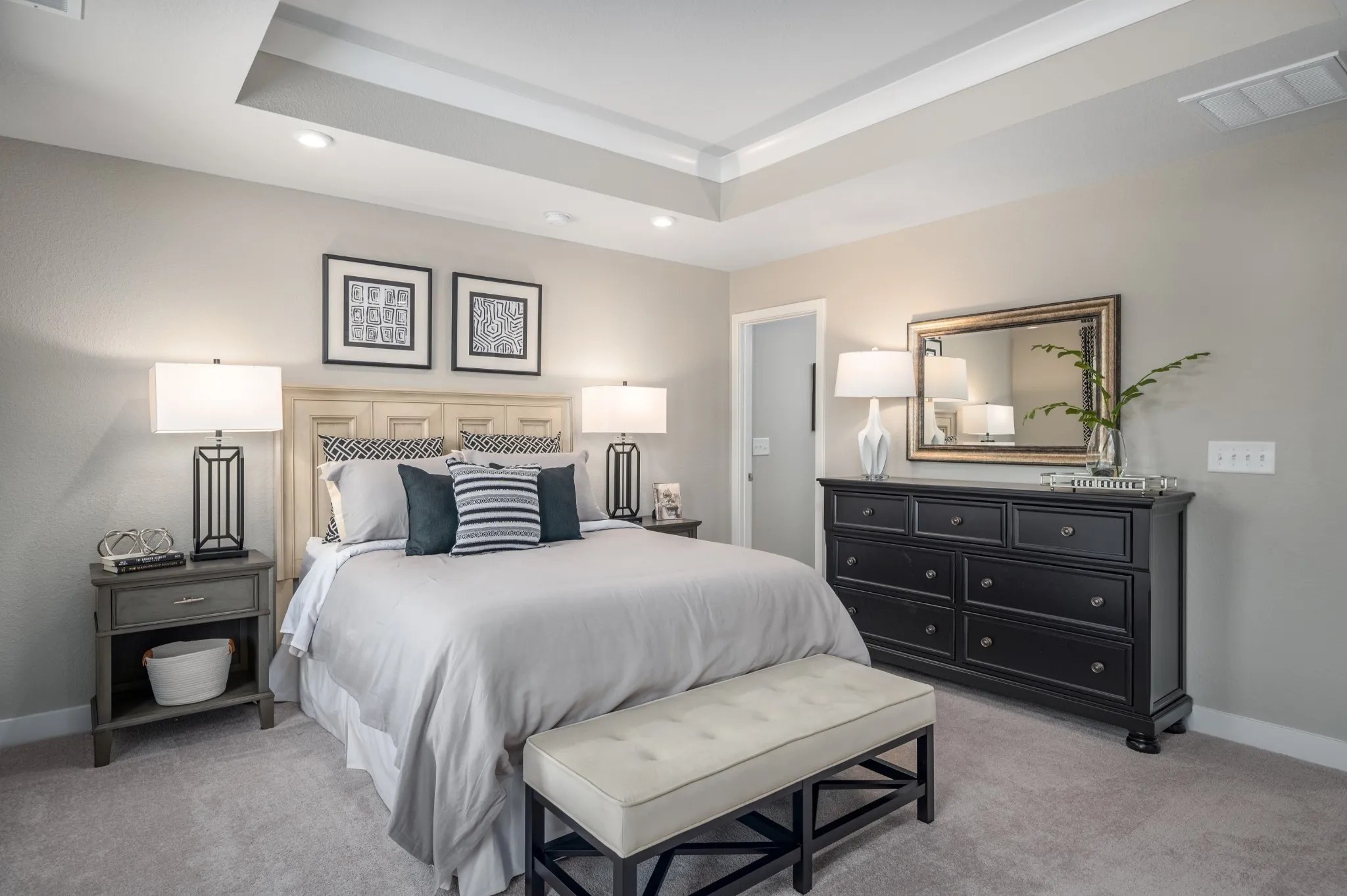 The spacious kitchen features plenty of cabinet space and a wide array of customization options, including quartz countertops, designer backsplash, hardware, cabinets, lighting fixtures, and LVP flooring—so you can personalize your space to reflect your taste. Stainless-steel GE appliances are included for a sleek, modern finish.