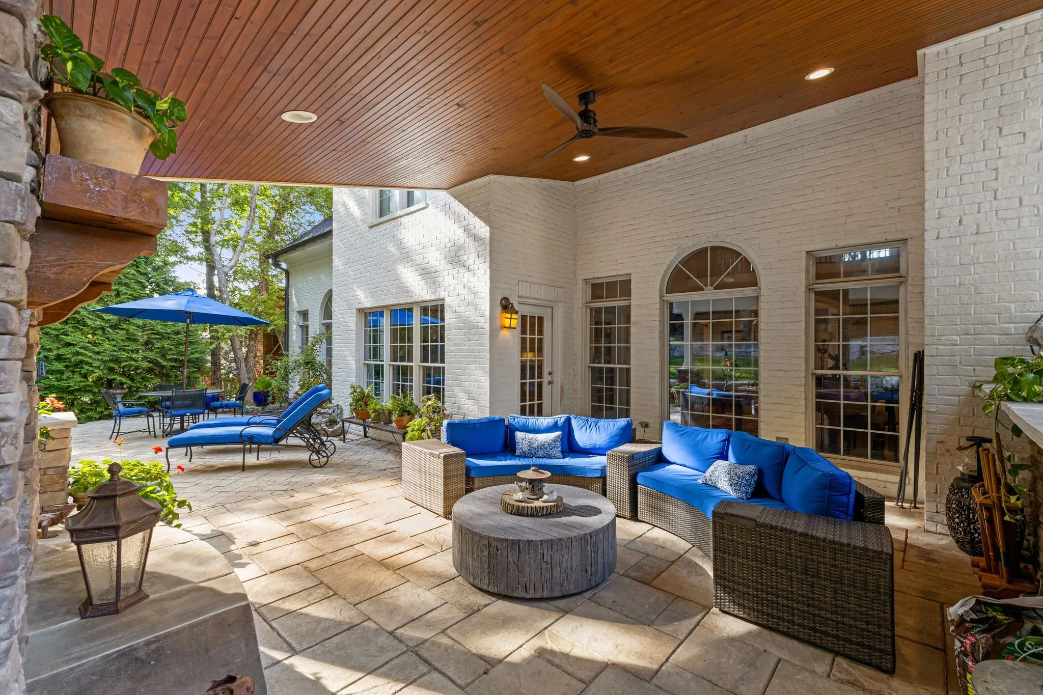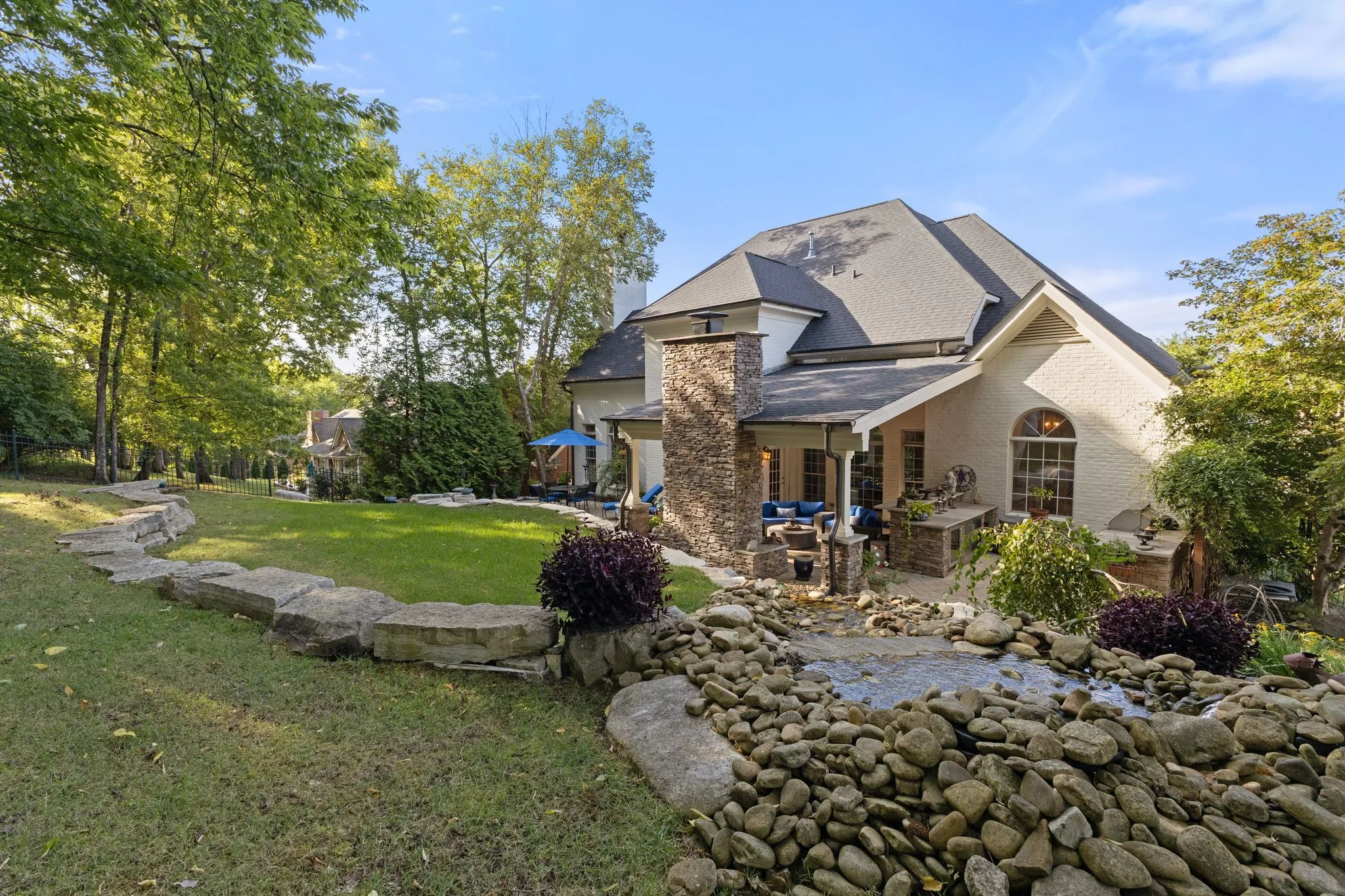 The backyard is a serene oasis backing a private seven-acre forested common area. Features include a paver patio, covered seating with a fan, outdoor fireplace, built-in kitchen, and a tranquil water feature—perfect for entertaining or relaxation.\n