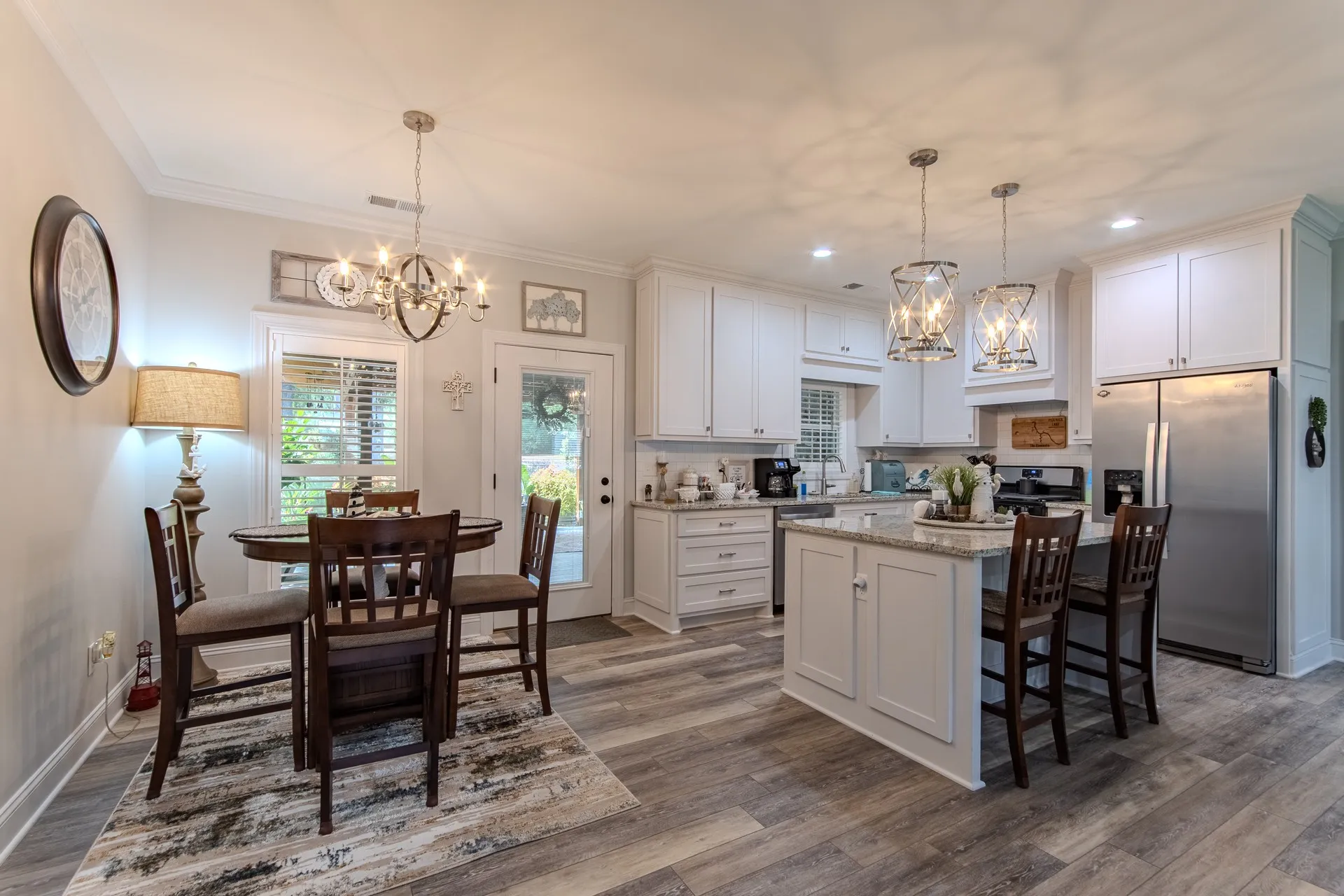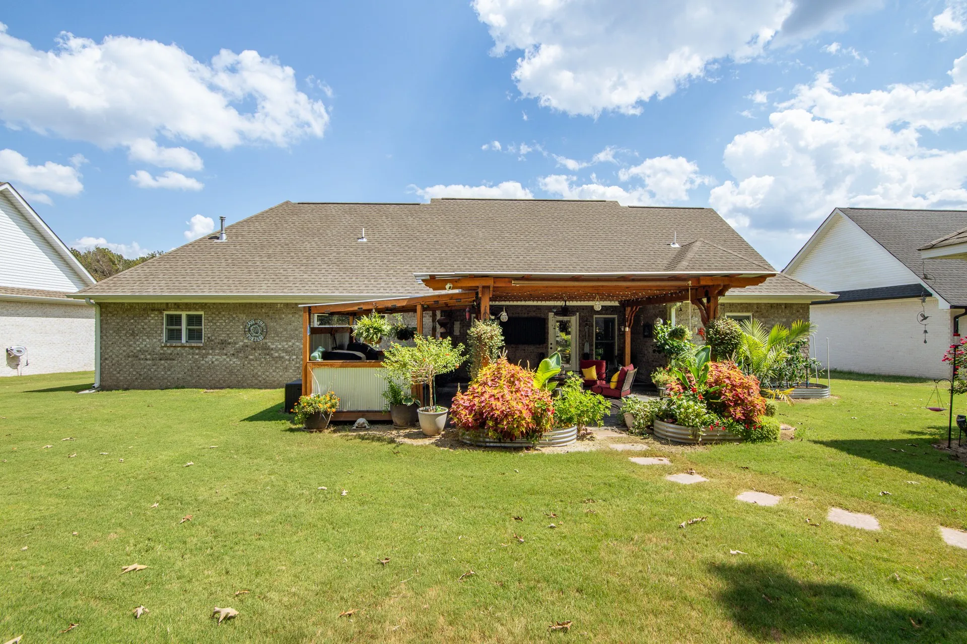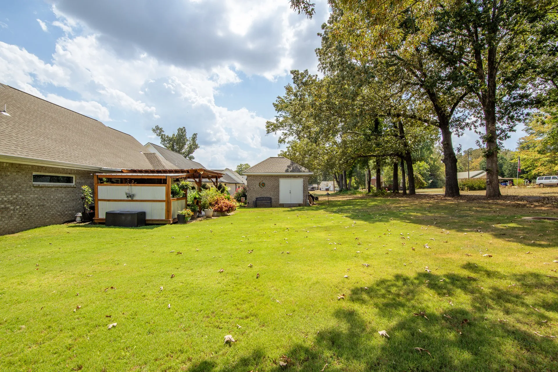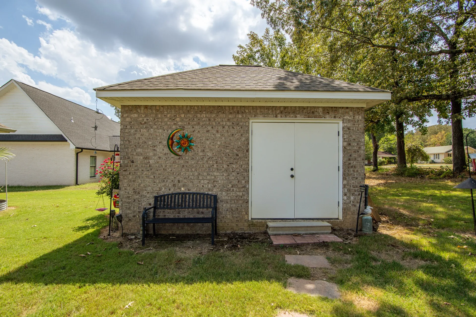 Stunning home in River Birch! This property combines the best of both worlds, peaceful surroundings yet just minutes from shopping, & features city utilities. Inside, you’ll find an open-concept floor plan designed for both comfort & style. The custom kitchen boasts ceiling-height/soft-close cabinetry, granite countertops, gas cooking, & a spacious island perfect for gathering. Hardwood & tile flooring flow throughout, complemented by crown molding, 9-ft. ceilings, & timeless plantation shutters! A split-bedroom layout ensures privacy, while the oversized laundry room adds everyday ease. Outdoors, no detail has been overlooked! The oversized covered patio is truly an extension of the home, complete w/a custom grilling station & ample room for dining/relaxing. Surrounded by lush landscaping & a sprinkler system, this backyard was thoughtfully designed for year-round enjoyment. The inviting front porch adds classic curb appeal & a matching 12×16 brick outbuilding offers extra storage!