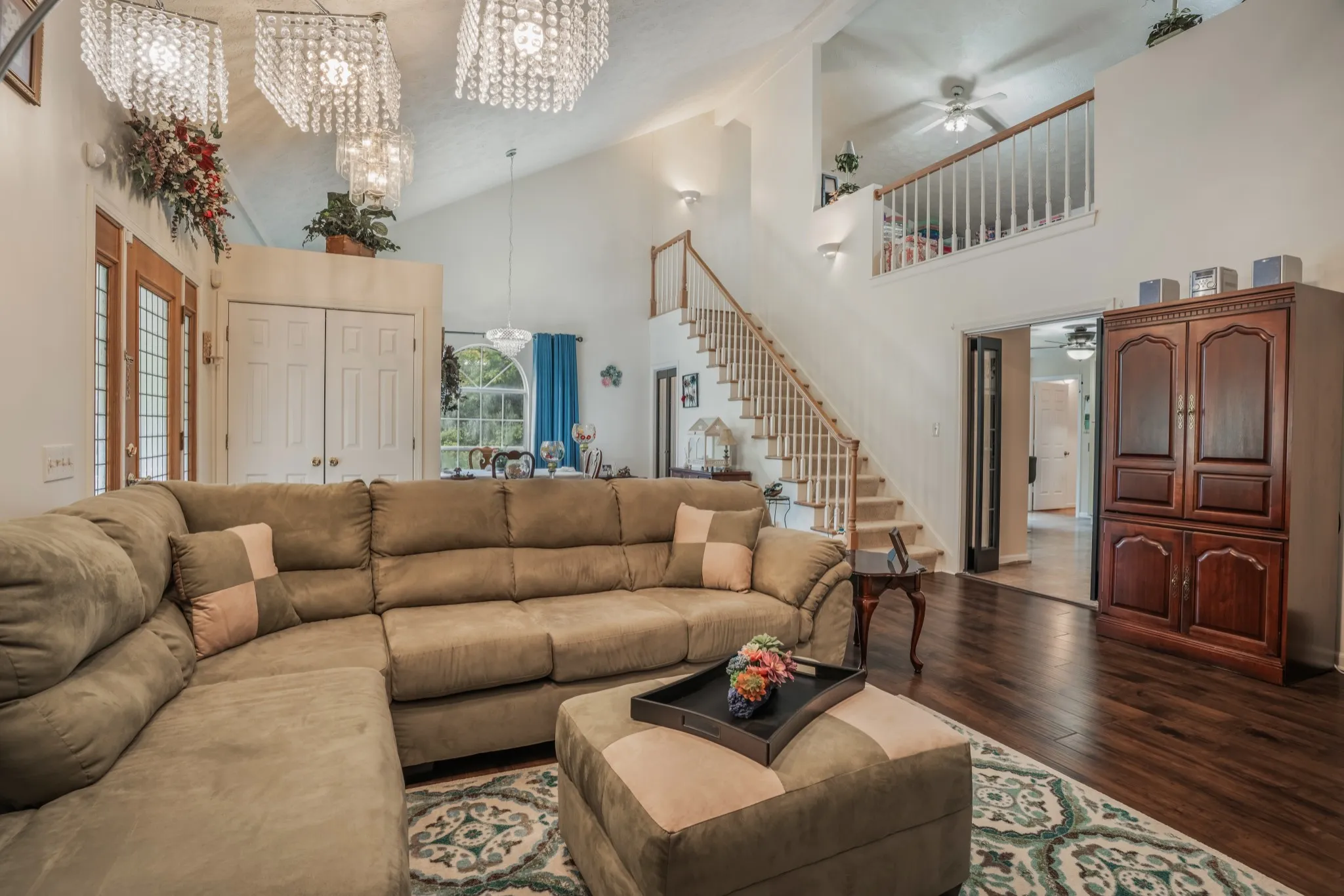 Inside, the main level boasts soaring ceilings in the living room that extend to the upper level, creating a bright and open feel. The living room also includes a cozy fireplace and opens to the formal dining room, which overlooks the main living space. The kitchen offers an island, breakfast bar, and pantry—perfect for both everyday meals and entertaining.