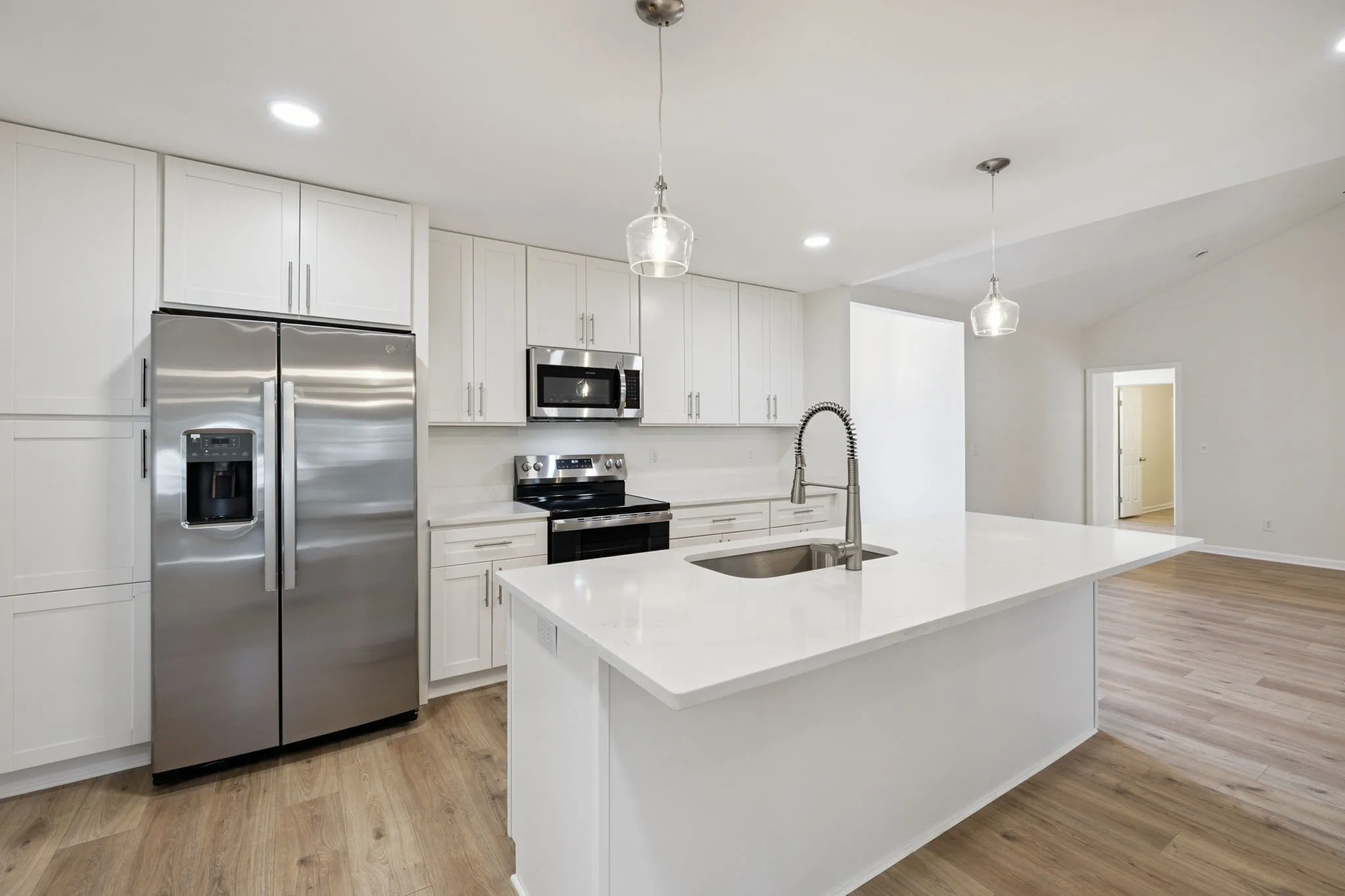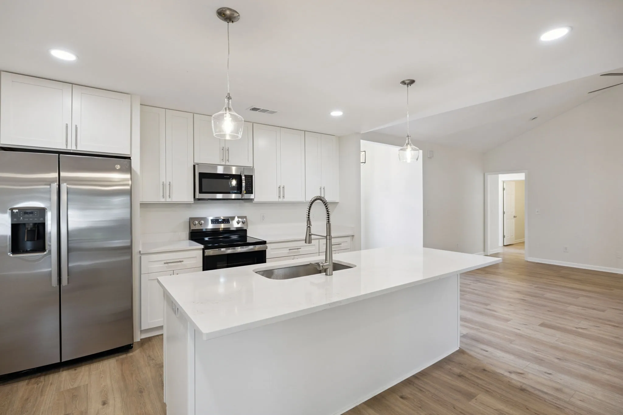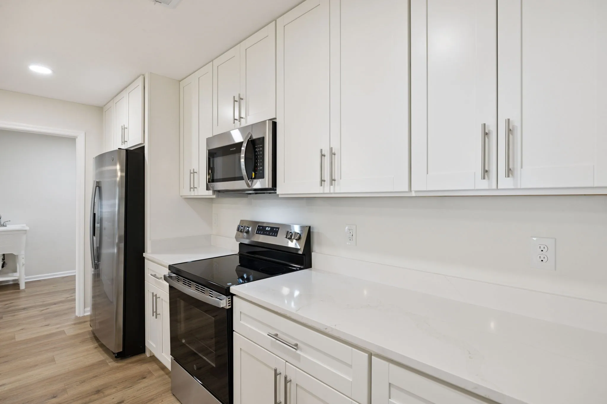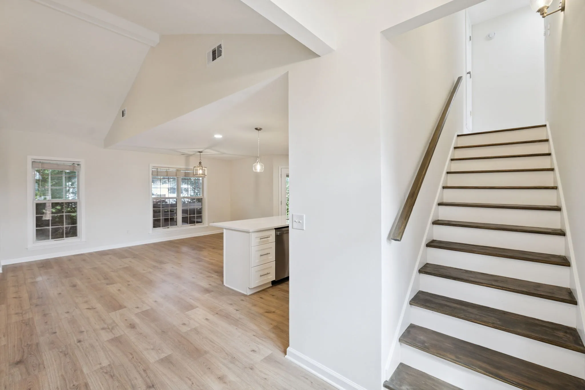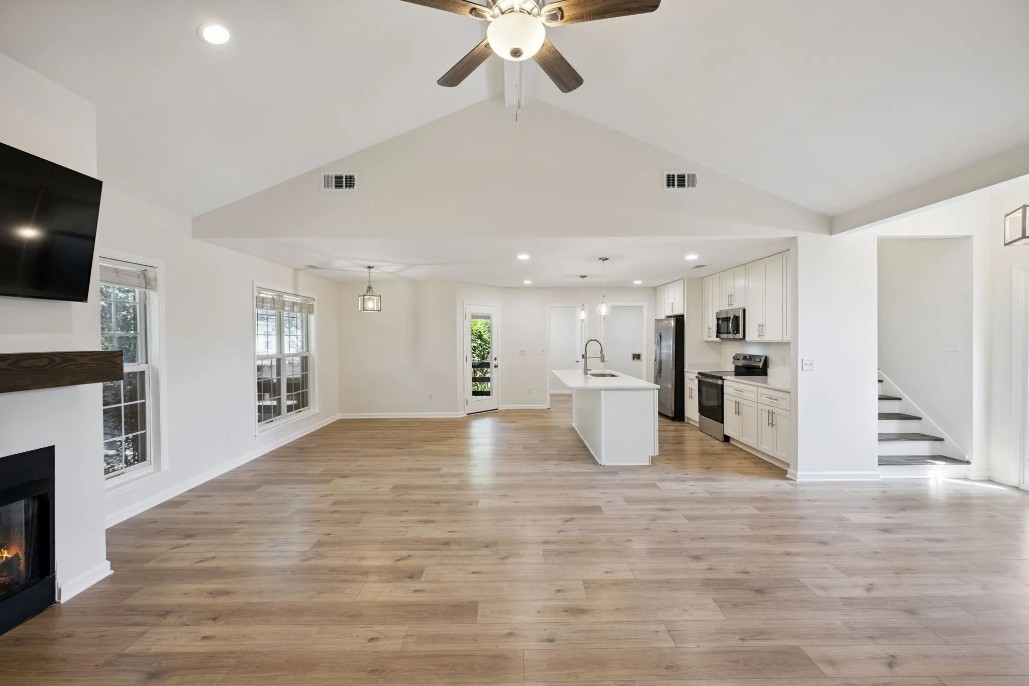 The open-concept layout offers a bright and inviting space, highlighted by a brand-new kitchen featuring sleek quartz countertops, shaker cabinetry, and stainless steel appliances. All bathrooms have been fully renovated with fresh tilework, modern vanities, and stylish fixtures for a polished, contemporary feel.
