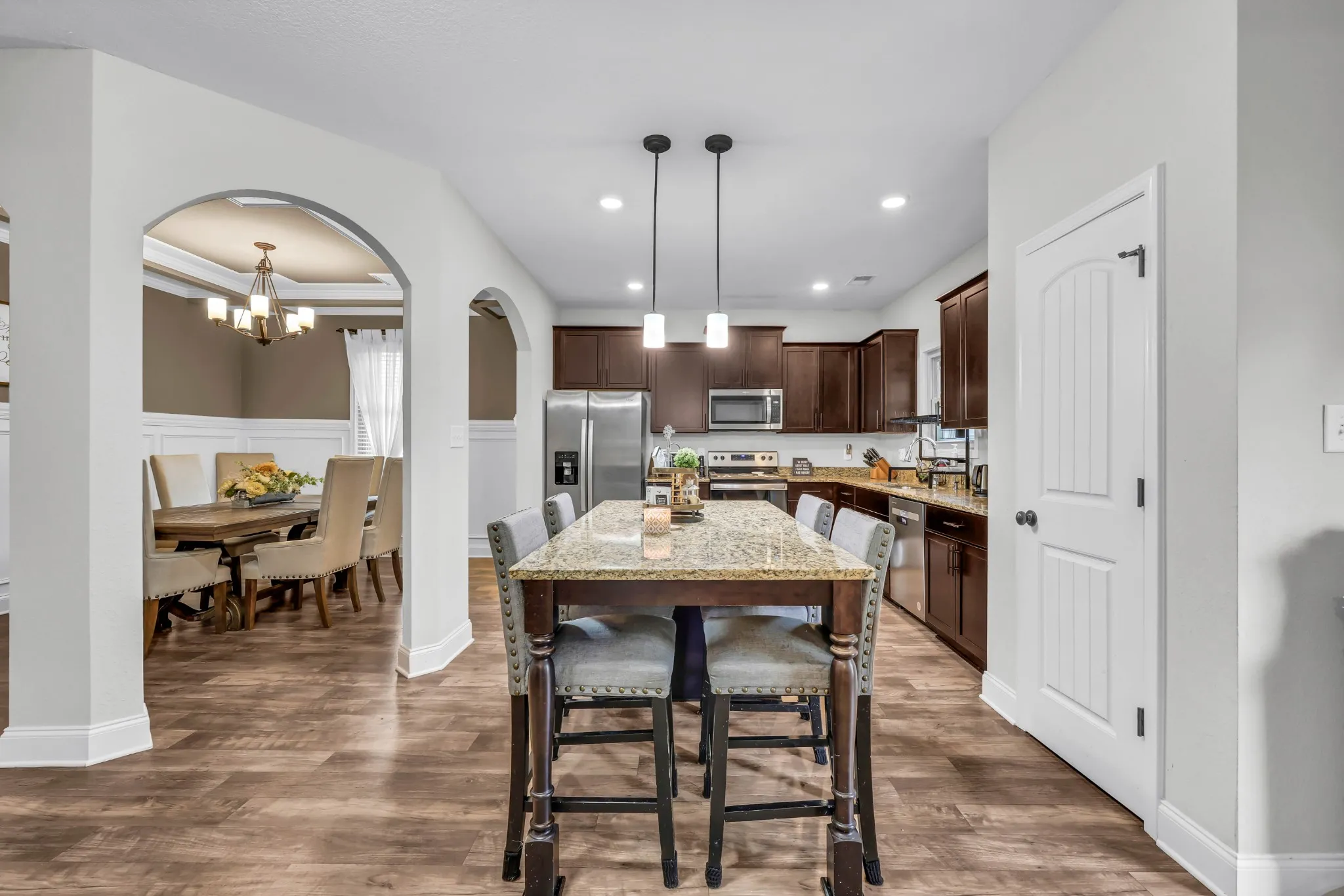Spacious and beautifully maintained 5-bedroom, 3-bath home in West Creek Farms. This open-concept layout features elegant coffered ceilings, crown molding, wainscoting, and durable wood-look flooring throughout the main areas. The chef’s kitchen includes granite countertops, a 7-ft island, stainless steel appliances, and a walk-in pantry, flowing into a cozy living room with fireplace. A formal dining room adds sophistication, and a main-level bedroom sits near a full bath—ideal for guests or a home office. Upstairs, the expansive owner’s suite offers a private sitting room, two walk-in closets, and a spa-like bath with soaking tub and tiled shower. Enjoy a covered back patio, a fully privacy-fenced yard, and a large storage shed for added convenience. Schedule your tour today and see why this home stands out in West Creek Farms!