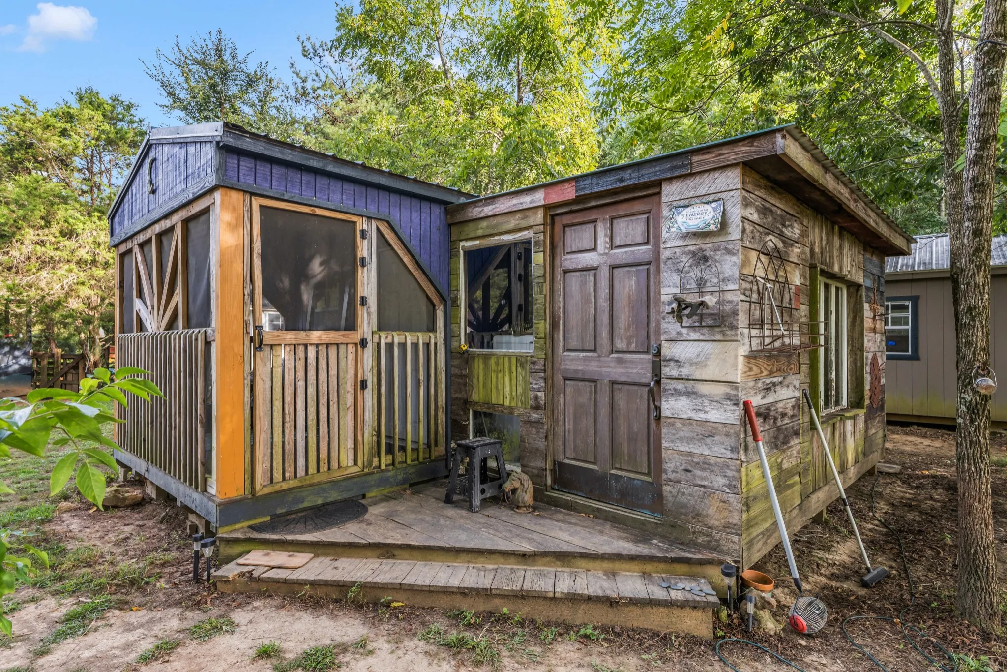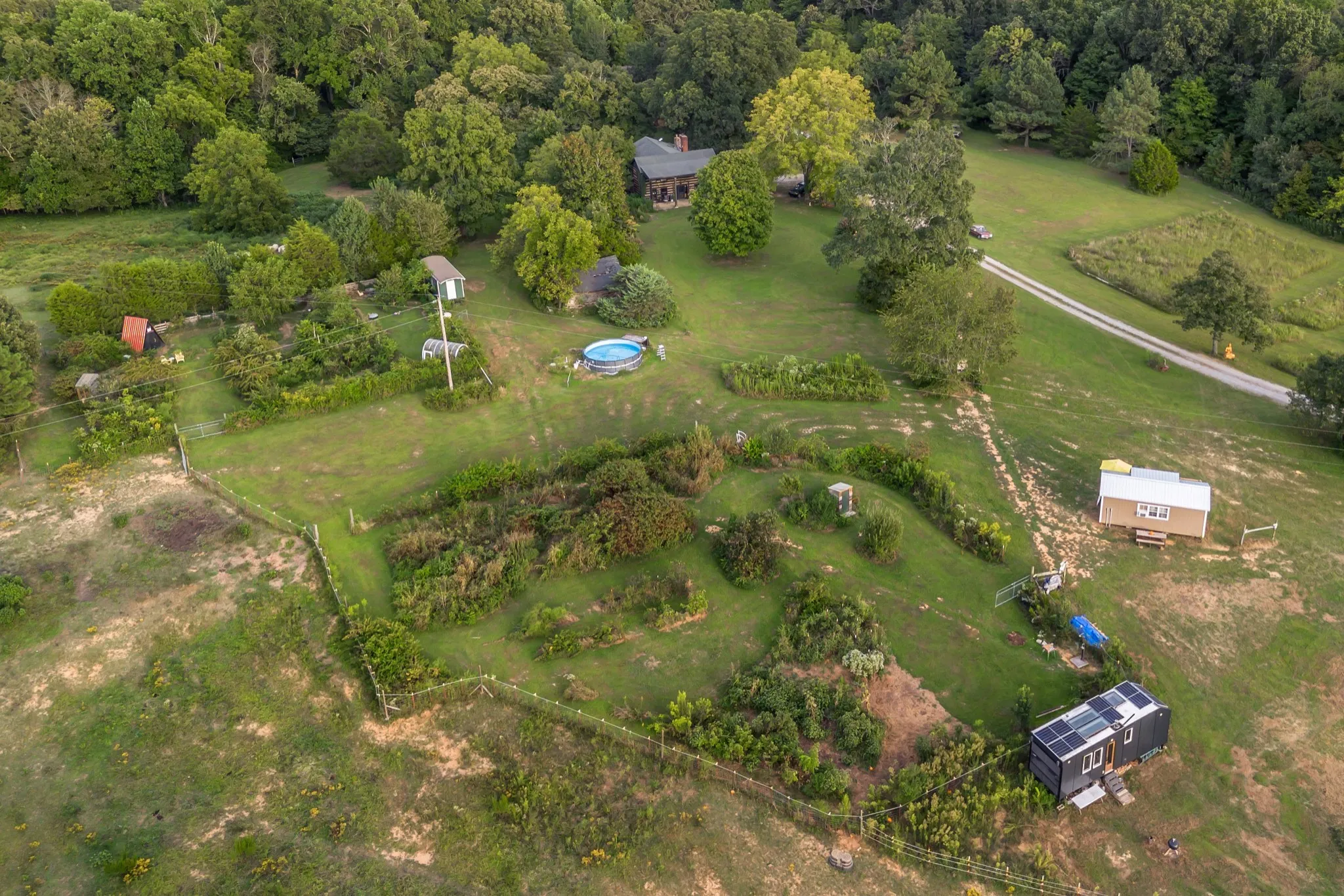 Property highlights include a large barn, horse paddocks, fenced pastures, riding trails, greenhouse, and 30,000 sq. ft. of organic gardens with medicinal plants, pollinator banks, and clover pastures. A spring-fed year-round creek, additional creeks, and ponds add sought-after water features. Income-producing elements include guest cabins, rentable tiny homes and campers (some with murals and kitchenettes), and multiple RV hookups, with operational businesses available to convey. Utilities: spring, city, and 2018 well water, ROC solar, and 400-amp power. Greenbelt designation reduces property taxes by approx. 2/3.\n