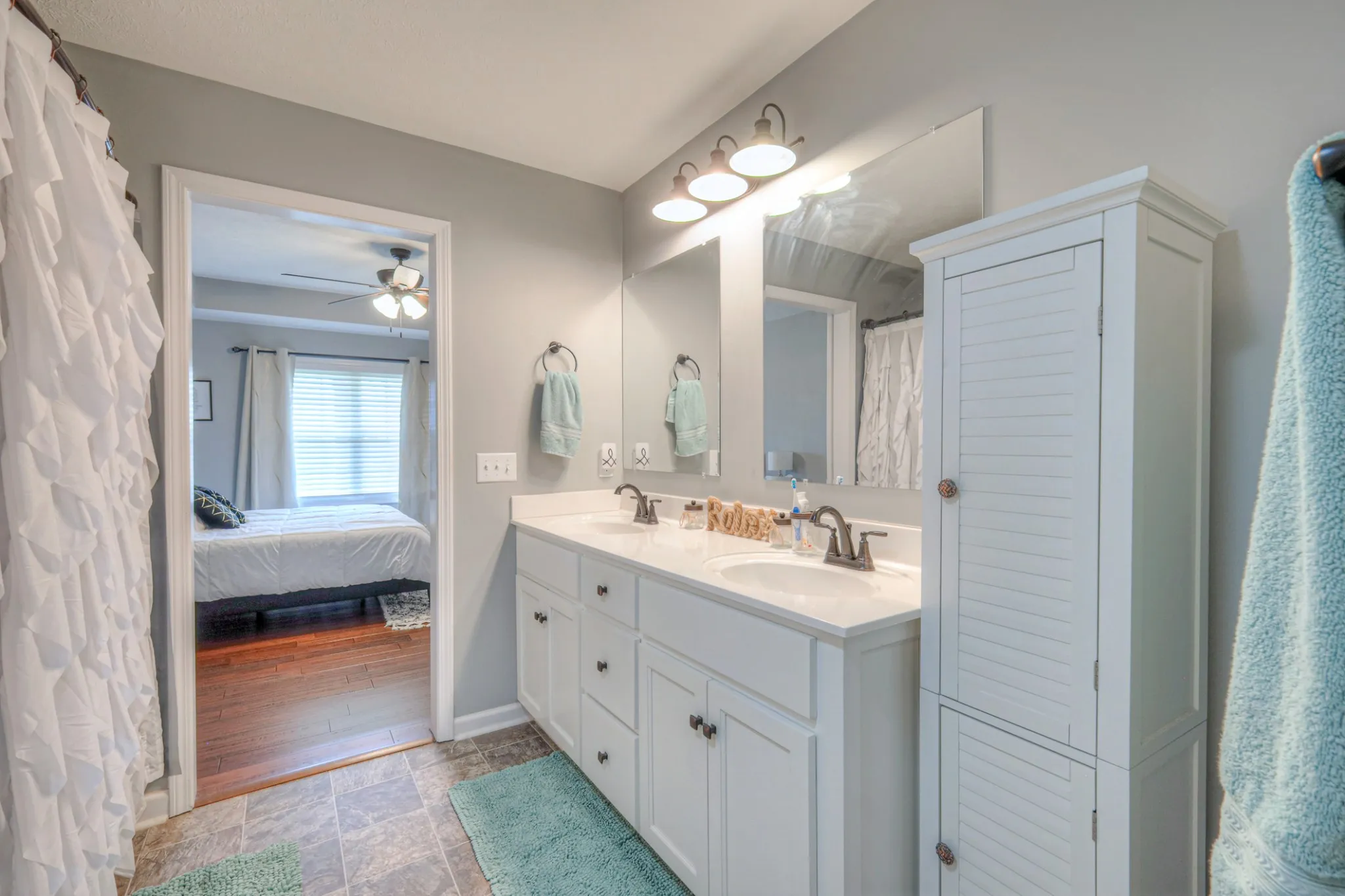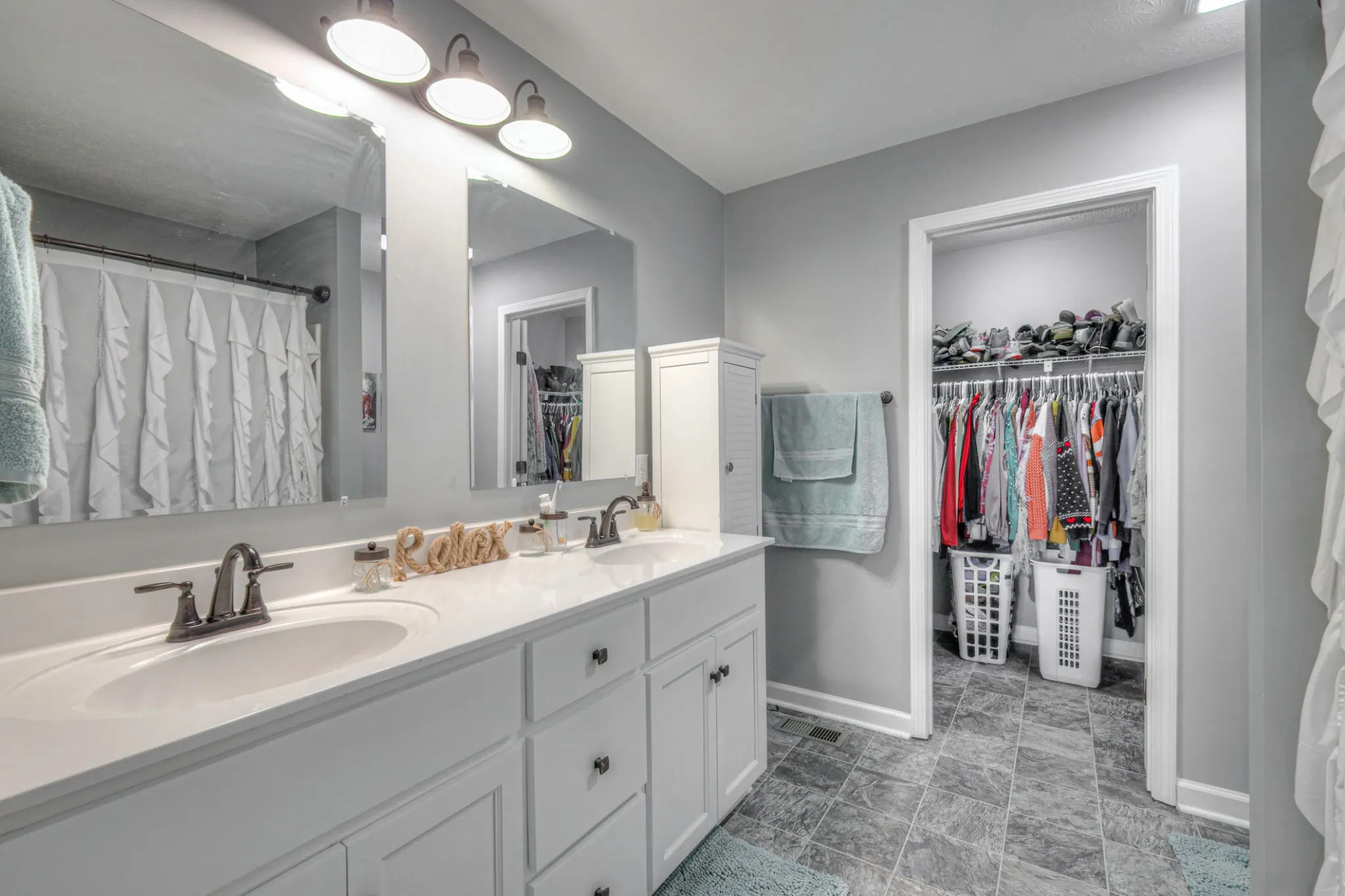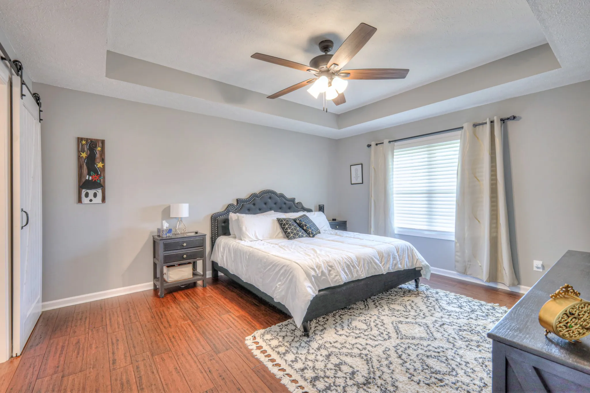 The primary suite is tucked away for privacy, featuring a vaulted ceiling, walk-in closet, and an ensuite bath with dual vanities and a sliding barn door that adds rustic charm. Two additional spacious bedrooms offer flexibility for family, guests, or a home office.