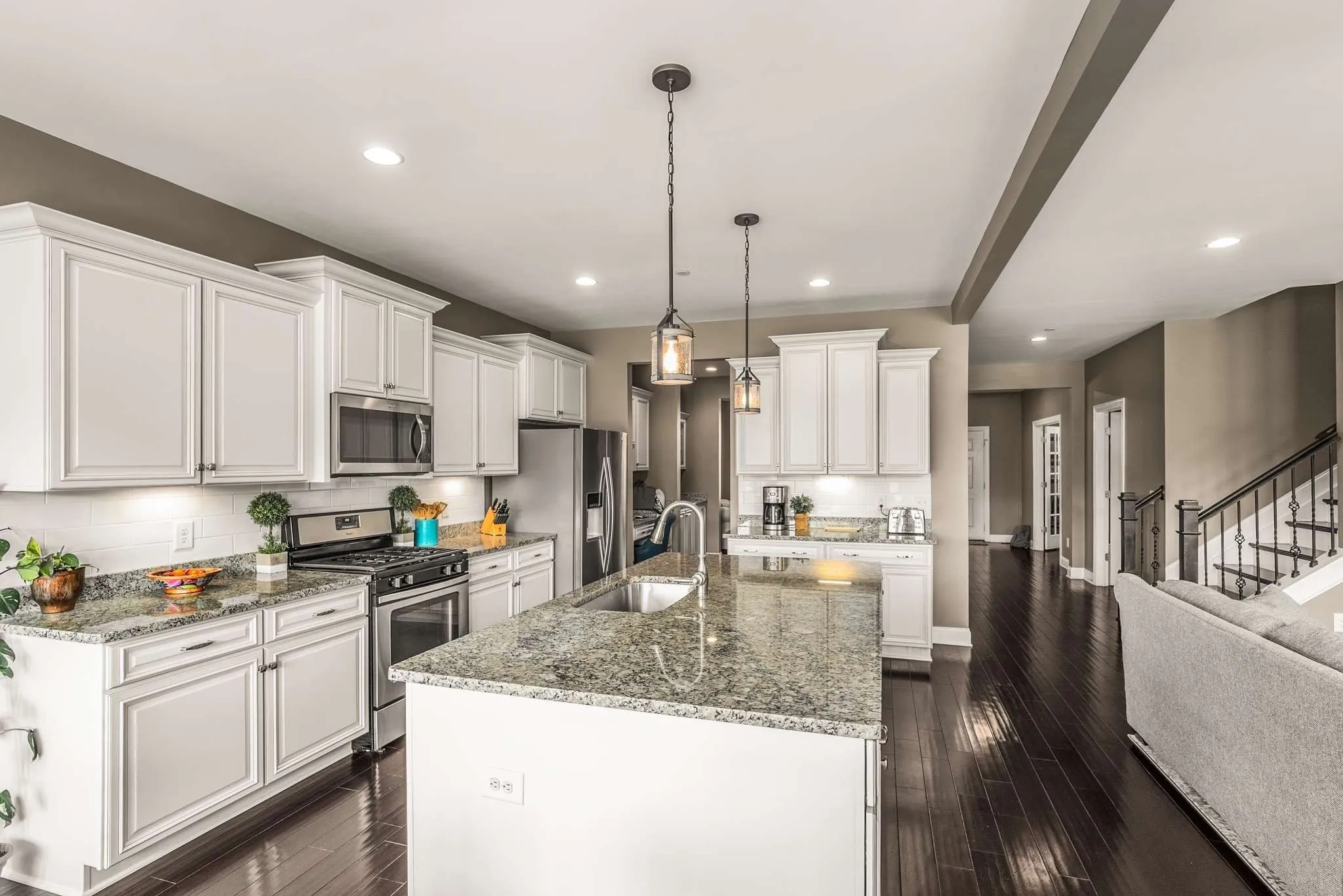 The main level guests are greeted by an open-concept living area featuring handsome hardwood floors. The gourmet kitchen is the perfect place for gathering, complemented by an expansive walk-in pantry, much larger than those typically found in the area. The large primary bedroom is located on the main level and features a relaxing bath suite. Also downstairs is an office with stately french doors.