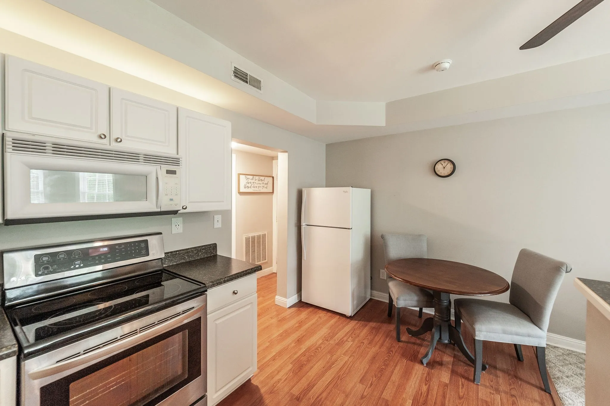 kitchen, laundry room, half bath, and master bath. The kitchen has been tastefully remodeled with professionally painted cabinetry, quartz countertops, a new sink and faucet, stylish backsplash, and under-cabinet lighting. The master suite offers a spa-like feel with new porcelain tile, upgraded fixtures, a sleek shower door, new sinks, and mirrors. Additional improvements extend to the refreshed laundry room and half bath, ensuring every space feels both modern and inviting. Blending natural beauty with thoughtful updates, this property delivers comfort, charm, and privacy in an idyllic setting.