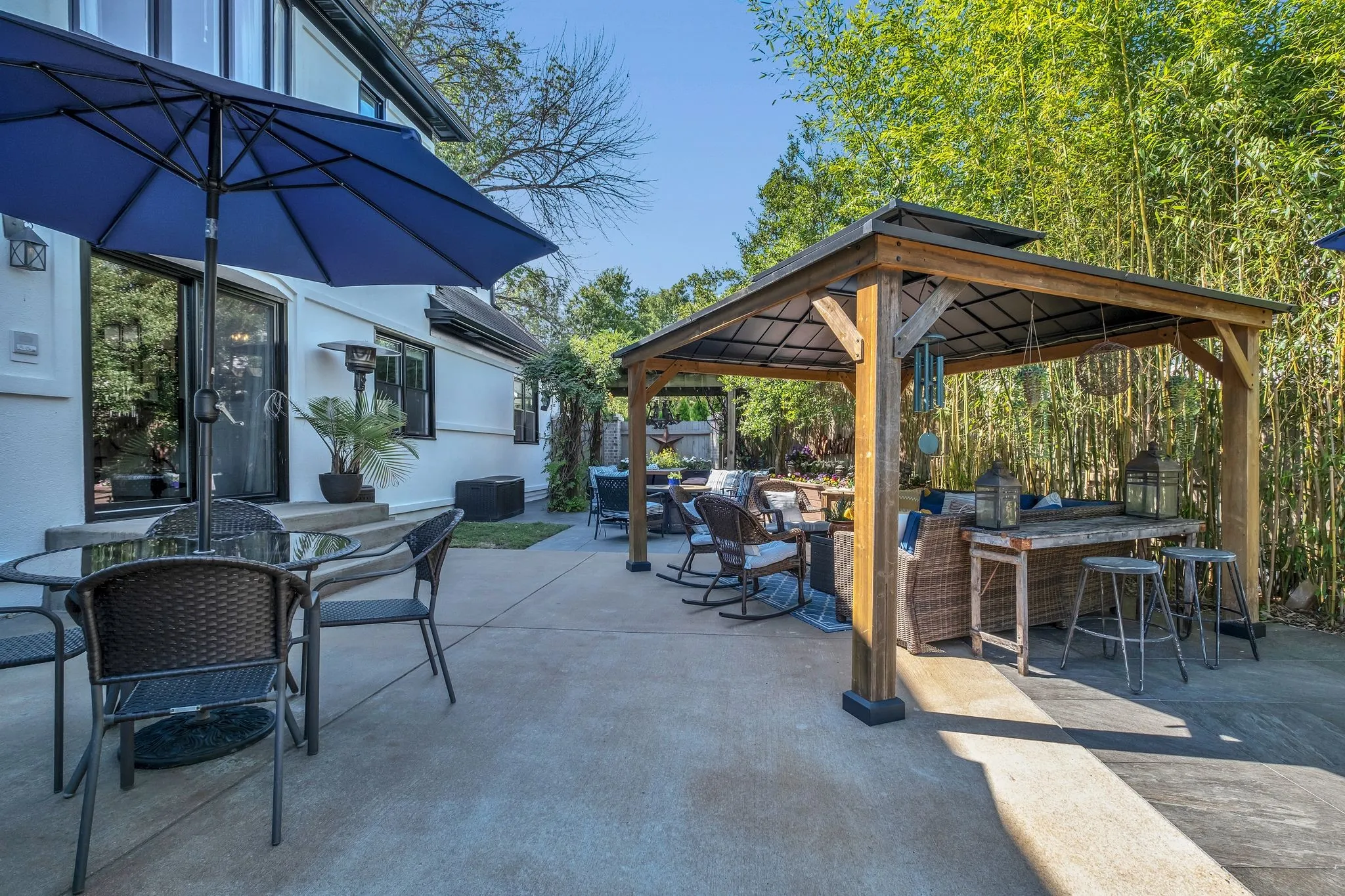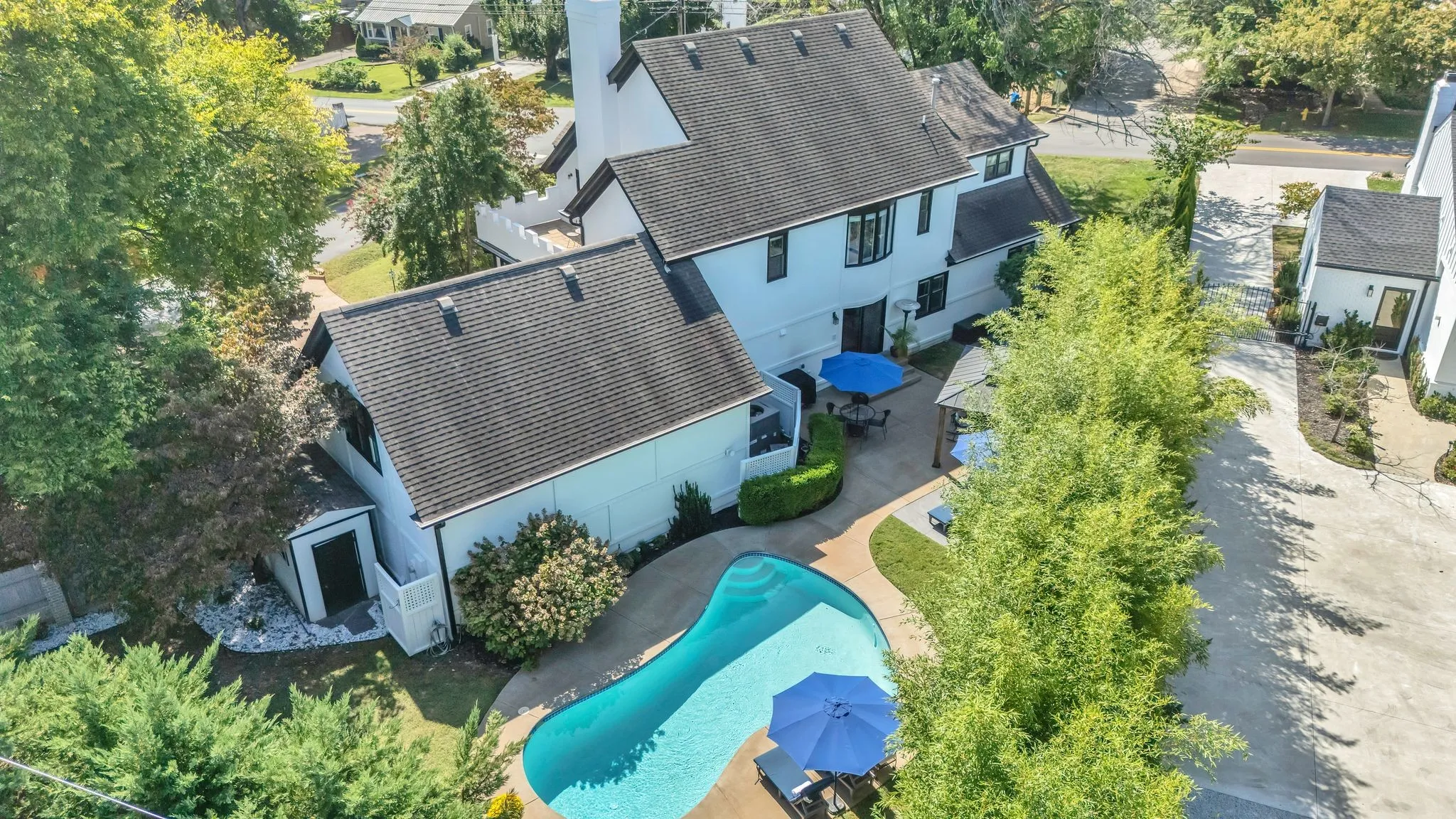 Outside on this private corner lot with a fully fenced backyard is a special and rare offering for downtown Franklin. Designed for relaxation and entertaining. Enjoy your very own oasis with a sparkling swimming pool, large patio with pergola, and generous seating areas. A raised bed garden adds a touch of country living to this backyard paradise, perfect for gatherings or quiet solitude.\n