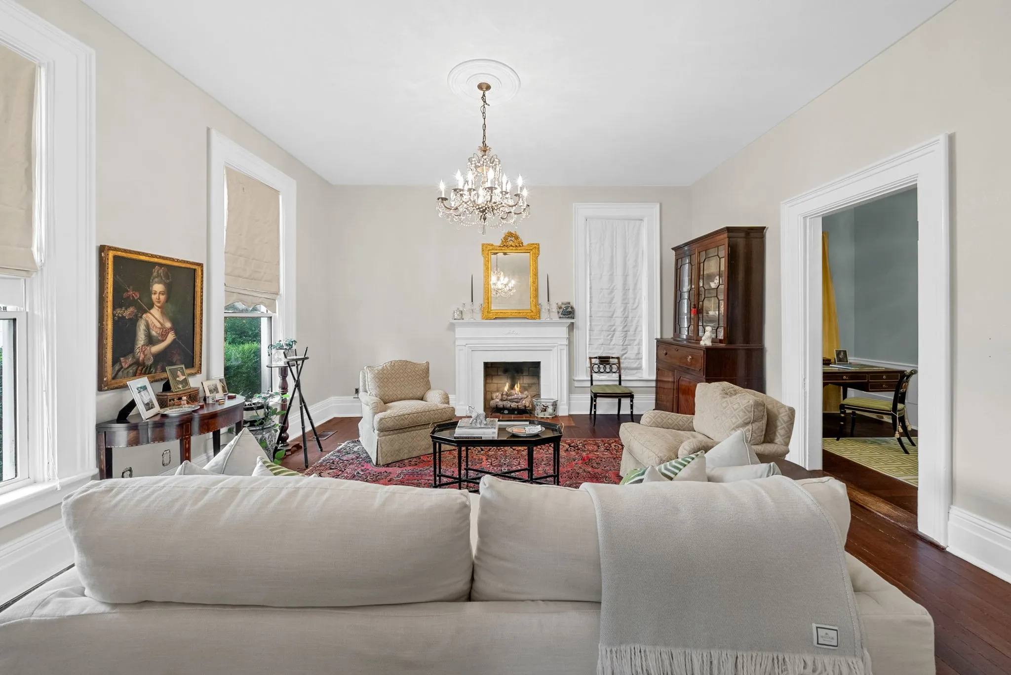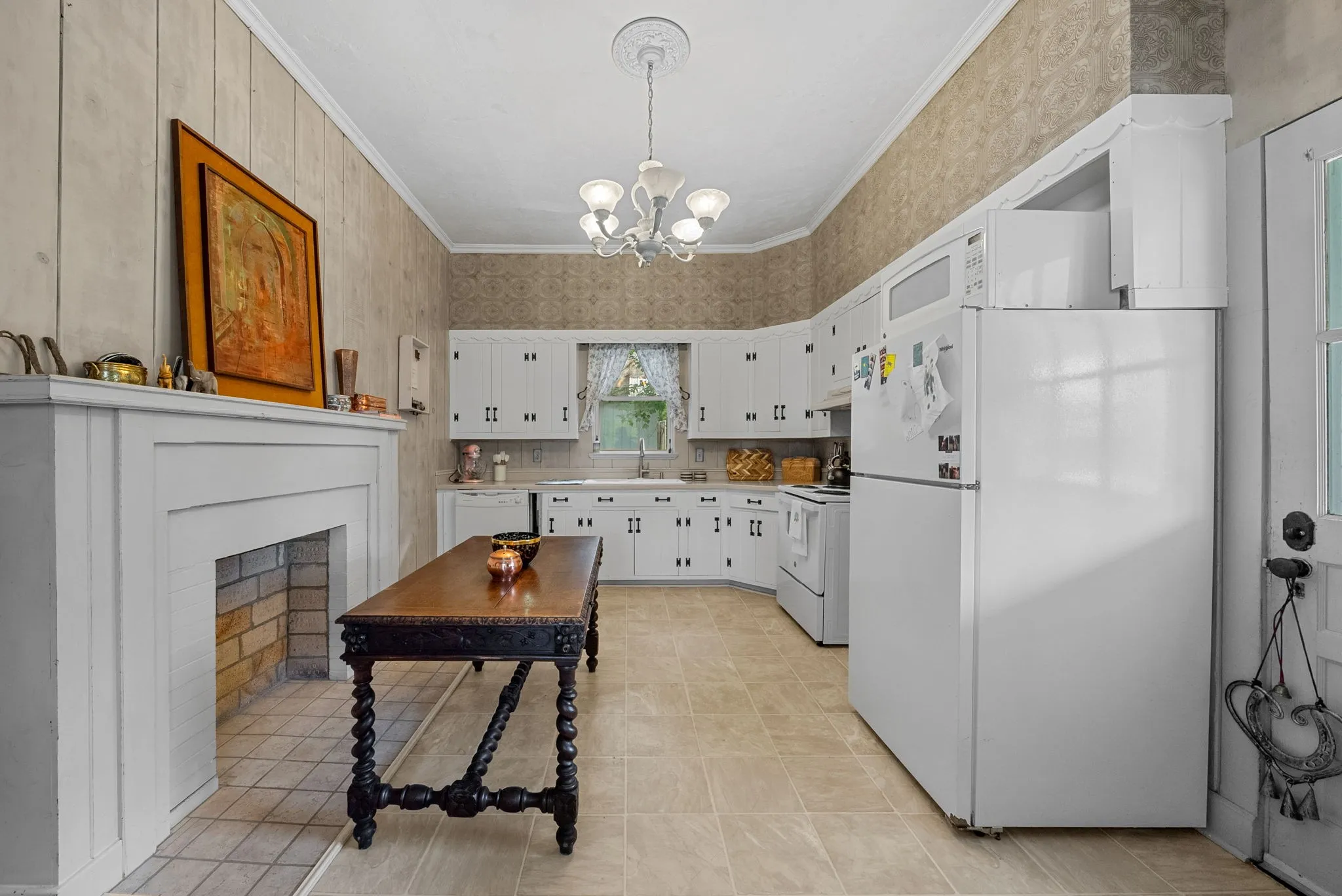 As you enter, you're greeted by a grand foyer leading to a living space adorned with intricate moldings, oversized windows, high ceilings and a cozy fireplace perfect for unwinding. The formal dining room is perfect for hosting dinner parties and family gatherings, offering an elegant space to entertain guests. The spacious kitchen is equipped with modern appliances including a range, refrigerator, and the convenience of a dishwasher.\n