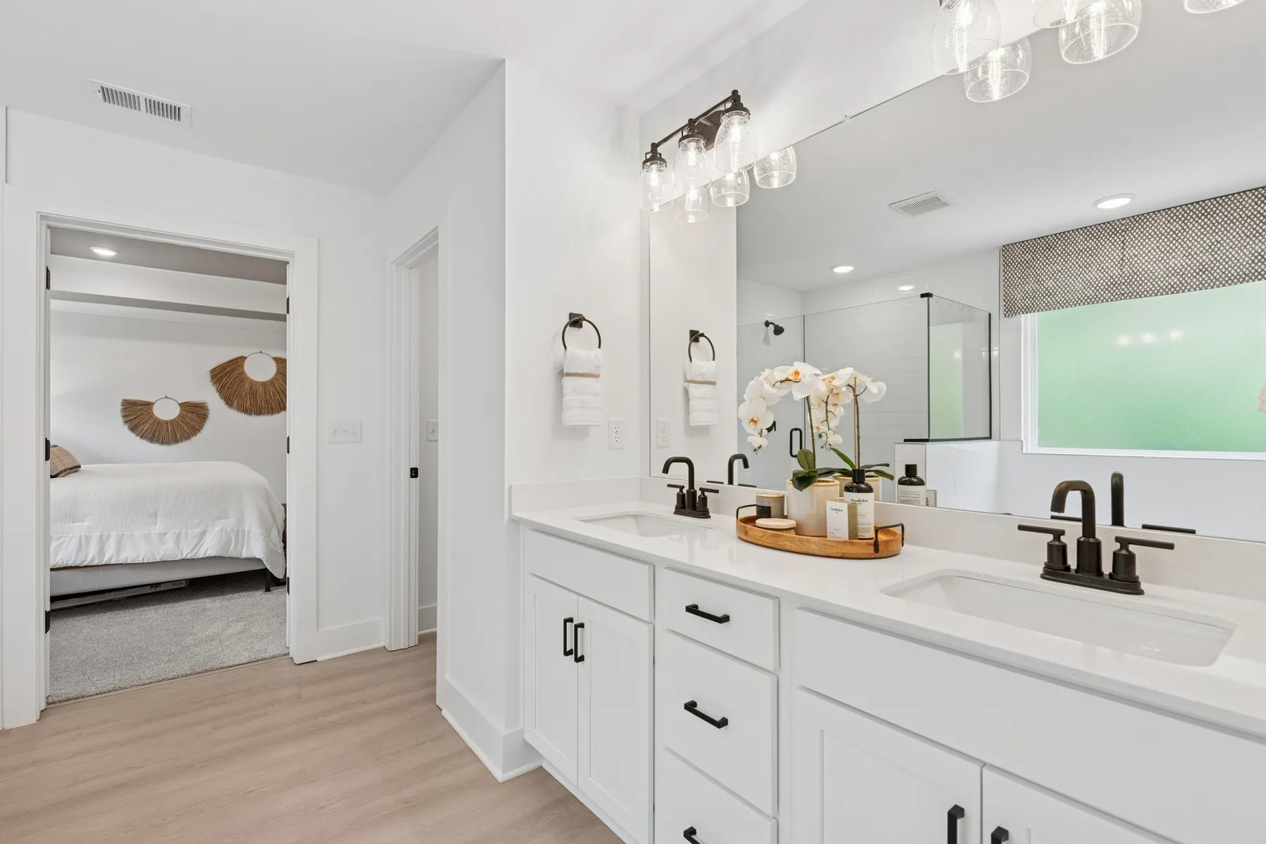 Upstairs, a central loft offers a second living space, surrounded by four additional bedrooms. The primary suite feels like a retreat with its tray ceiling, double-door entry, and spa-like bath leading to a walk-in closet big enough to stay organized with room to spare.