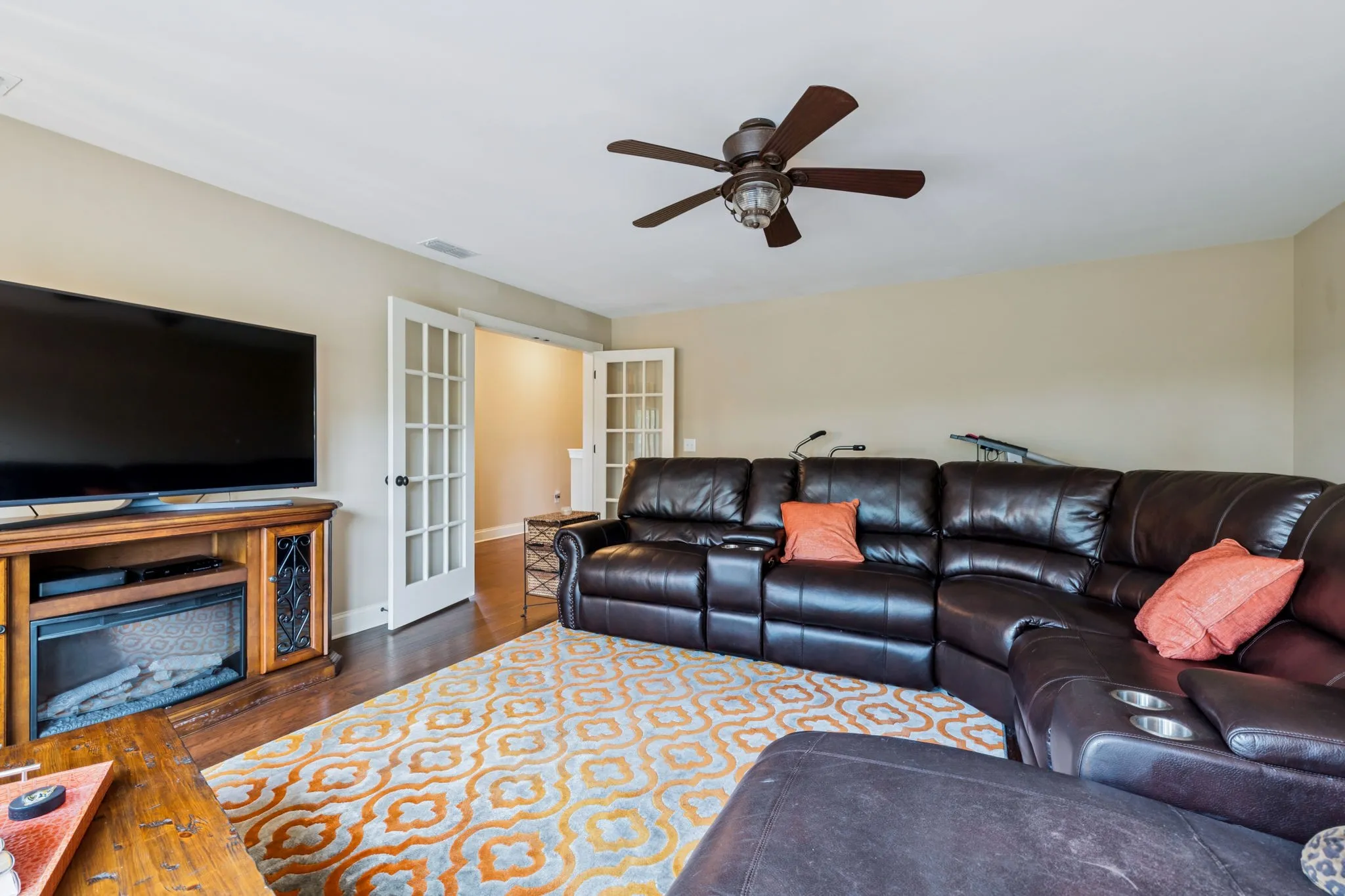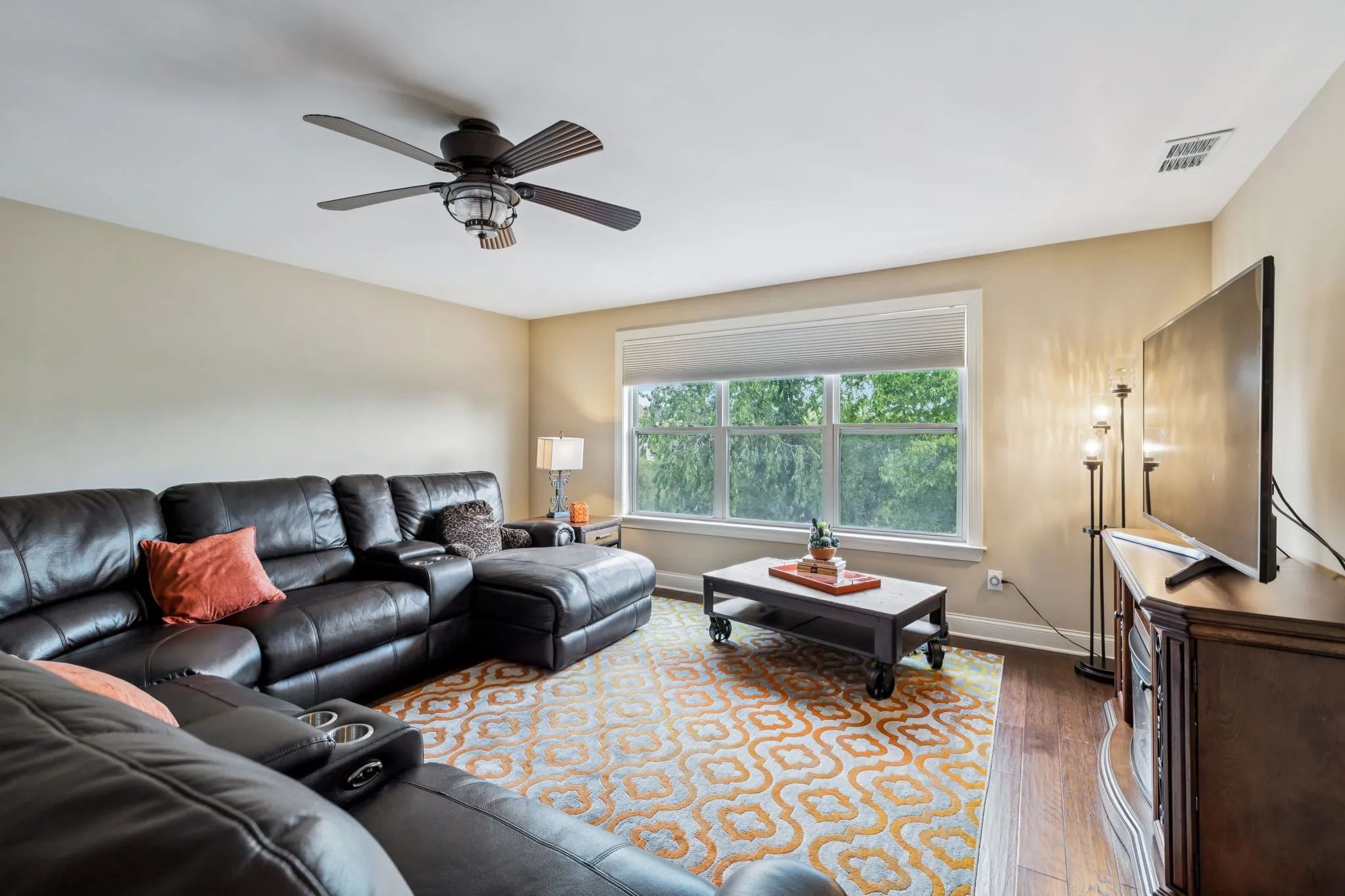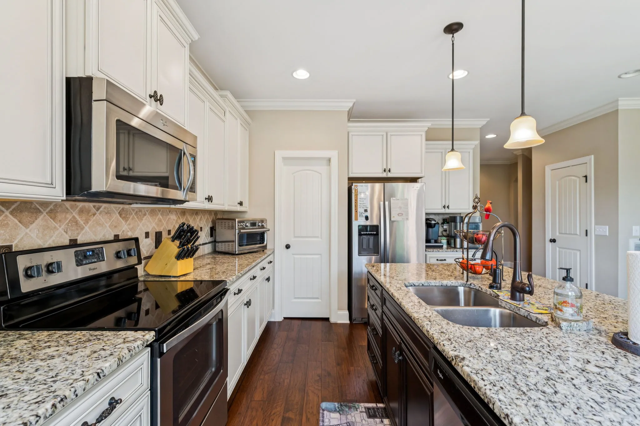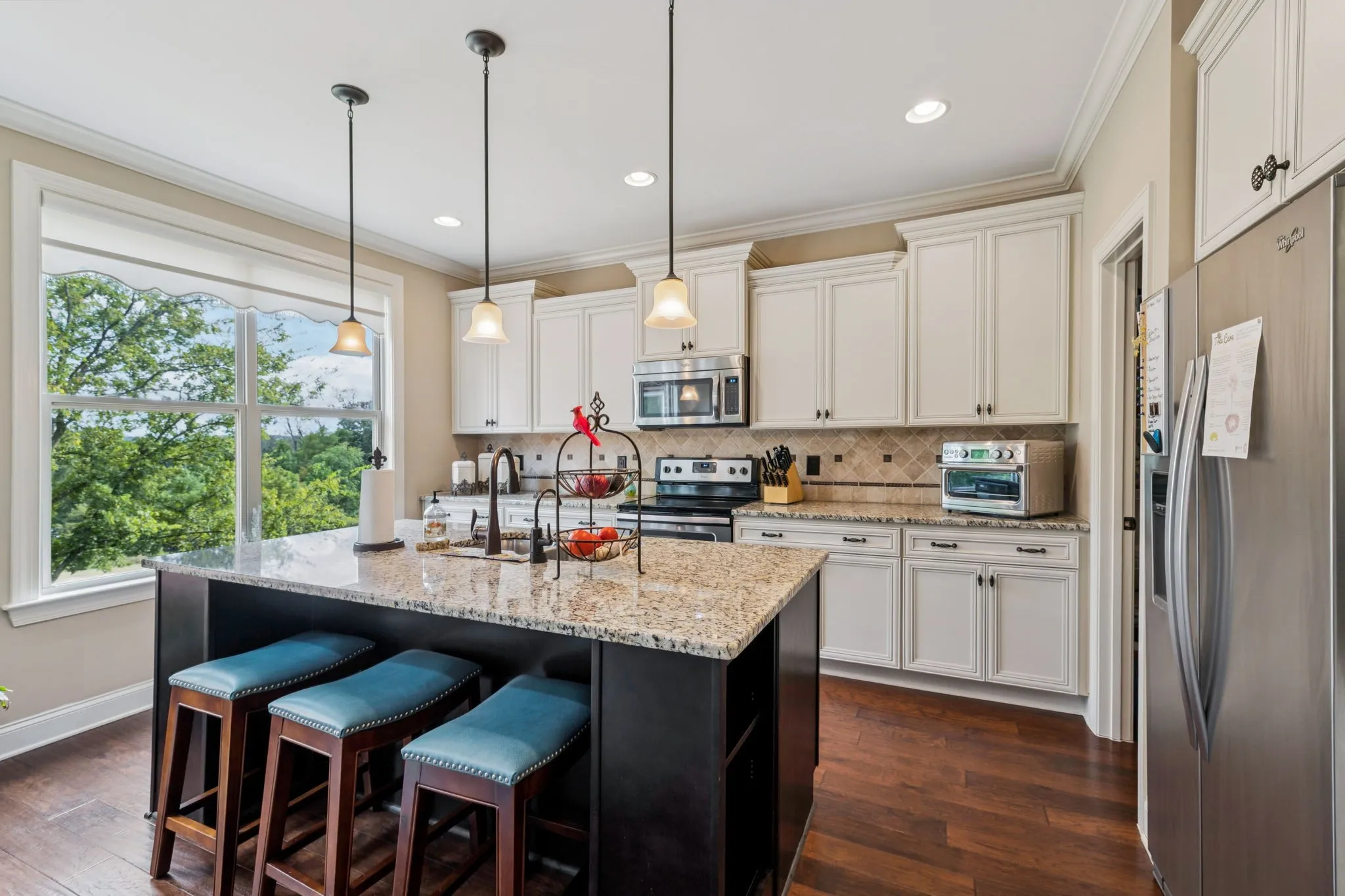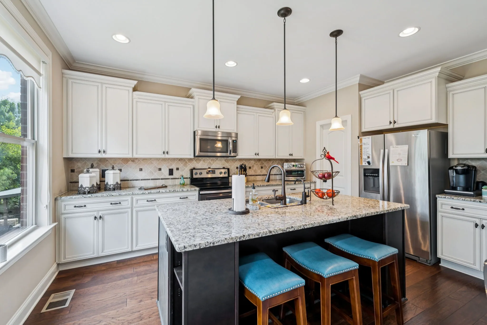 Inside, you’ll find spacious living areas filled with natural light, hardwood floors, and thoughtful upgrades including a whole home water filtration system. The heart of the home features an open-concept kitchen with granite countertops and stainless steel appliances, flowing seamlessly into the living and dining spaces. A large bonus/media room upstairs provides the perfect spot for movie nights, game days, or a cozy retreat.