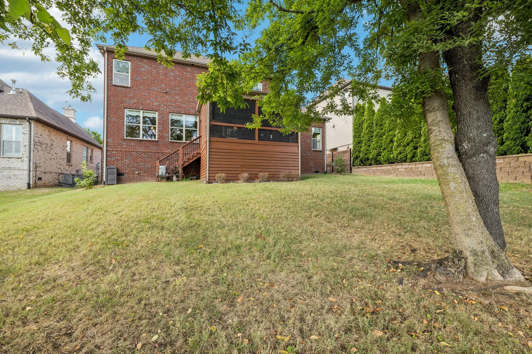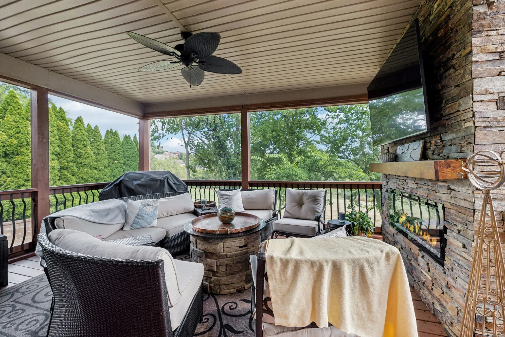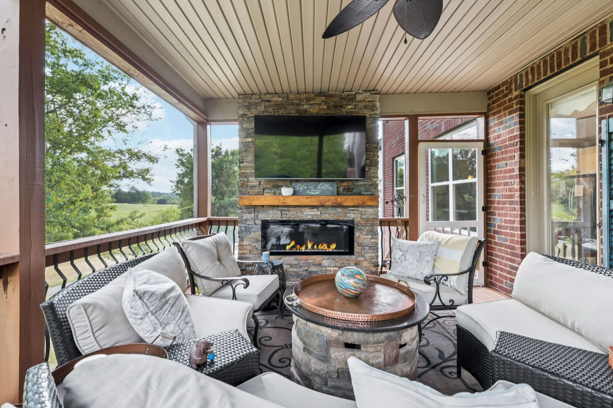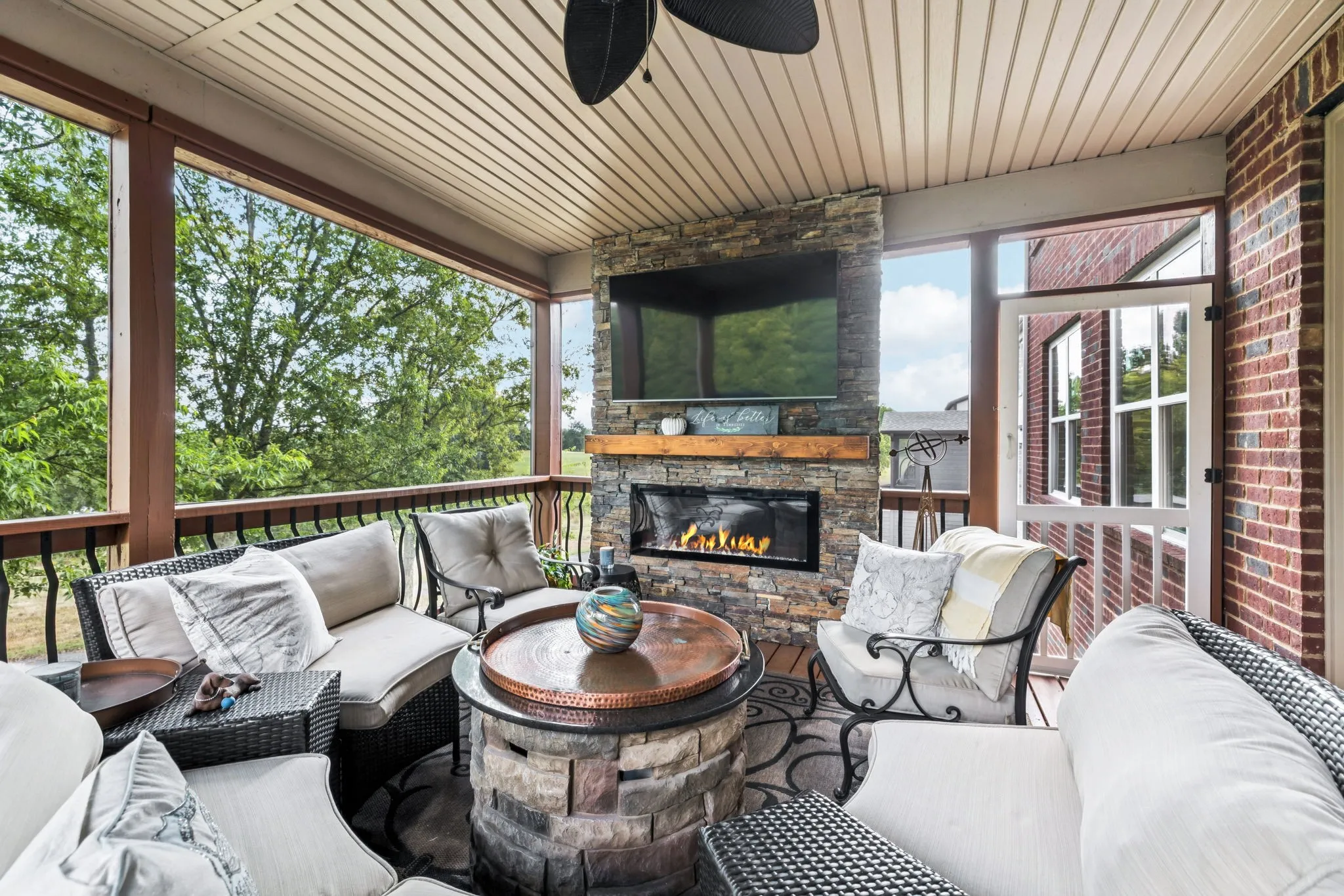 Step outside to a show-stopping screened porch with a floor-to-ceiling stone fireplace—ideal for entertaining year-round or simply relaxing while overlooking the green space beyond.