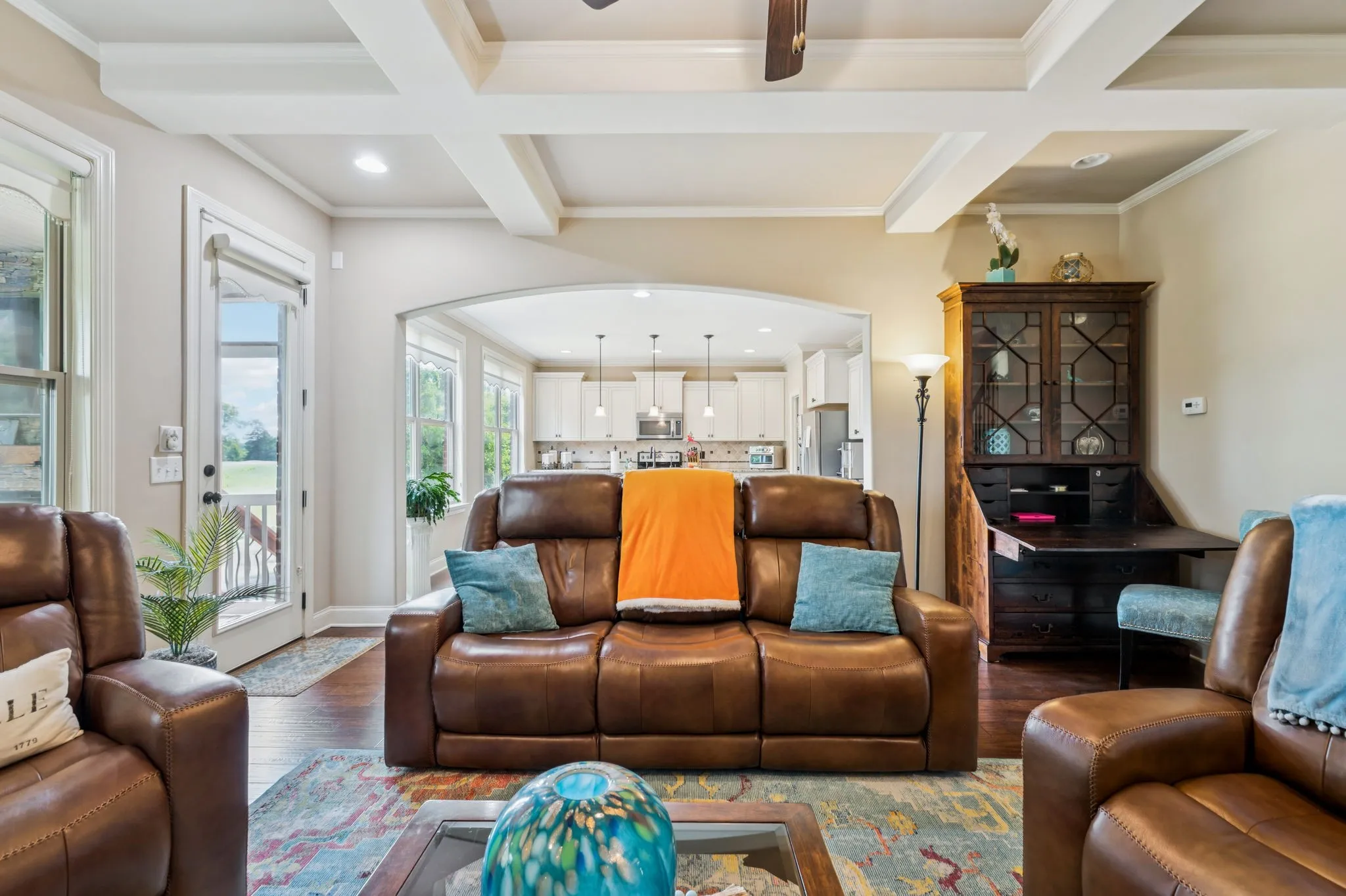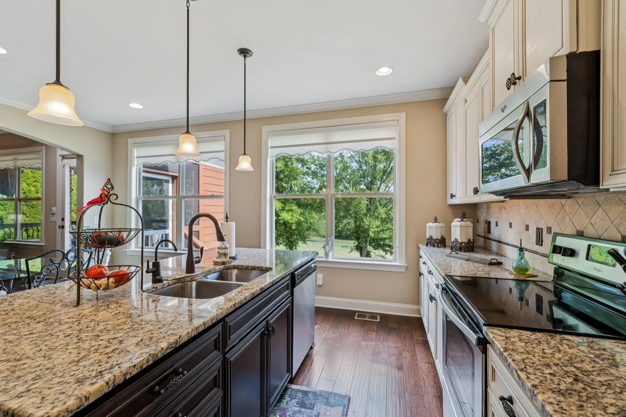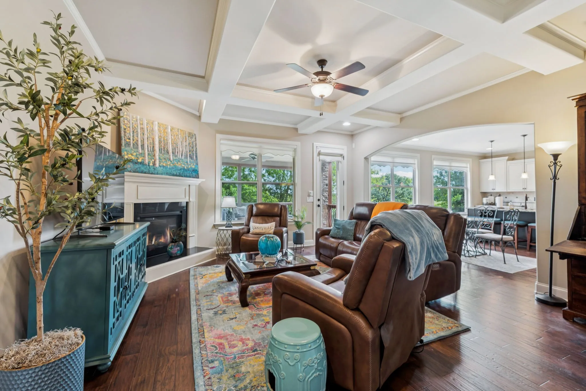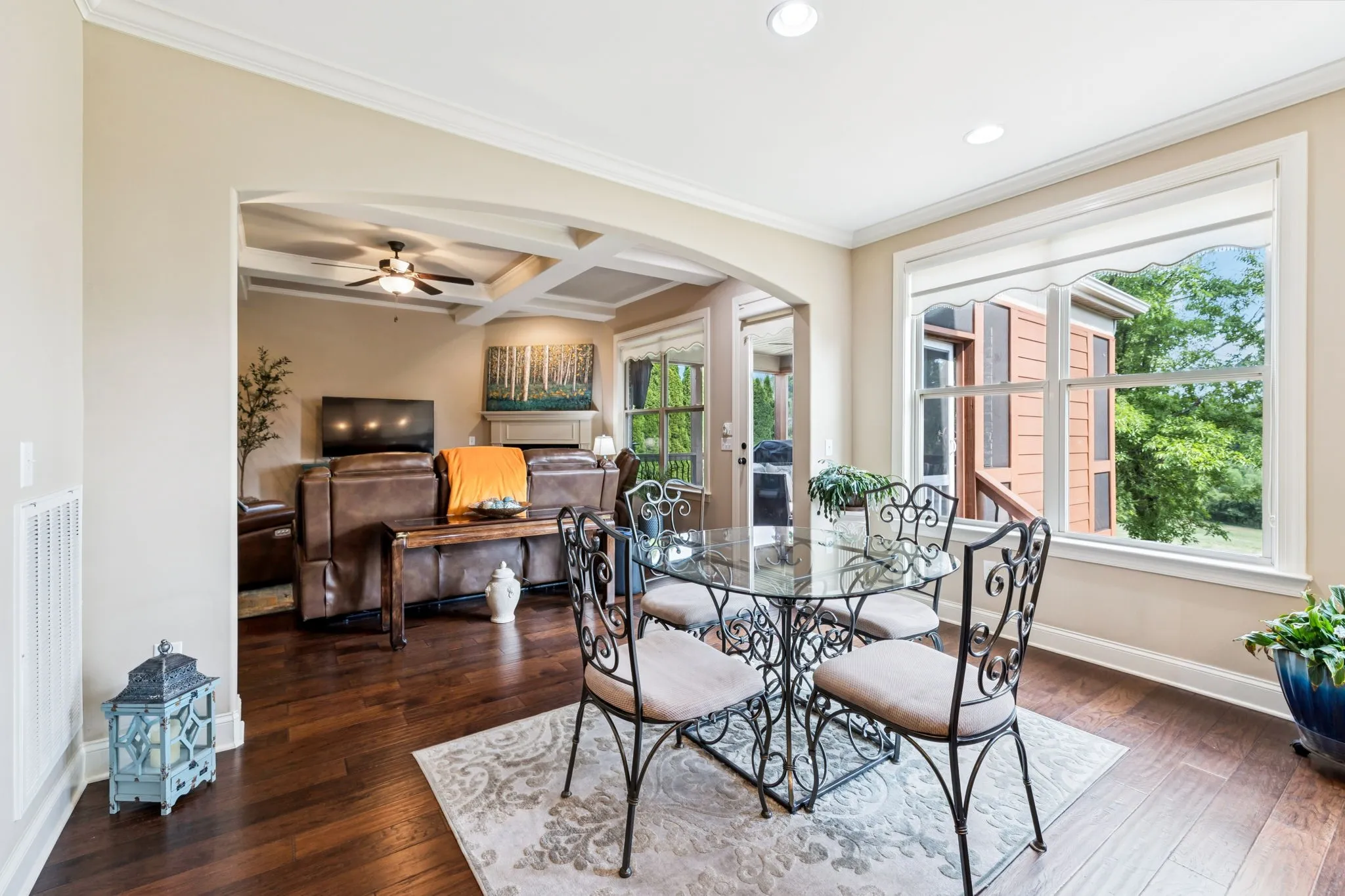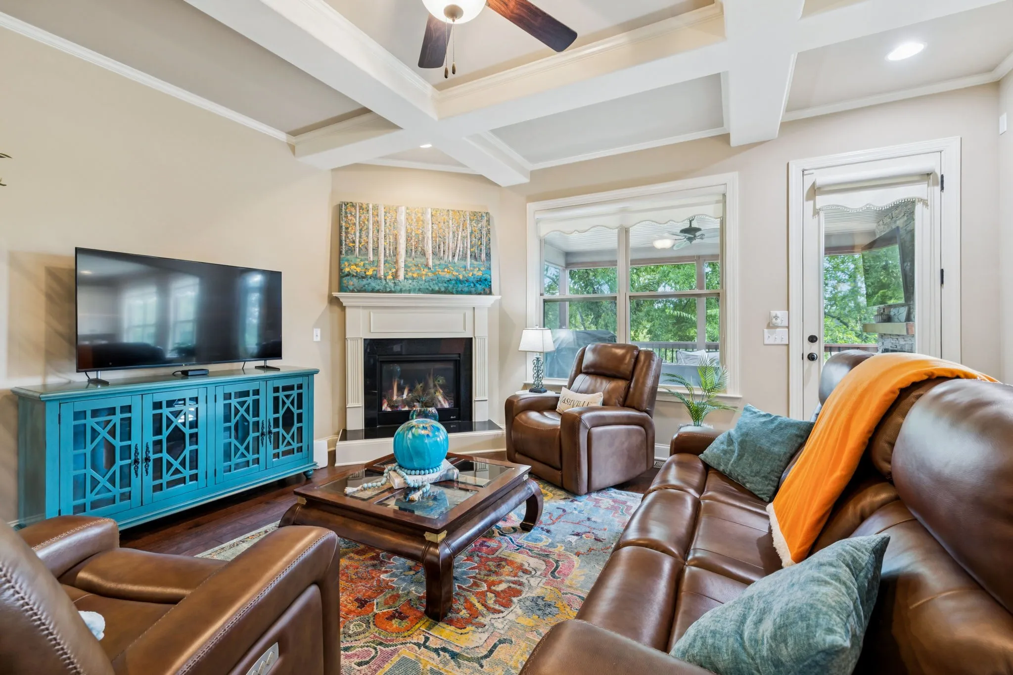 Step outside to a show-stopping screened porch with a floor-to-ceiling stone fireplace—ideal for entertaining year-round or simply relaxing while overlooking the green space beyond.
