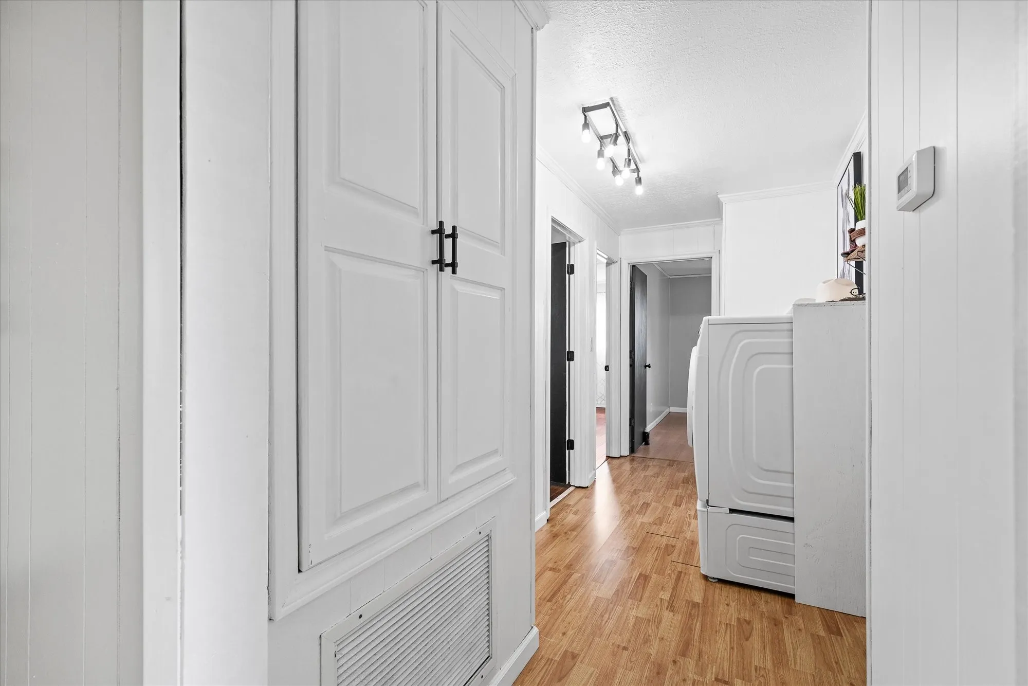 Recent updates include new laminate flooring, updated bathrooms, updated kitchen with all appliances two years old, new light fixtures, fresh paint, and a new gas water heater was installed in June 2022. Acreage has been surveyed. Dual hook up for dryer, so choice of gas or electric.
