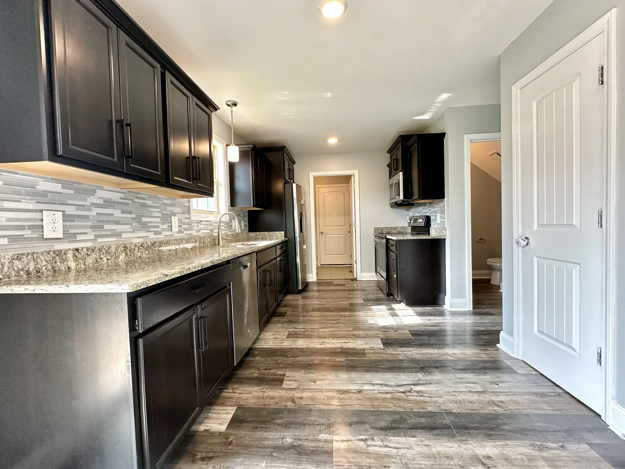 Step inside to a bright, inviting living room and a convenient half bath. The open dining area flows seamlessly to the back deck, making it ideal for entertaining or relaxing. The kitchen is a true standout, featuring stainless steel appliances, a pantry for extra storage, and direct access to the one-car garage for everyday ease.