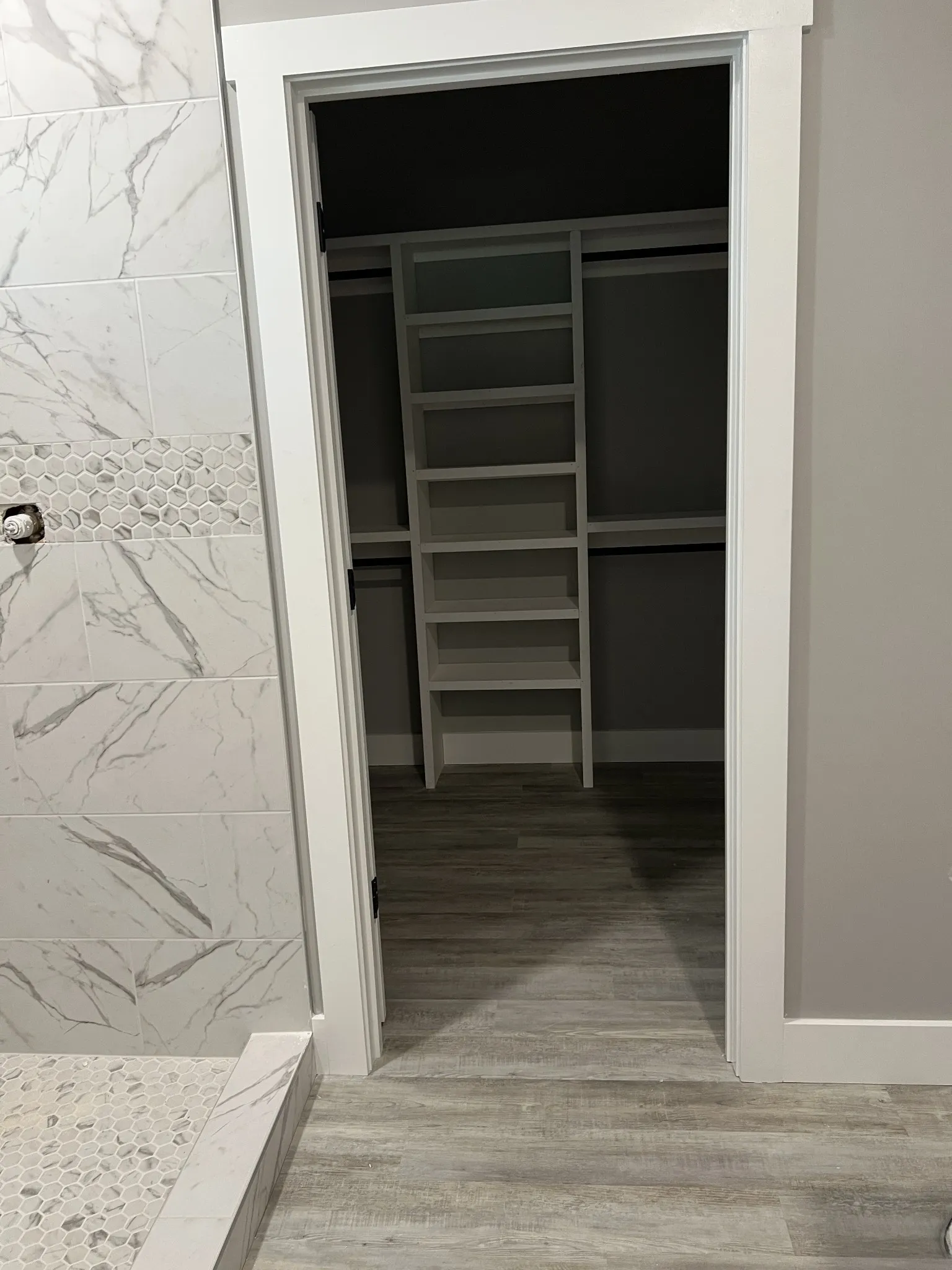 Currently under construction, this property showcases high-quality finishes, including a stylish tiled bathroom with marble walls and a contemporary front door with glass panels. The exterior boasts a charming stone accent and metal siding, complemented by a covered porch ideal for enjoying the surrounding wooded landscape. Inside, the home includes ample cabinetry and a well-planned layout, perfect for family living or entertaining guests.