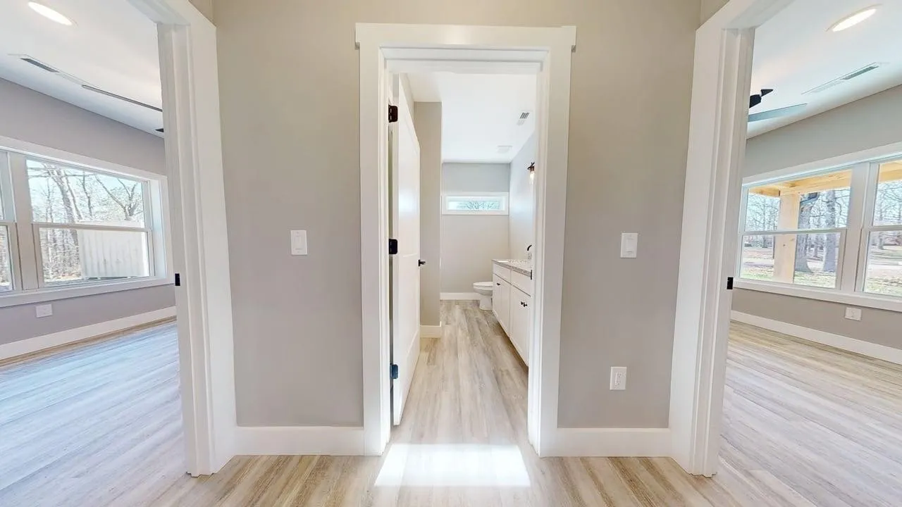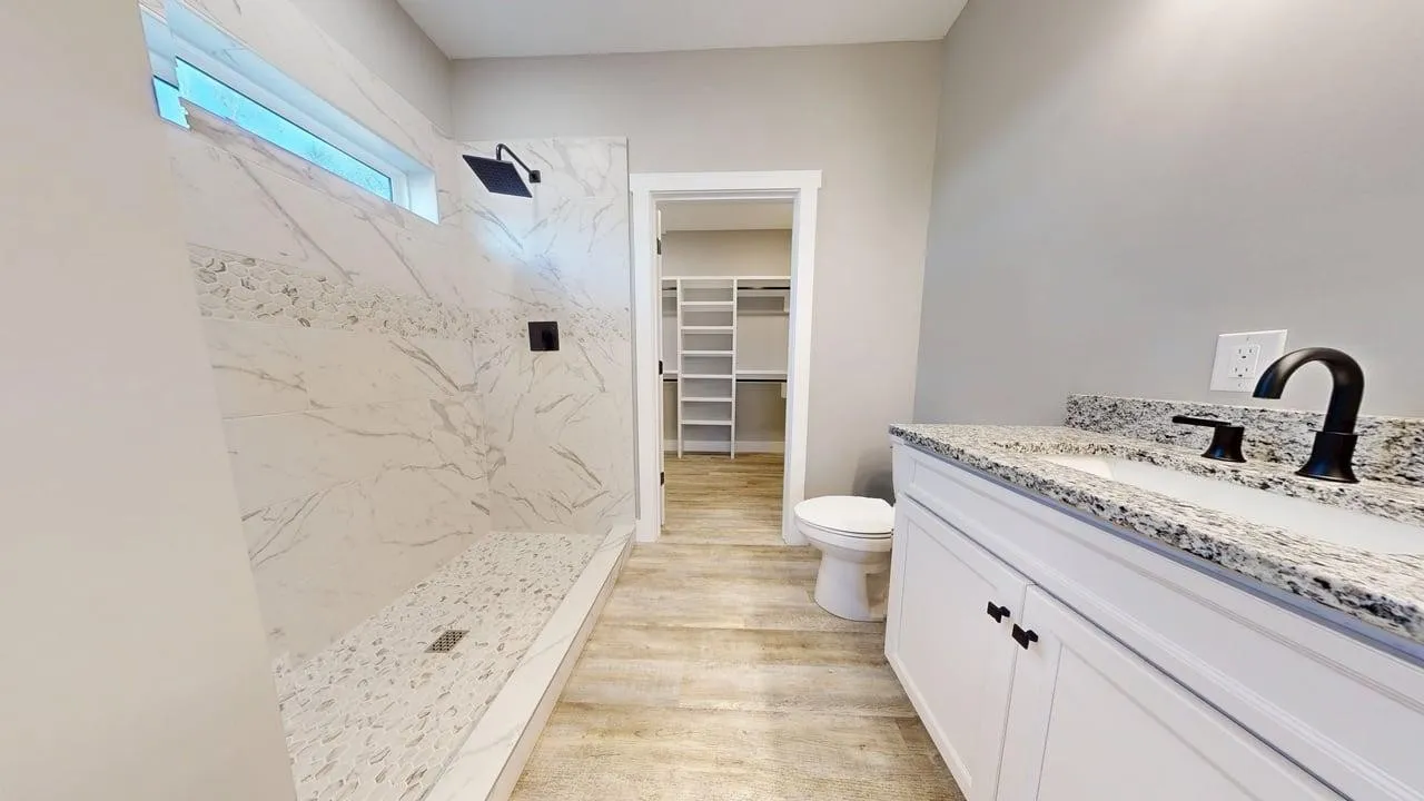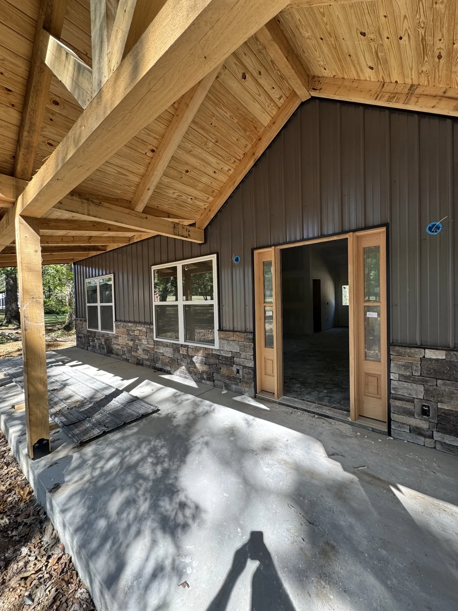This property showcases high-quality finishes, including a stylish tiled bathroom with marble walls and a contemporary front door with glass panels. The exterior boasts a charming stone accent and metal siding, complemented by a covered porch ideal for enjoying the surrounding wooded landscape. Inside, the home includes ample cabinetry and a well-planned layout, perfect for family living or entertaining guests.
