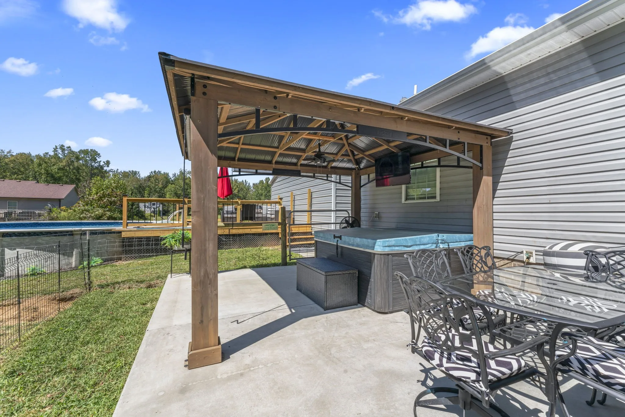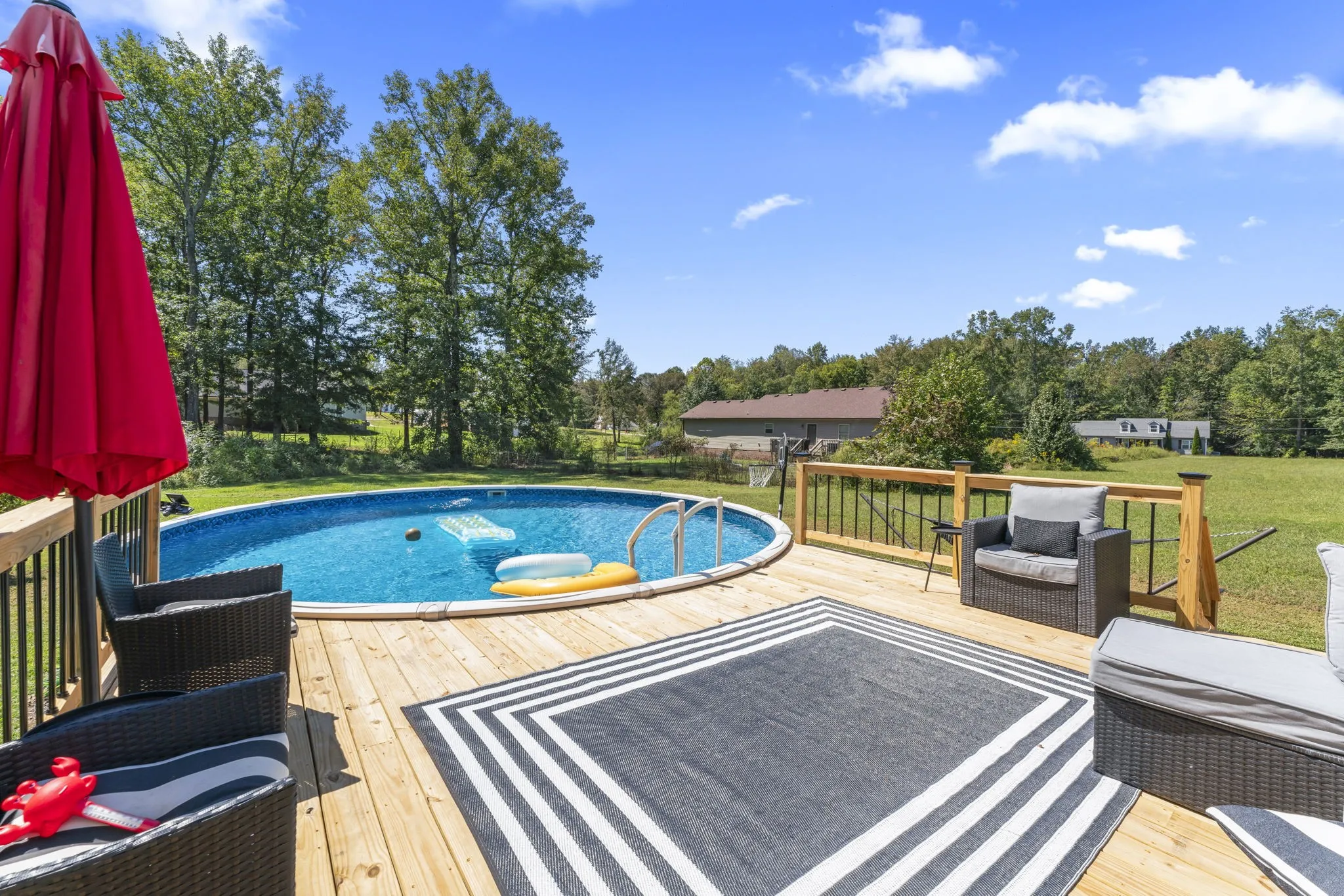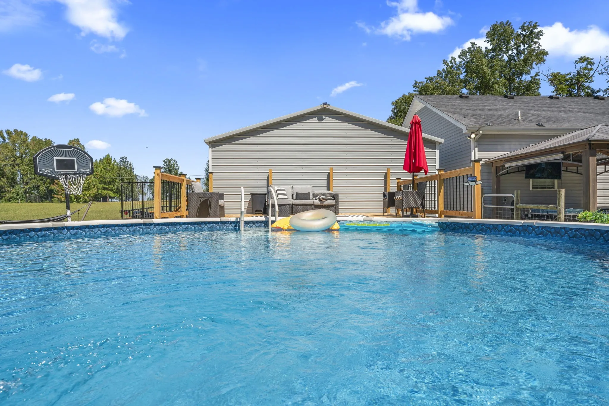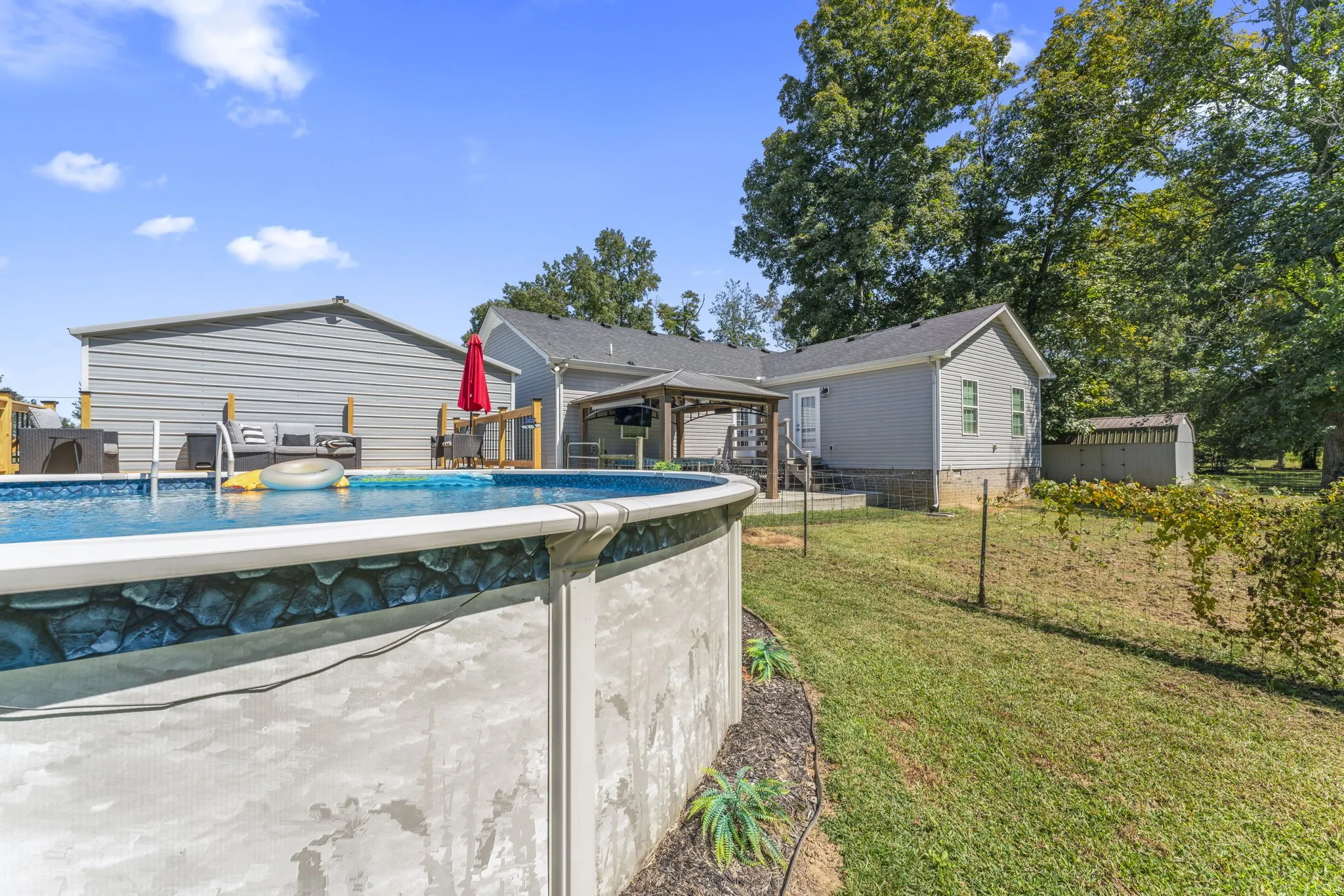 Preferred Lender will give up to 1% of the loan amount towards closing costs! Enjoy the best of rural living in this spacious home featuring engineered hardwood floors throughout the main living areas and bedrooms, with tile accents in the bathrooms and pantry/laundry room combo. The heart of the home includes a massive rec room, perfect for entertaining or relaxing. The large master suite offers a retreat of its own, with a bathroom boasting double vanities, a custom tile shower, and a separate soaking tub. Step outside to your private backyard oasis, complete with a gazebo, high quality deck leading to a pool, and fenced space ideal for pets or gardening. A 24×24 detached garage with 220v electric provides ample room for storage, hobbies, or a workshop. Set in a peaceful rural subdivision, this property blends comfort, space, and country charm, just waiting for you to call it home! Refrigerator and mini barn to remain with property. Hot tub does not remain. Septic was pumped within the last year.