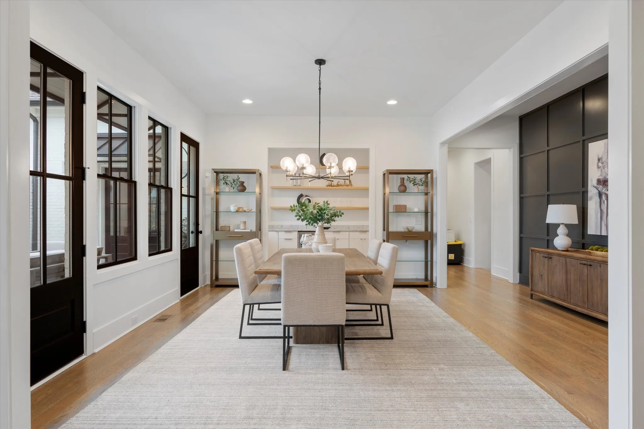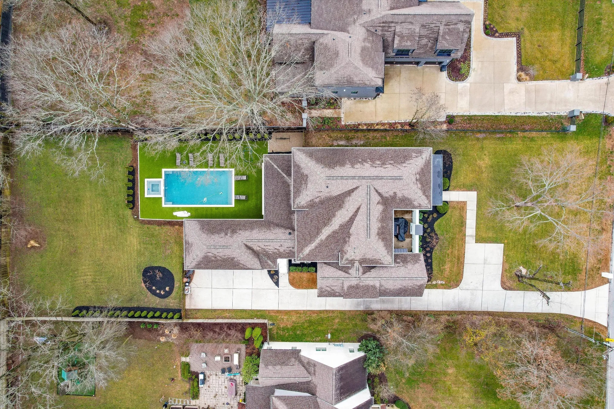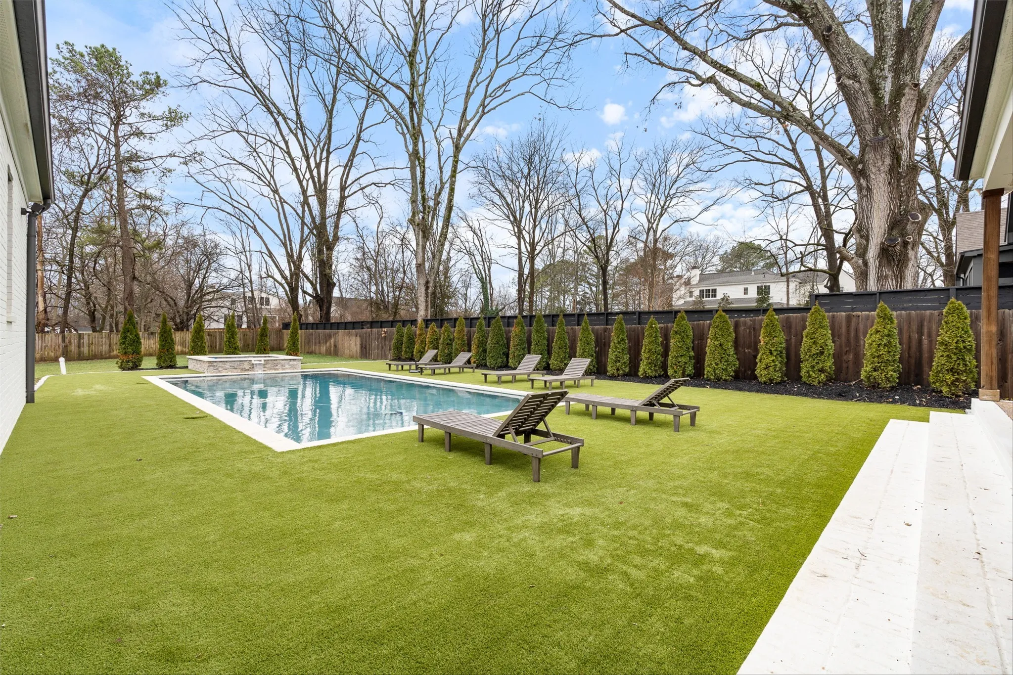 Welcome to this breathtaking luxury residence in the prestigious Oak Hill neighborhood, where sophistication and style meet comfort and privacy. This stunning home boasts a seamless blend of elegant finishes and modern design, creating an inviting atmosphere throughout. The open floor plan flows effortlessly, with gleaming hardwood floors, custom millwork, and oversized windows that frame the beautiful surroundings. The chef’s kitchen is a culinary dream, complete with top-of-the-line appliances, custom cabinetry, a large central island, and sleek quartz countertops. Whether preparing a casual meal or hosting a dinner party, the kitchen opens seamlessly to the dining and living areas, making entertaining a breeze. The primary suite offers a serene retreat, complete with a luxurious en-suite bathroom featuring a soaking tub, glass-enclosed shower, dual vanities, and an expansive walk-in closet. Five additional generously sized bedrooms each offer their own en-suite bath, providing ultimate comfort and privacy for family and guests. Dedicated laundry spaces on both floors add to this home's functionality. Step outside to your private sanctuary. A tranquil, secluded courtyard offers the perfect setting for quiet moments or gatherings with loved ones around the fire, while the backyard features a sparkling pool and relaxing spa with a turf surround, a beautifully landscaped, fenced-in yard—ideal for outdoor entertaining, play or enjoying peaceful moments in the sun. The expansive patio area is perfect for alfresco dining or lounging by the poolside.\n