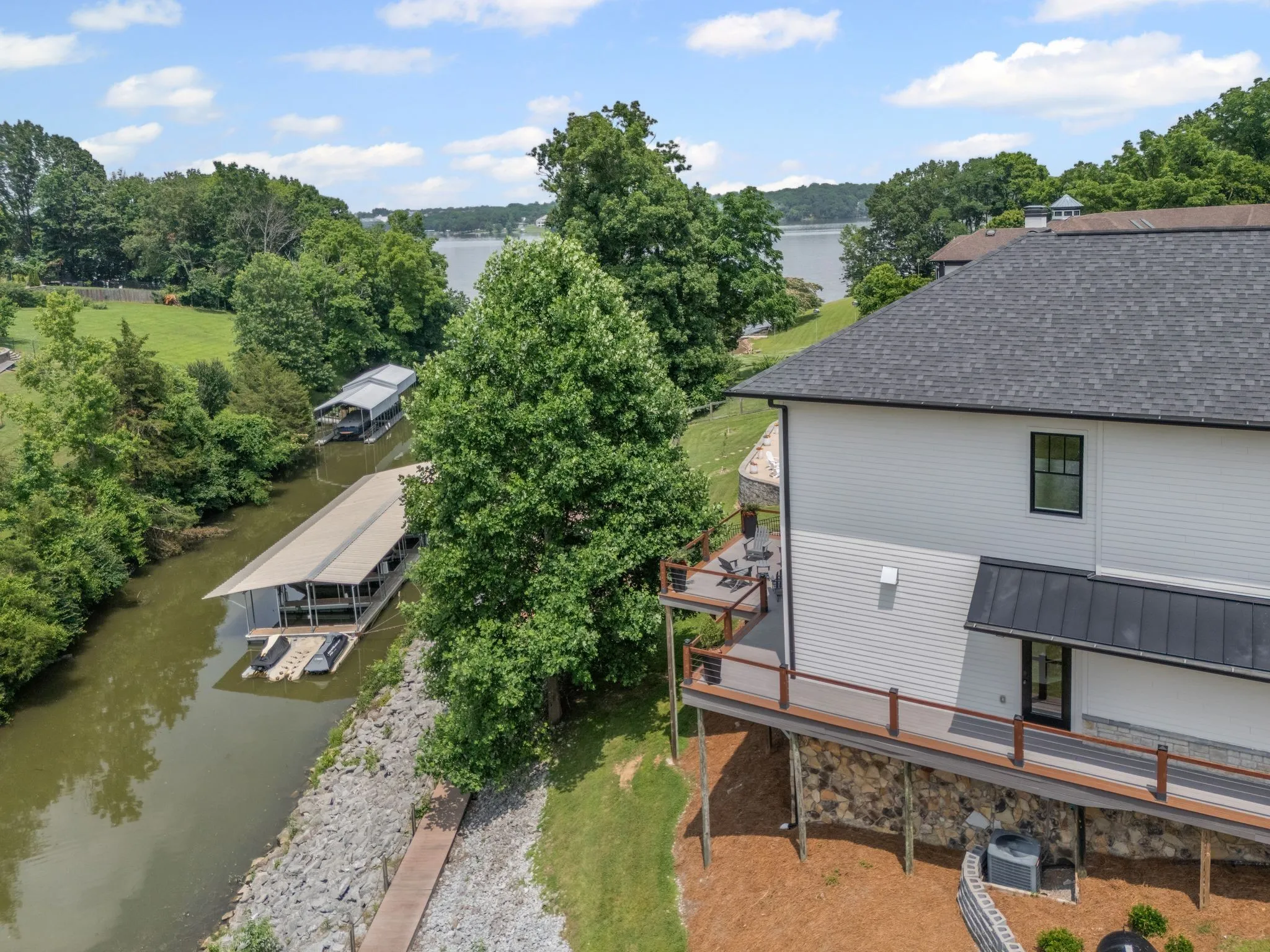 Welcome to your dream lake retreat! This stunning, fully remodeled lakefront home is the perfect blend of luxury, comfort, and lifestyle. Nestled in a peaceful cove, enjoy breathtaking water views from the expansive wrap-around deck—ideal for morning coffee, evening sunsets, or entertaining under the stars. A private staircase leads you down to the scenic community boardwalk, which winds along the shoreline and connects you to two deeded boat slips w/ power—just bring your water toys!