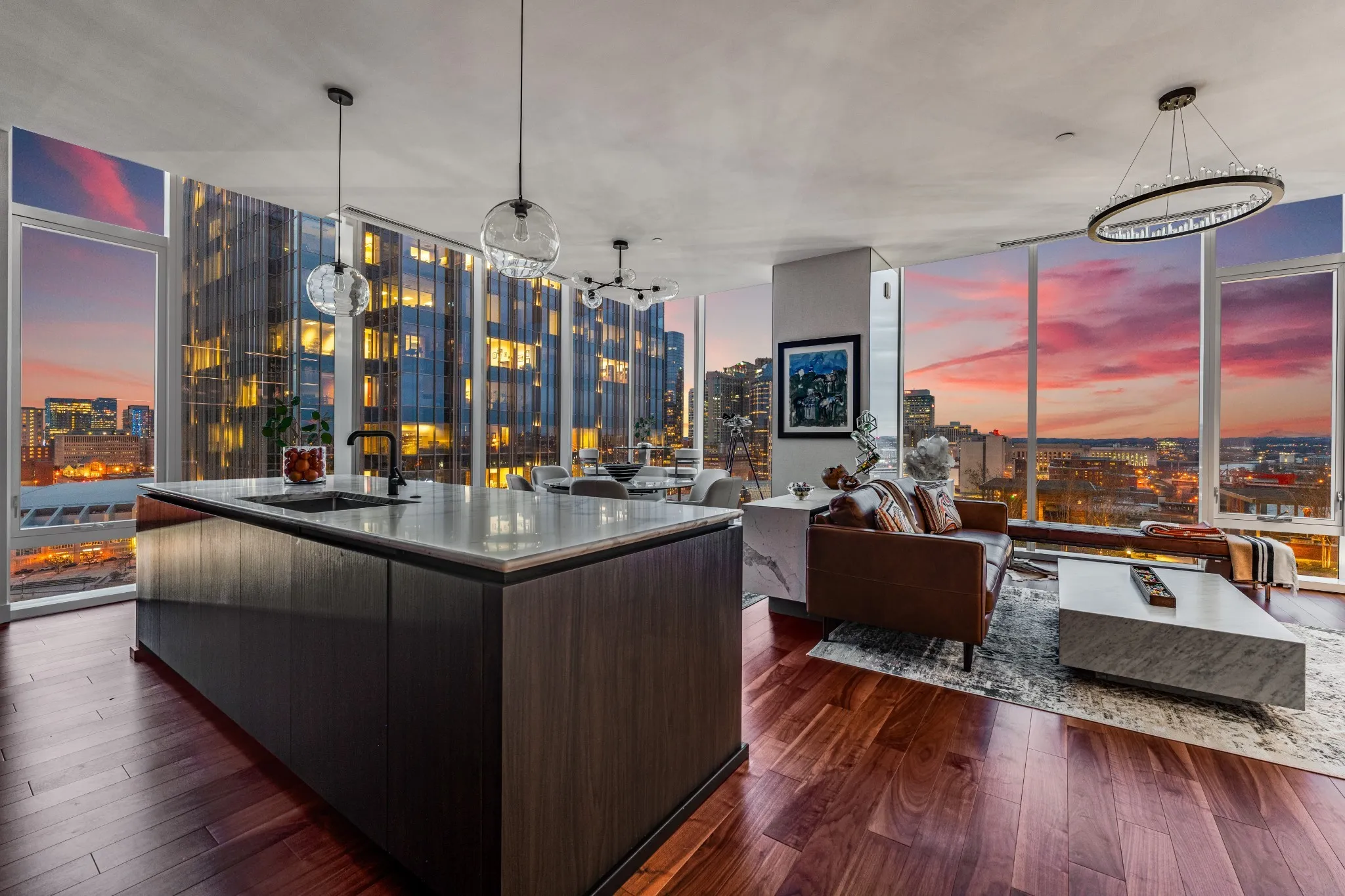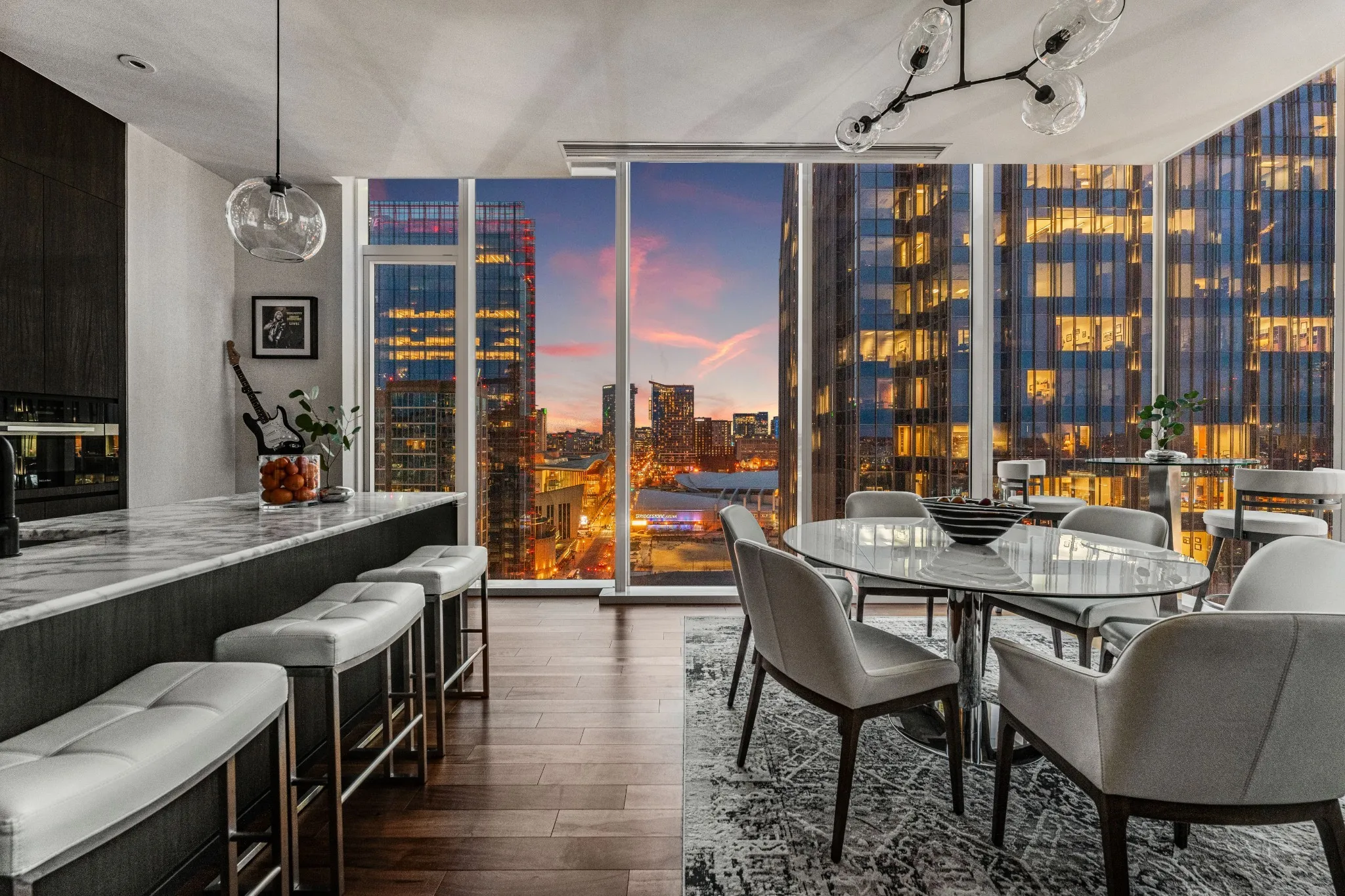 RARE Fabulous Corner Unit Sold Furnished!! Just bring your suitecases & pets! Walk right into Nashville’s finest Downtown Living Experience & the Social Hub of SoBro connecting you to the Creative Spirit of the City’s Artisans, Music, Sports & Entertainment. Floor-to-ceiling windows flood the rooms with natural light & breathtaking views of downtown Nashville’s vibrant scenes. Modern Living at its best with subtle design nods to Music City and no detail overlooked. Perfect for entertaining! The spacious living area is outfitted with lounge seating; an entertainment system including Bang & Olufsen Soundbars; Modern European & Restoration Hardware furniture including an expandable dining table (it’s a Danish marvel), pub table & island seating. All this Enriched by Pampered Luxury, Abundance of Amenities, Dedicated Concierge, Privacy, Valet Parking & Security. The World Renown Four Seasons Brand does not disappoint! Dare to “LIVE THE FOUR SEASONS LIFESTYLE” here and Around the World!