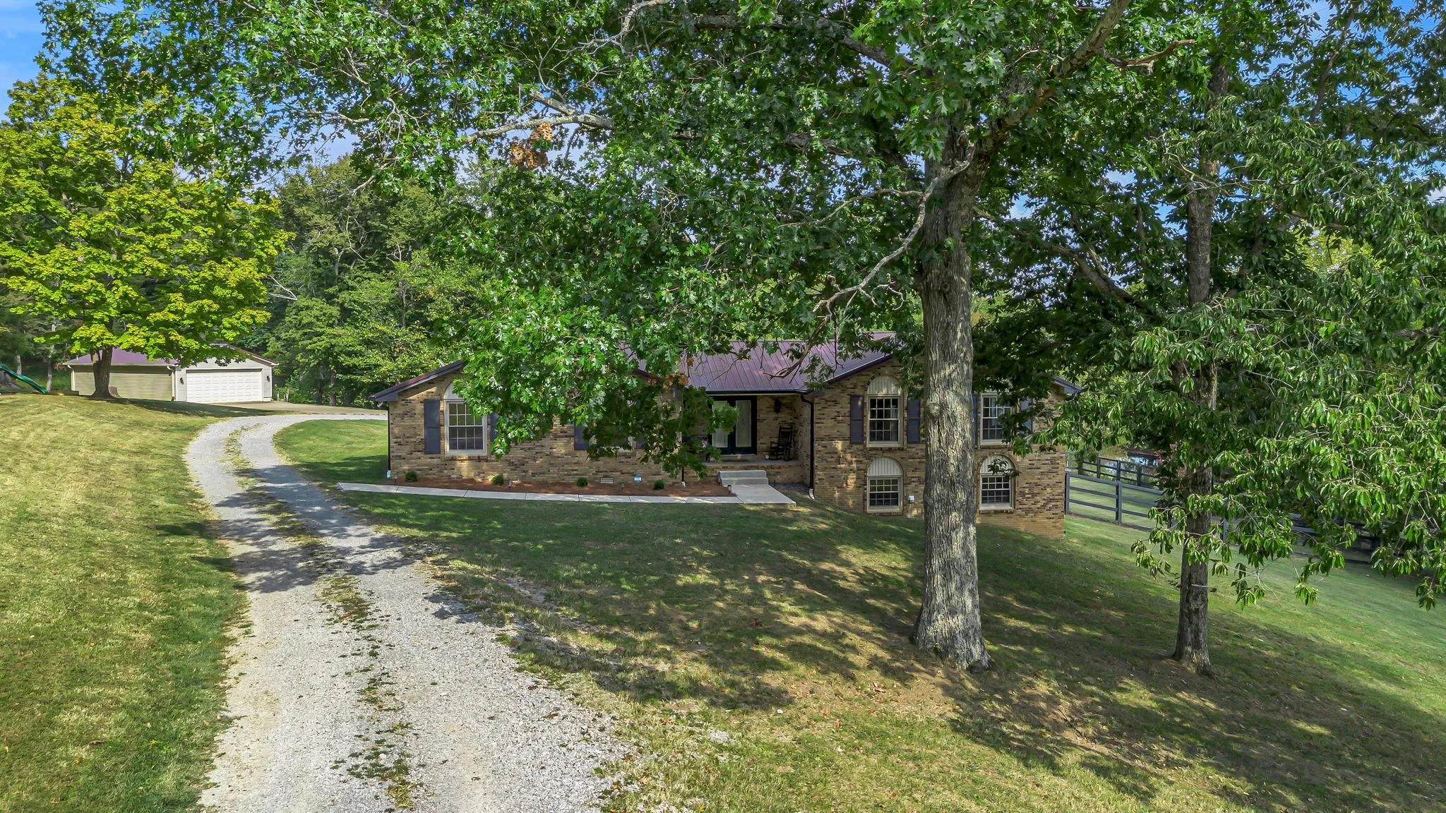 Discover country living at its finest in this beautifully renovated all-brick ranch with metal roof and unfinished basement, perfectly situated on 12.77 picturesque acres featuring a serene pond and a detached shop with a half bath. Stylish LVP flooring runs throughout, blending modern updates with timeless charm. The gourmet kitchen impresses with abundant cabinetry, stainless steel appliances, a tile backsplash, a convenient pot filler, and deep drawers for easy storage—ideal for any home chef. A bright dining area flows seamlessly into the spacious great room filled with natural light and anchored by a corner electric fireplace. The separate den, with its vaulted ceilings, exposed wood beams, and wood-burning stove, creates a warm retreat for cozy fall evenings. The primary suite feels like a private spa with its oversized walk-in shower and expansive custom closet with built-ins. Secondary bedrooms are generously sized with ample closet space. Outdoors, a Trex deck and pergola overlook stunning wooded countryside—perfect for entertaining or unwinding. The oversized 2-car basement garage offers parking, storage, or future expansion potential. Tucked among the trees, a charming cabin makes a perfect playhouse or retreat. There’s plenty of room to roam, hunt, or even build an additional residence—soil testing for a second 4 bedroom site has already been completed. Please note: the front 2 acres prior to the home are not included in the sale. Deed restrictions are attached to the listing. Crawl space area is also encapsulated! Enjoy the feel of a mountain getaway—like Gatlinburg—while being just 7–8 minutes from shopping, dining, and the interstate, and only 15 minutes to downtown Nashville!
