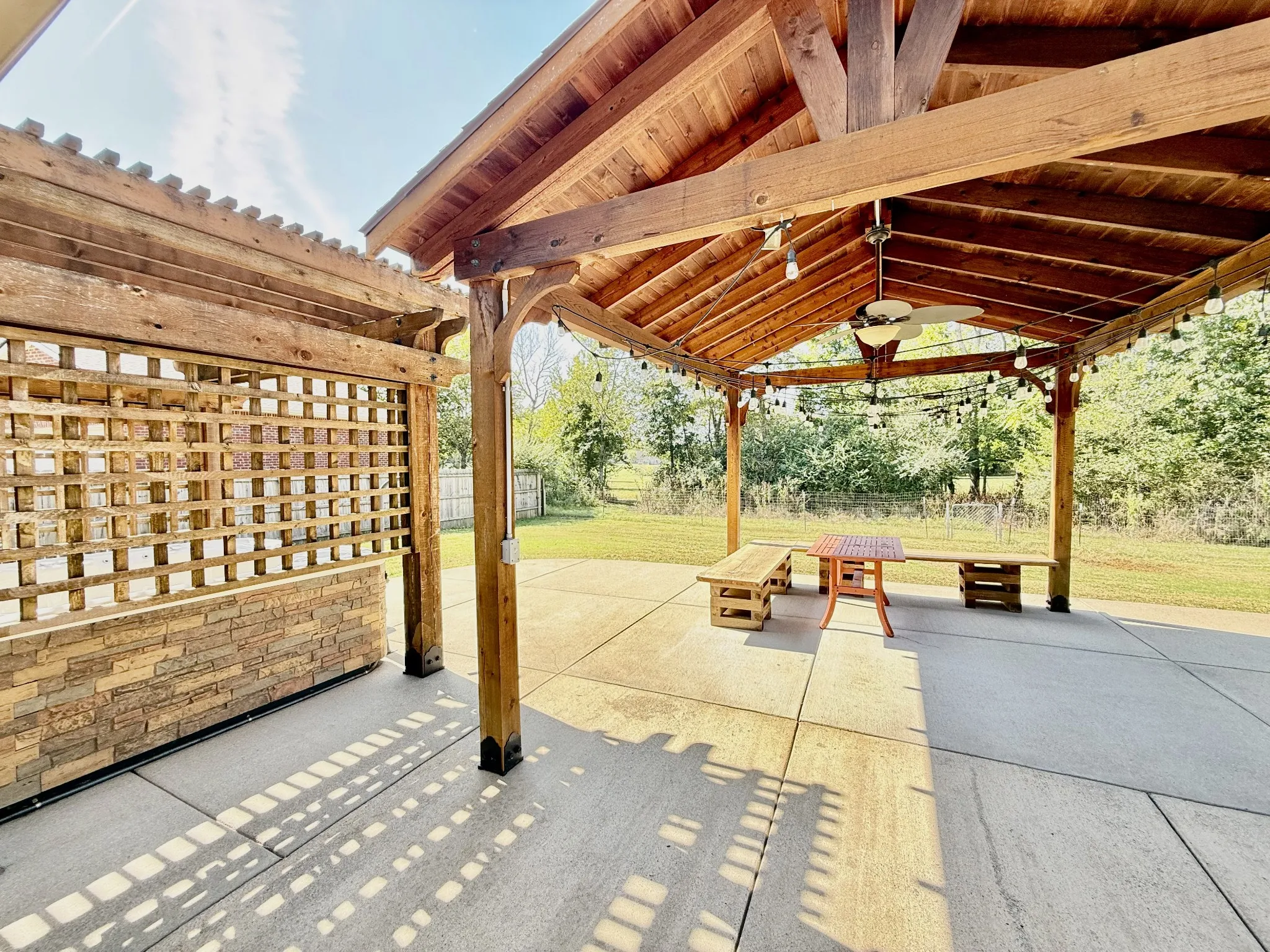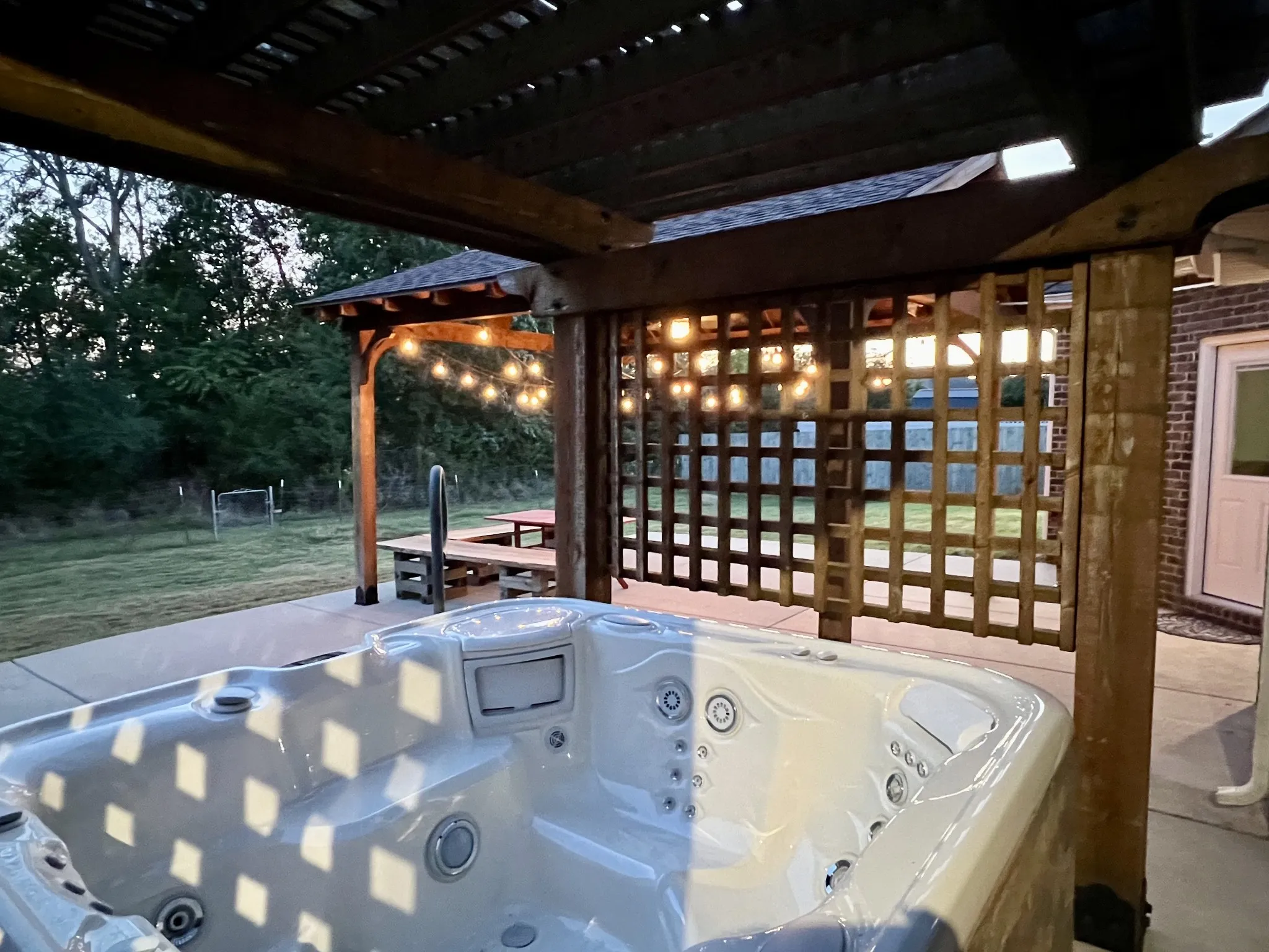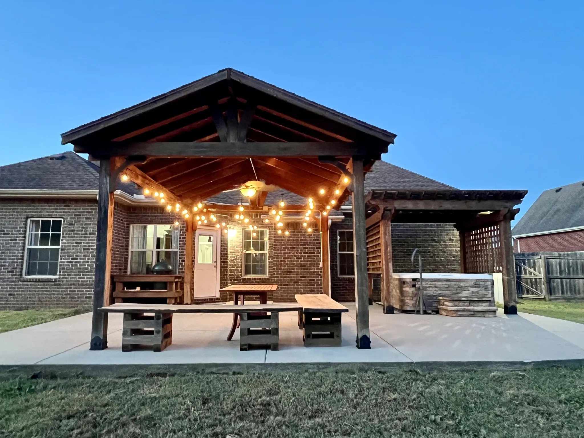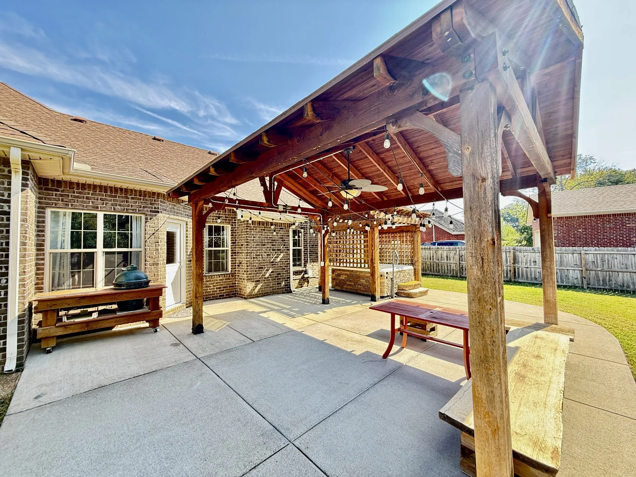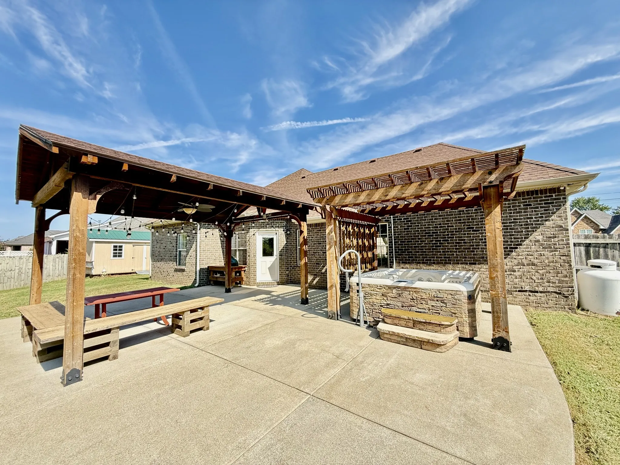 Welcome Home To Cascade Falls! This All-Brick 3 Bedroom, 2 Bath Home Offers An Open Floor Plan With Hardwood Floors, Custom Trim, And Tile In Wet Areas. The Living Area Features A Fireplace And Coffered Ceilings, Flowing Into A Granite Kitchen With A Double Oven. All Appliances Remain—Including The Lg Refrigerator, Whirlpool Stove, Whirlpool Dishwasher, And Lg Washer & Dryer. The Spacious Primary Suite Includes A Soaking Tub, Tiled Shower, Dual Vanities, And Walk-In Closet. – Upstairs, A Large Bonus Room With Built-In Shelving Makes The Perfect Media Or Playroom. The Garage Is Finished With Epoxy Floors, Suspended Shelving, And Workbench. Step Outside To Your Private Backyard Retreat—Complete With A Covered Pavilion, Pergola, Hot Tub, And An Extended Reinforced Patio. The Large Fenced Yard Backs Up To Trees For Extra Privacy And Storage Building. – Additional Highlights: Attic Storage, Extended Driveway, And Thoughtful Upgrades Throughout. This Home Combines Comfort, Space, And An Entertainer’s Dream Outdoor Living Area!