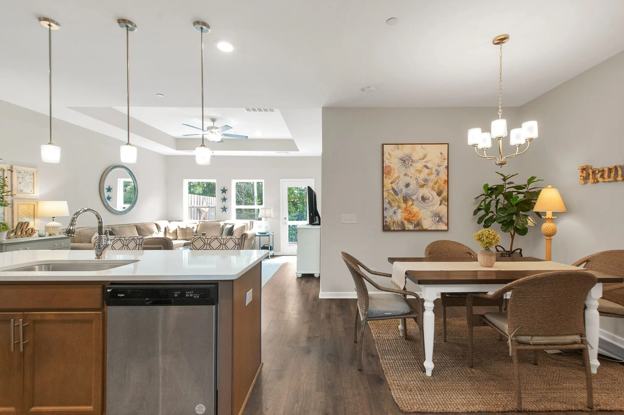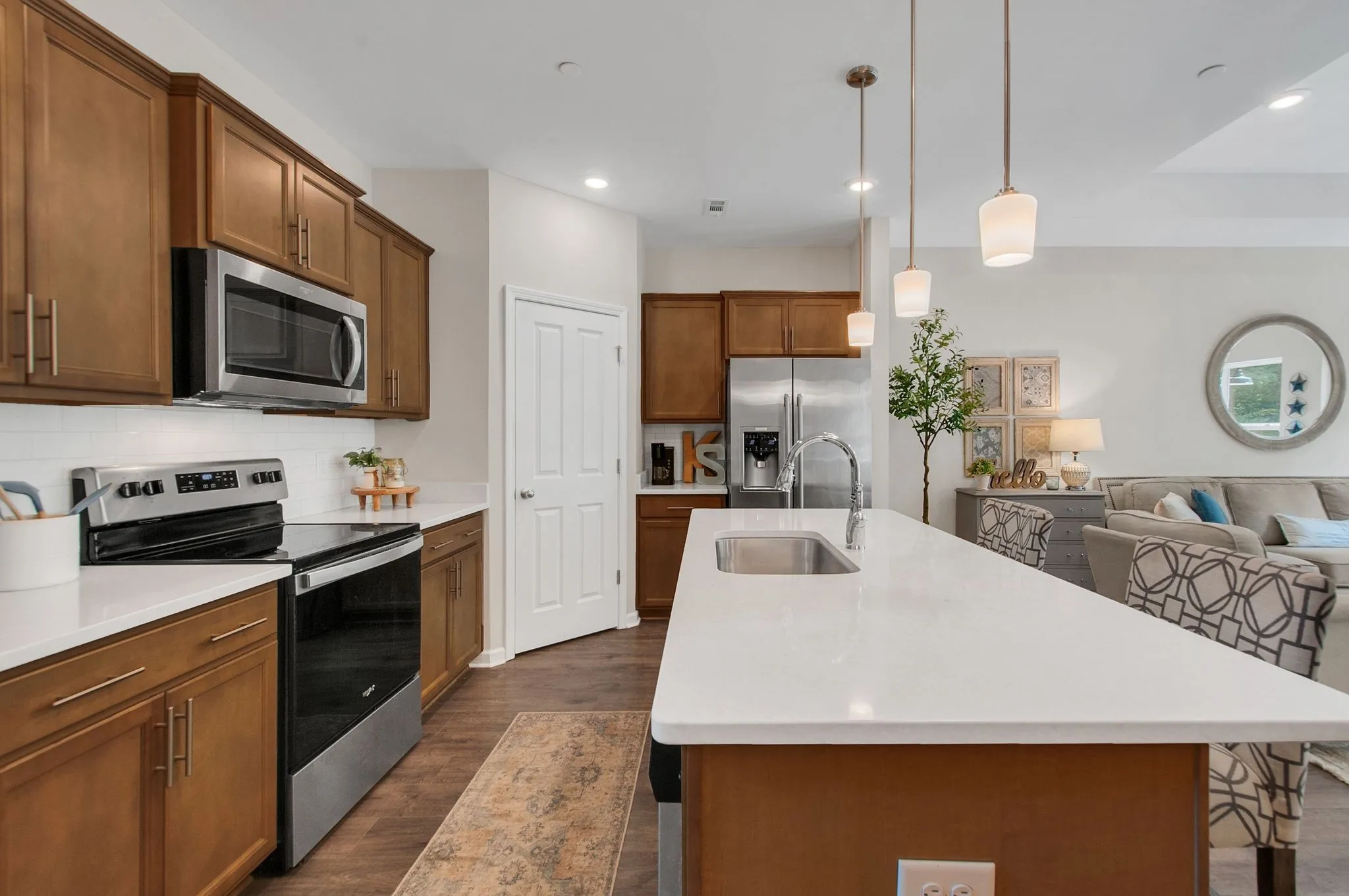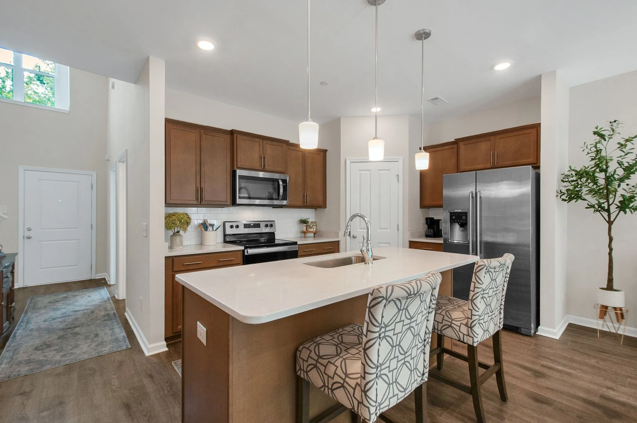 Upon entry, guests are greeted by an open-concept floor plan designed for seamless living and effortless entertaining. The main level features a sophisticated kitchen as the heart of the home, complete with an expansive center island, granite countertops, and stainless steel appliances. Adjacent to the kitchen, the living area is highlighted by abundant natural light and an inviting atmosphere.