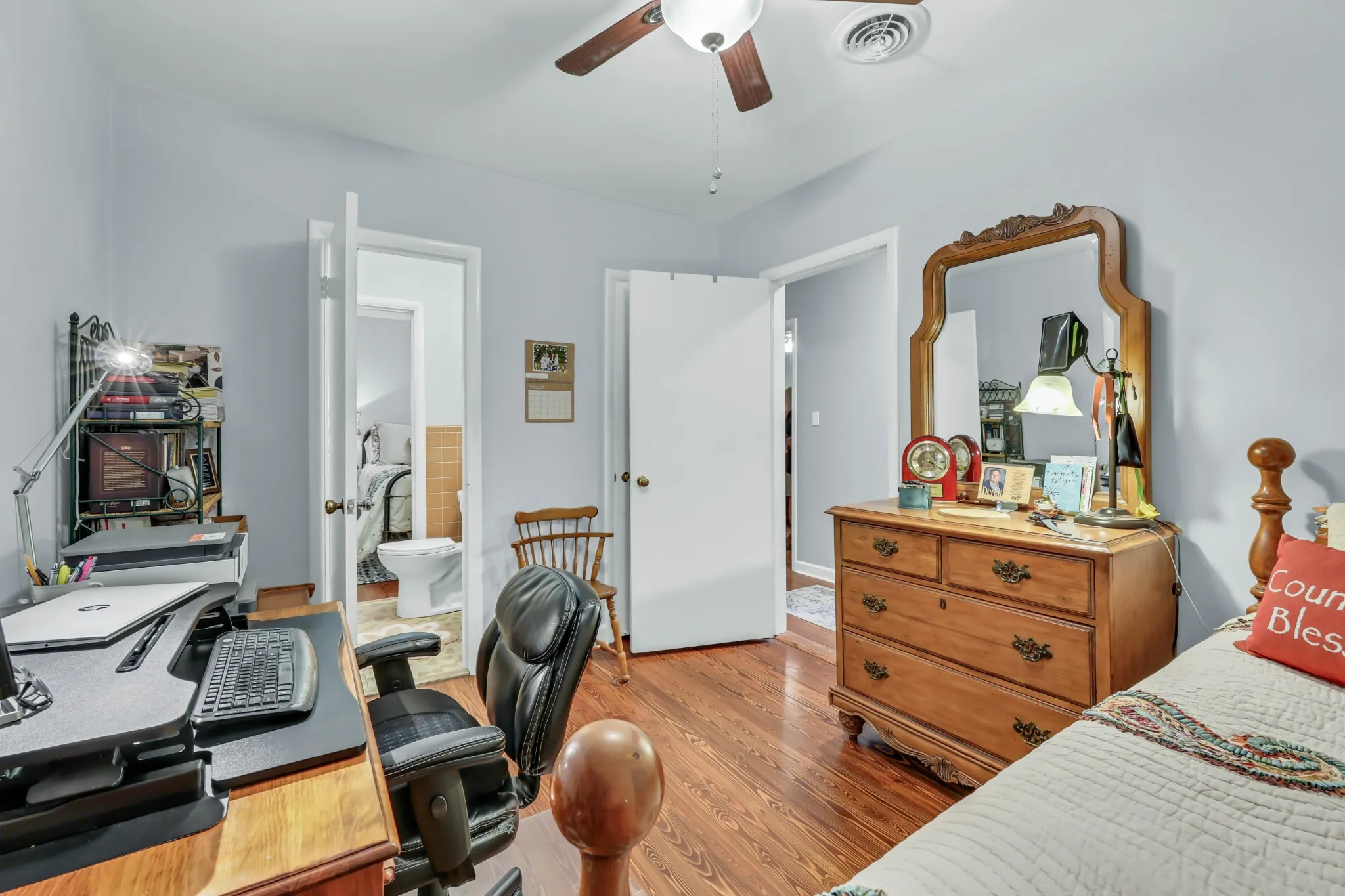 Boasting 4 spacious bedrooms and 2.5 bathrooms, this single-level home provides a layout that’s both functional and inviting. Two of the bedrooms are connected by a classic Jack & Jill half-bath, while the oversized primary suite includes a full ensuite bath and is part of a well-designed addition that also features a large, comfortable den—perfect for relaxing or entertaining.