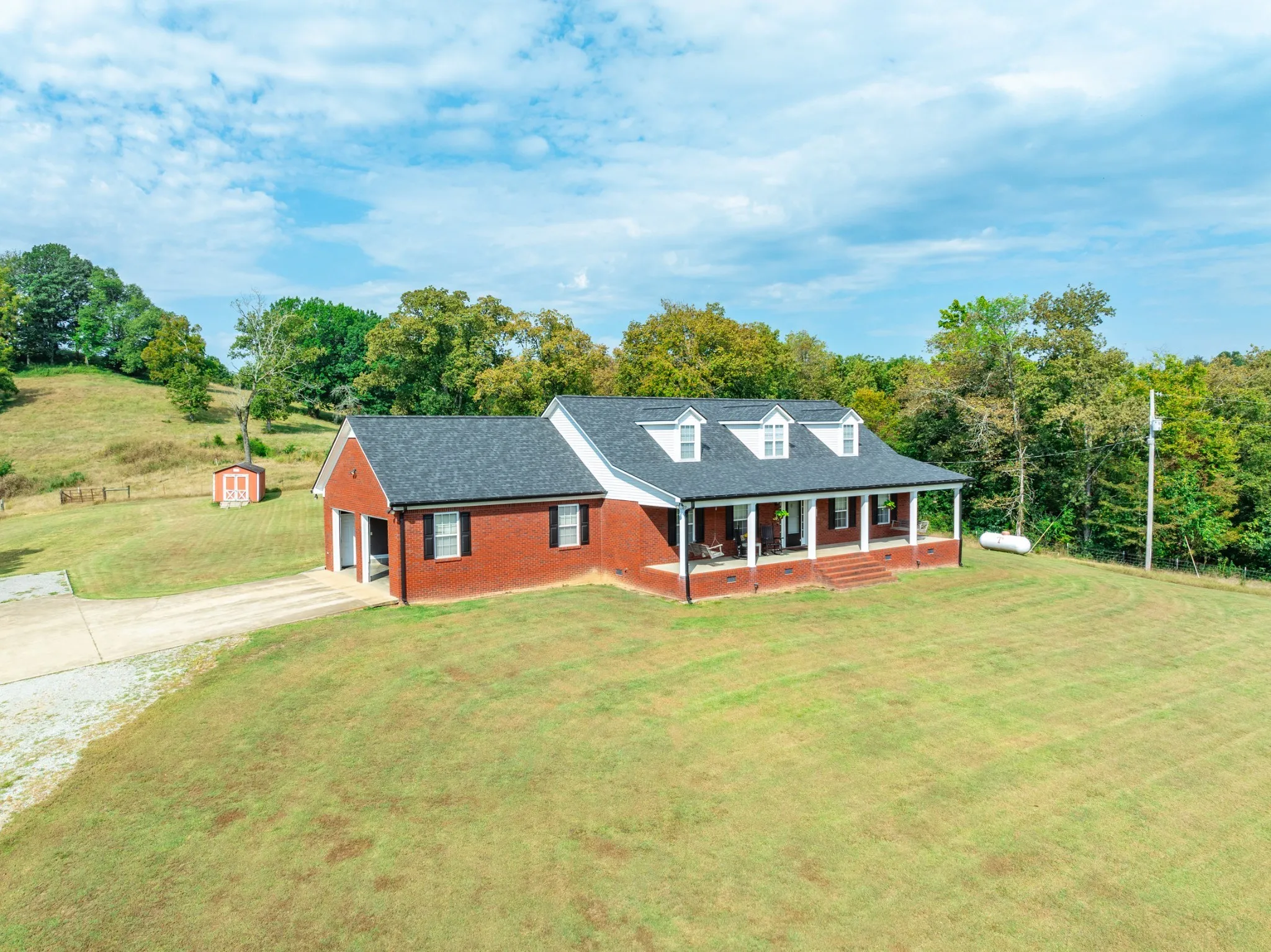 All-brick 2,250 sq ft home on 26+/- beautiful acres in northern Giles County! Main level offers 3 bedrooms, real hardwood floors and tile flooring, plus an office and a workout/exercise room. Enjoy a spacious 2-car garage, cozy gas logs, and an outdoor wood heater provide comfort and convenience. Added touches include a built-in gun safe and custom details throughout. Step outside to a patio with a fire pit, perfect for entertaining and relaxing. Property boasts a horse barn, rolling pasture, and stunning hilltop views-perfect for country living with easy access to I-65. More acreage is available. A rare find combining privacy, functionality, and location!