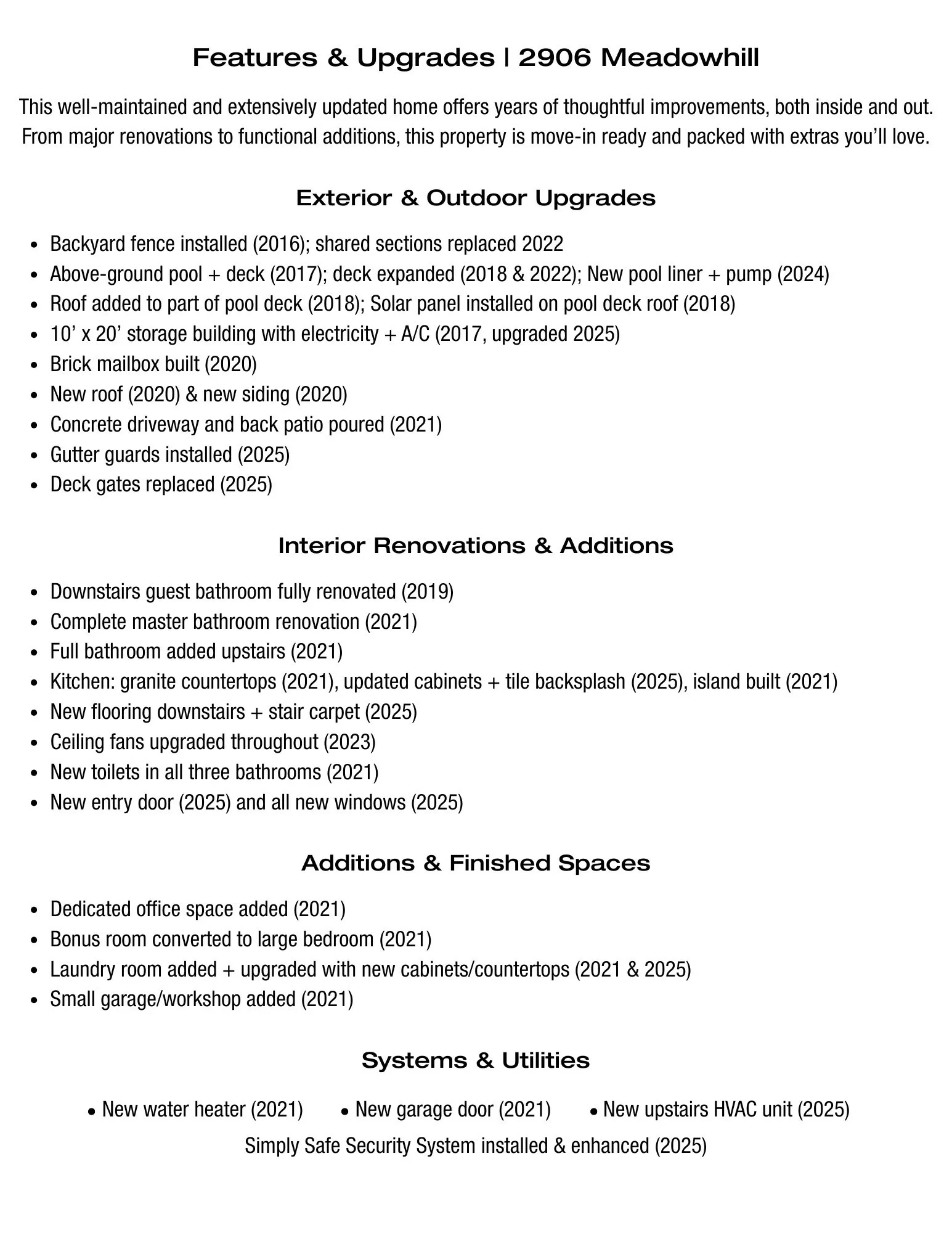 Rare 5 bed/3.5 bath in established neighborhood. Lots of updating including bathrooms, kitchen, flooring, doors, and windows. Replaced in last 5 years: roof, siding, concrete drive/patio, gutter guards, water heater, garage door and upstairs HVAC. Additions include dedicated office space, bonus converted to large bedroom, laundry with cabinets and countertops added. Small garage/workshop plus above-ground pool with covered deck surround. Full list of renovations in photos.