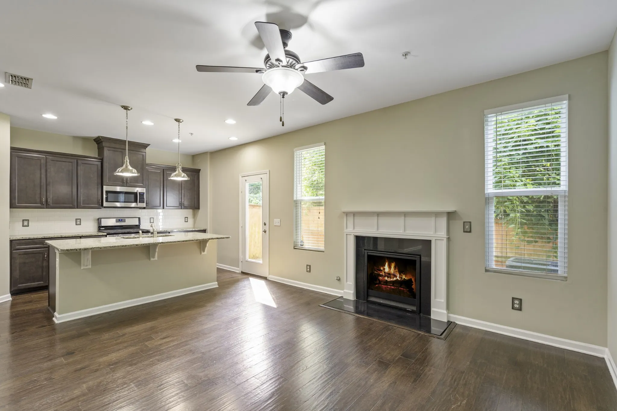 ? Modern kitchen with granite countertops, upgraded cabinets, and stylish lighting