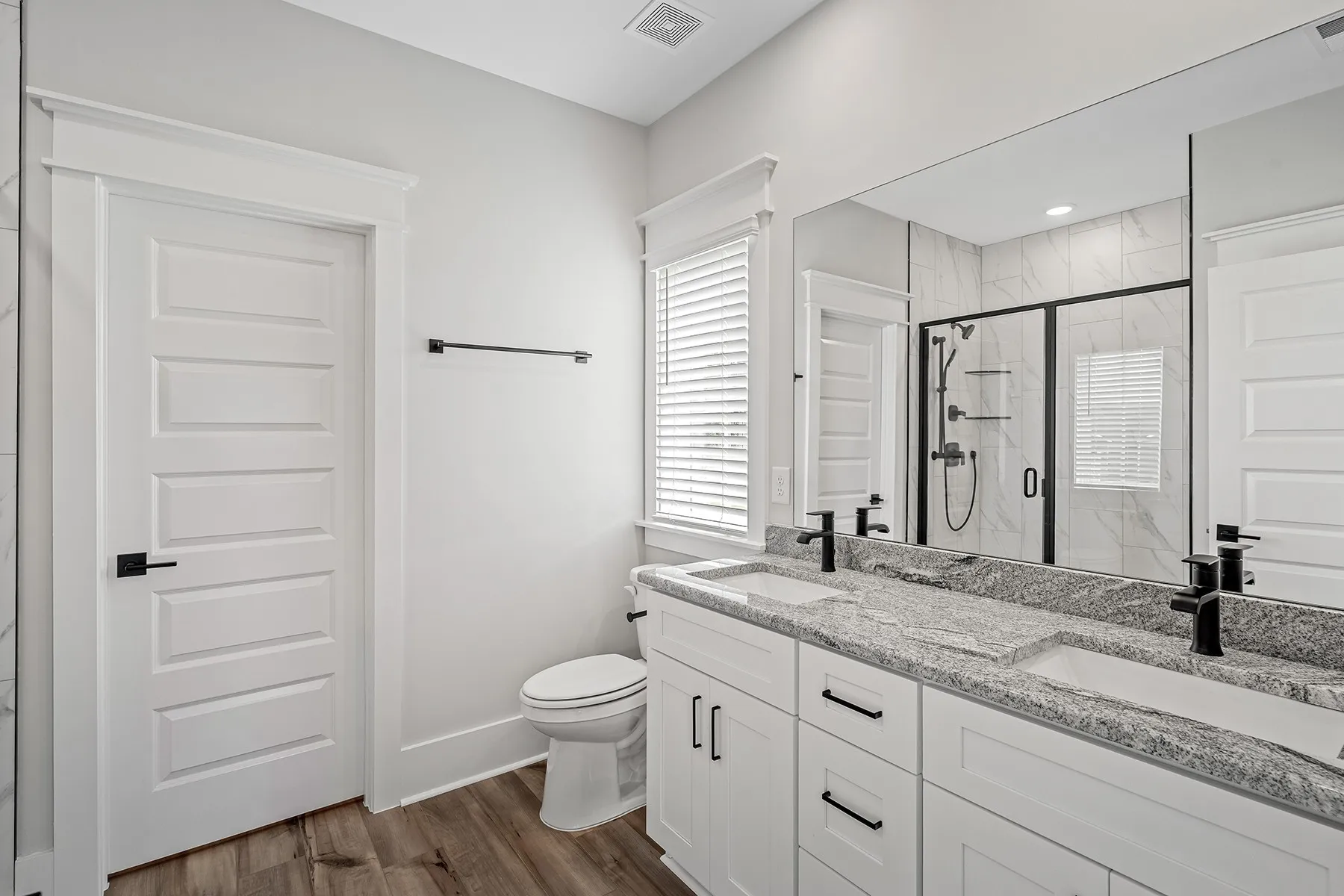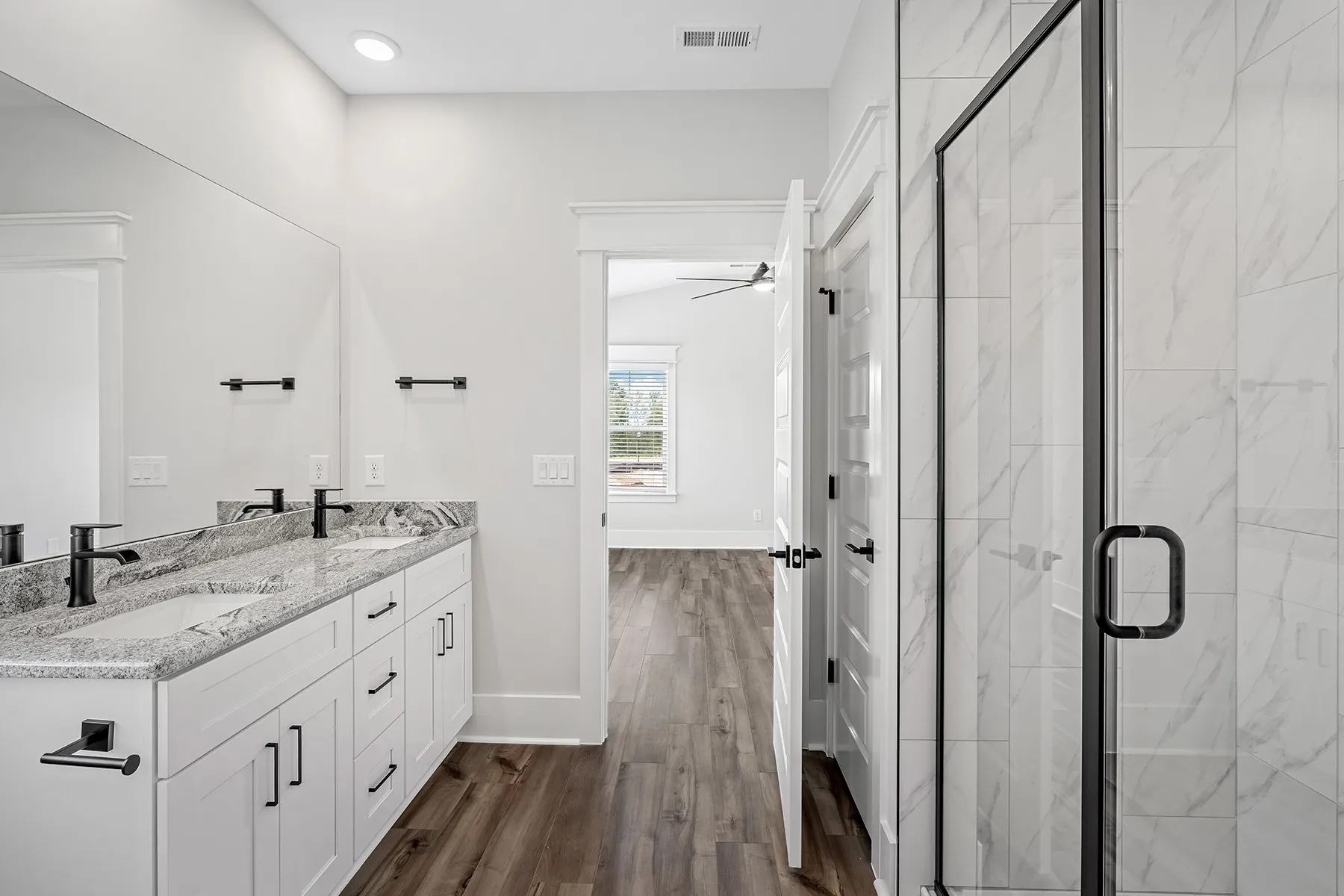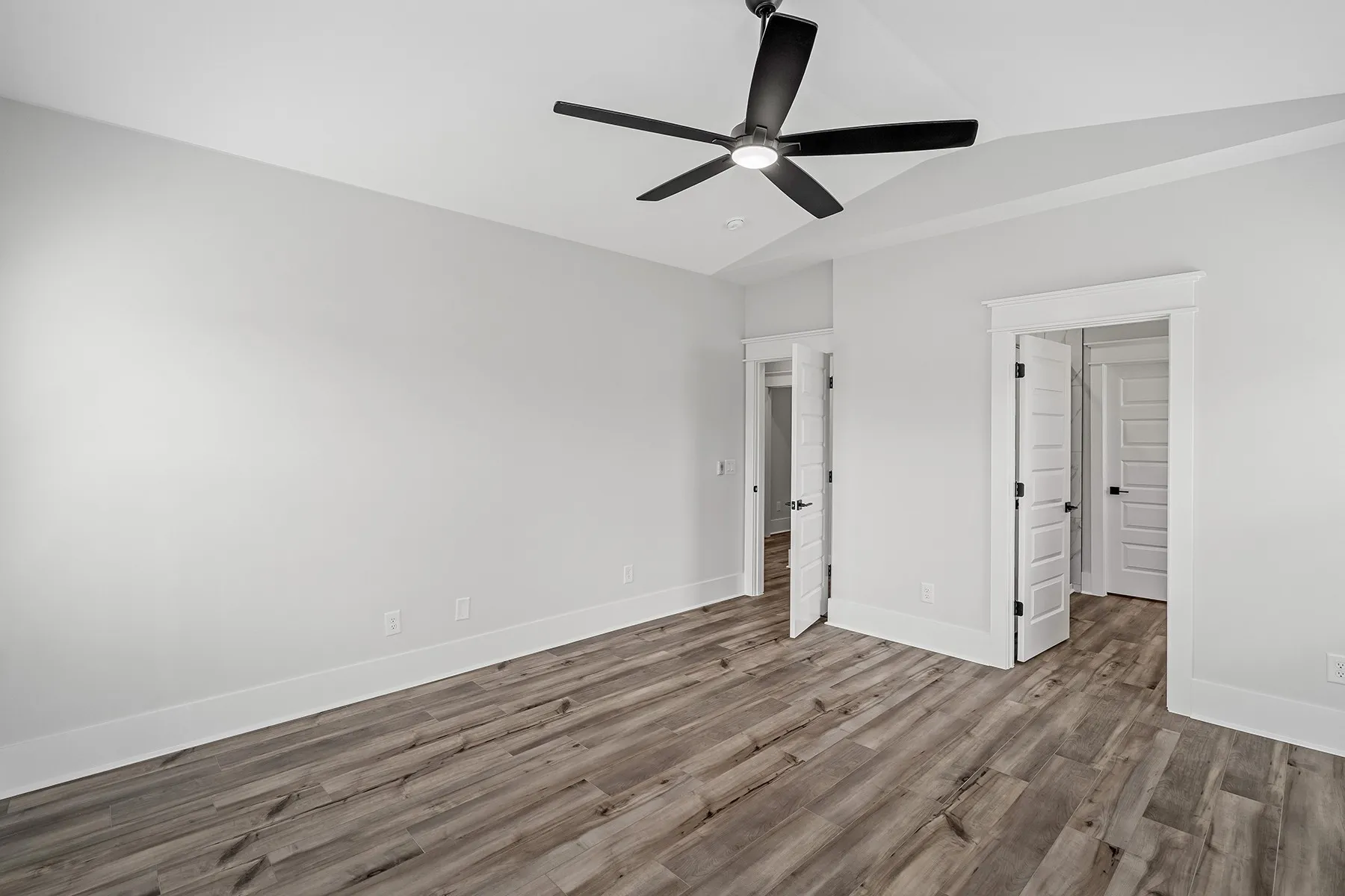Stunning 4 bed, 2.5 bath home. Open floor plan with vaulted ceilings and matte black finishes. Gourmet kitchen with KitchenAid SS appliances, soft-close cabinets, and tile backsplash. Primary suite on the main level with upgraded LVP flooring. Versatile loft area, crown molding, custom trim package, and ceiling fans in all bedrooms. Spacious laundry room with cabinets. Enjoy an oversized covered patio on an oversized lot with community walking trails and bridges.