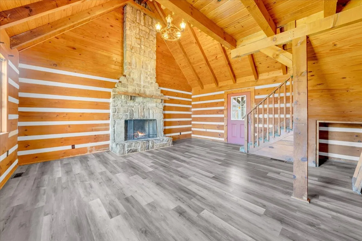 Open Living Room: Vaulted wood ceilings with exposed beams, stone fireplace, and loft overlook for a true cabin feel.
