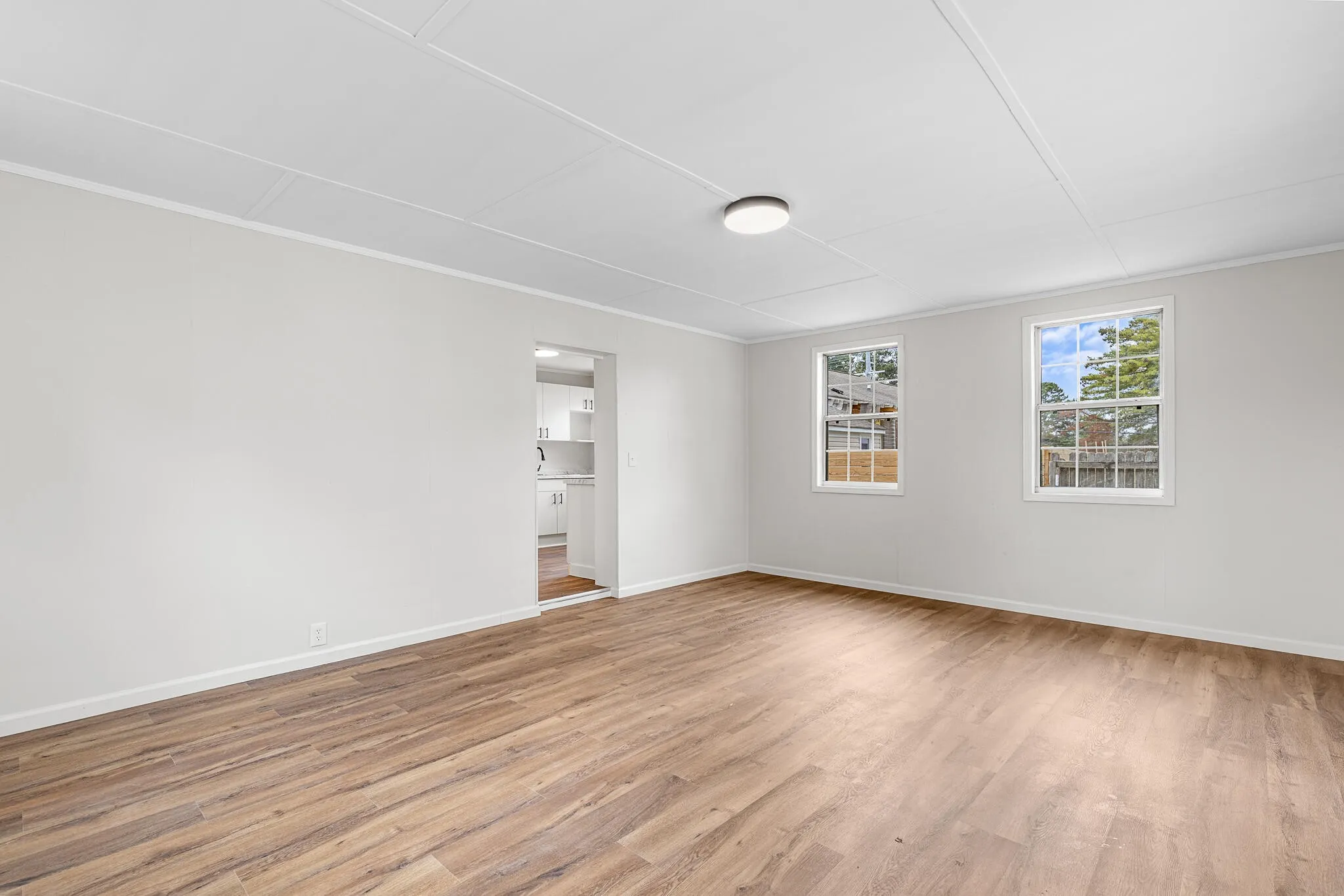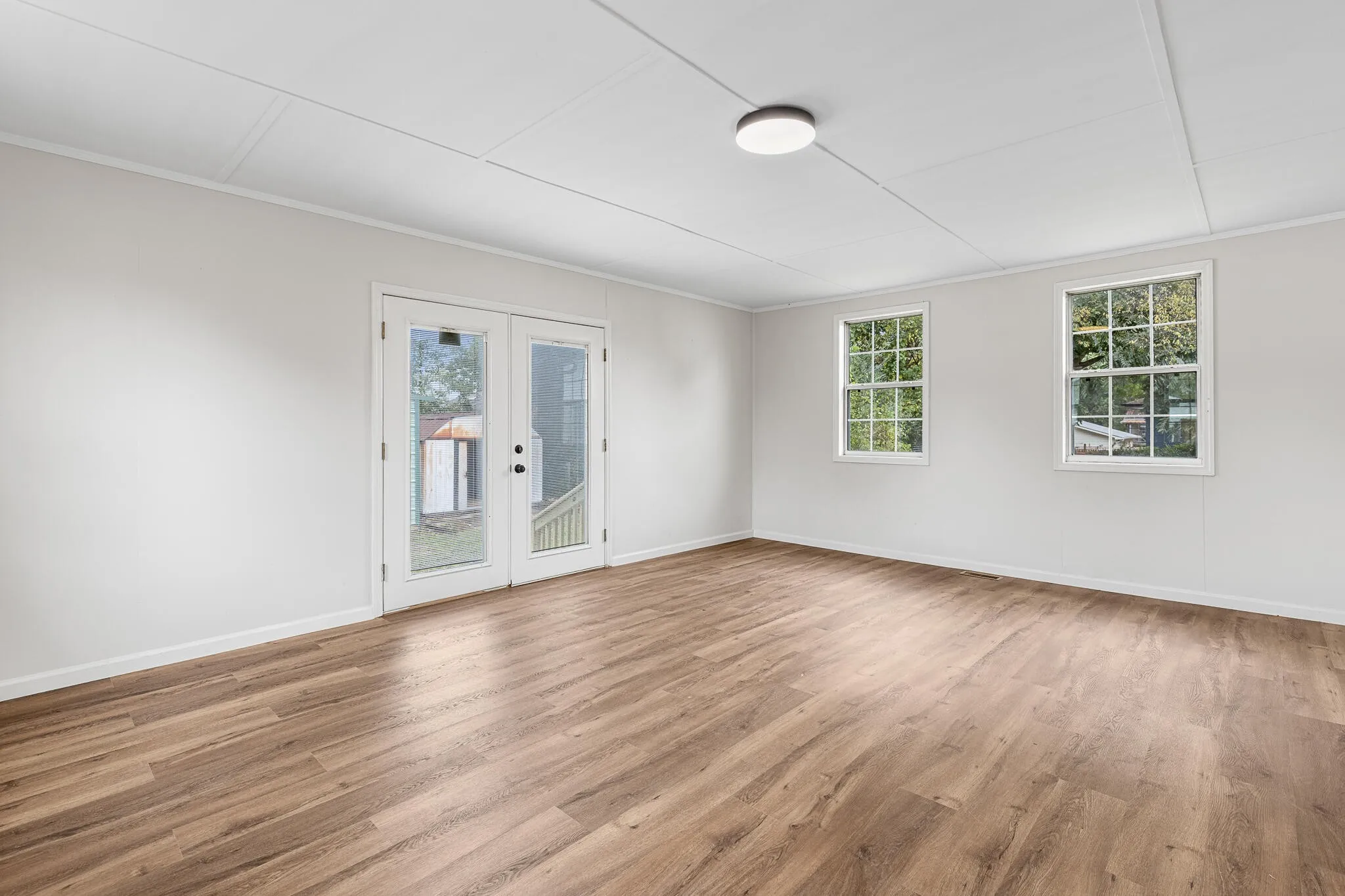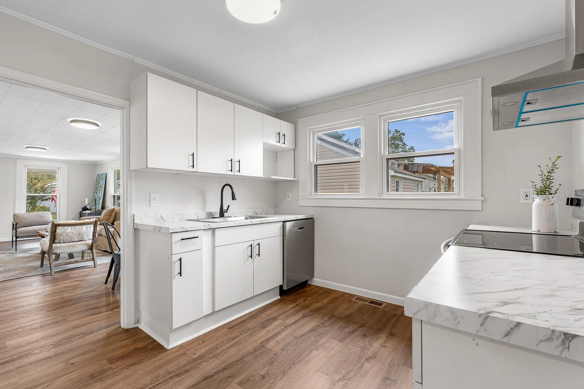 Welcome to 5289 Spriggs St—a newly remodeled 2-bedroom, 1-bath home that feels bright and inviting from the moment you step inside. An open living and dining area is lined with large windows that flood the space with natural light, while the refreshed kitchen showcases marble countertops and new appliances. The primary bedroom features a private French door entry that opens to the backyard, creating easy indoor-outdoor flow. Outside, two separate sheds add valuable versatility, including a dedicated workshop and an additional storage shed. A driveway with space for two cars completes this move-in-ready home that blends modern finishes with everyday practicality.