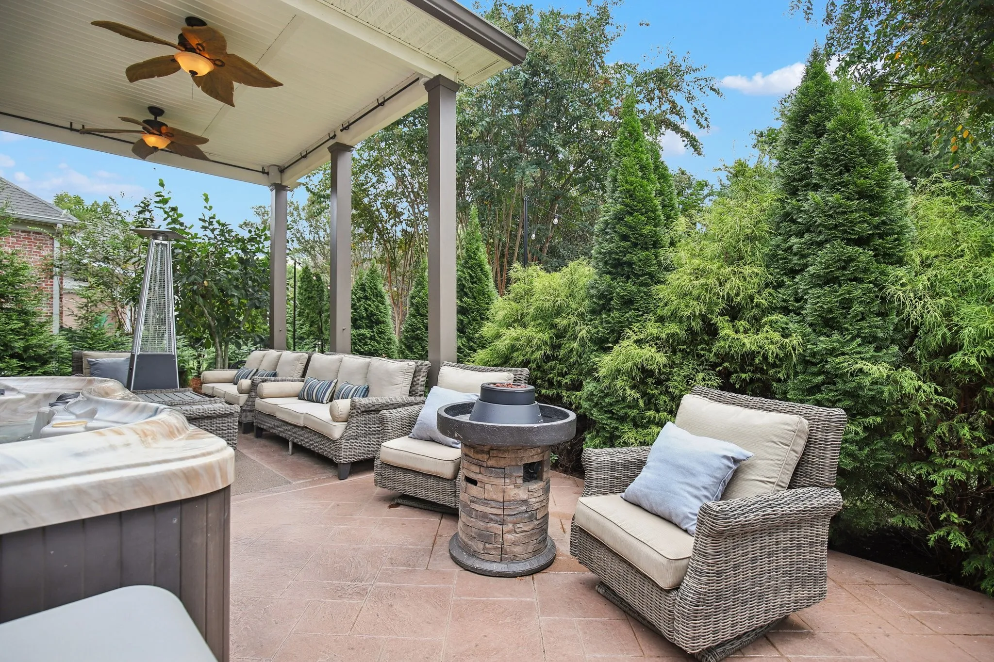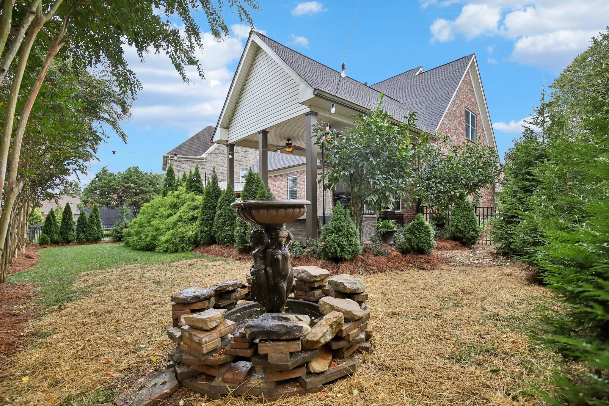 Step outside to your private paradise—complete with a covered patio, stone gas fireplace, pergola and hot tub each with overhead flat screen TVs, the timeless “Three Graces” fountain, ambient color string lighting, and ceiling fans that create a year-round atmosphere of relaxation and style.\n