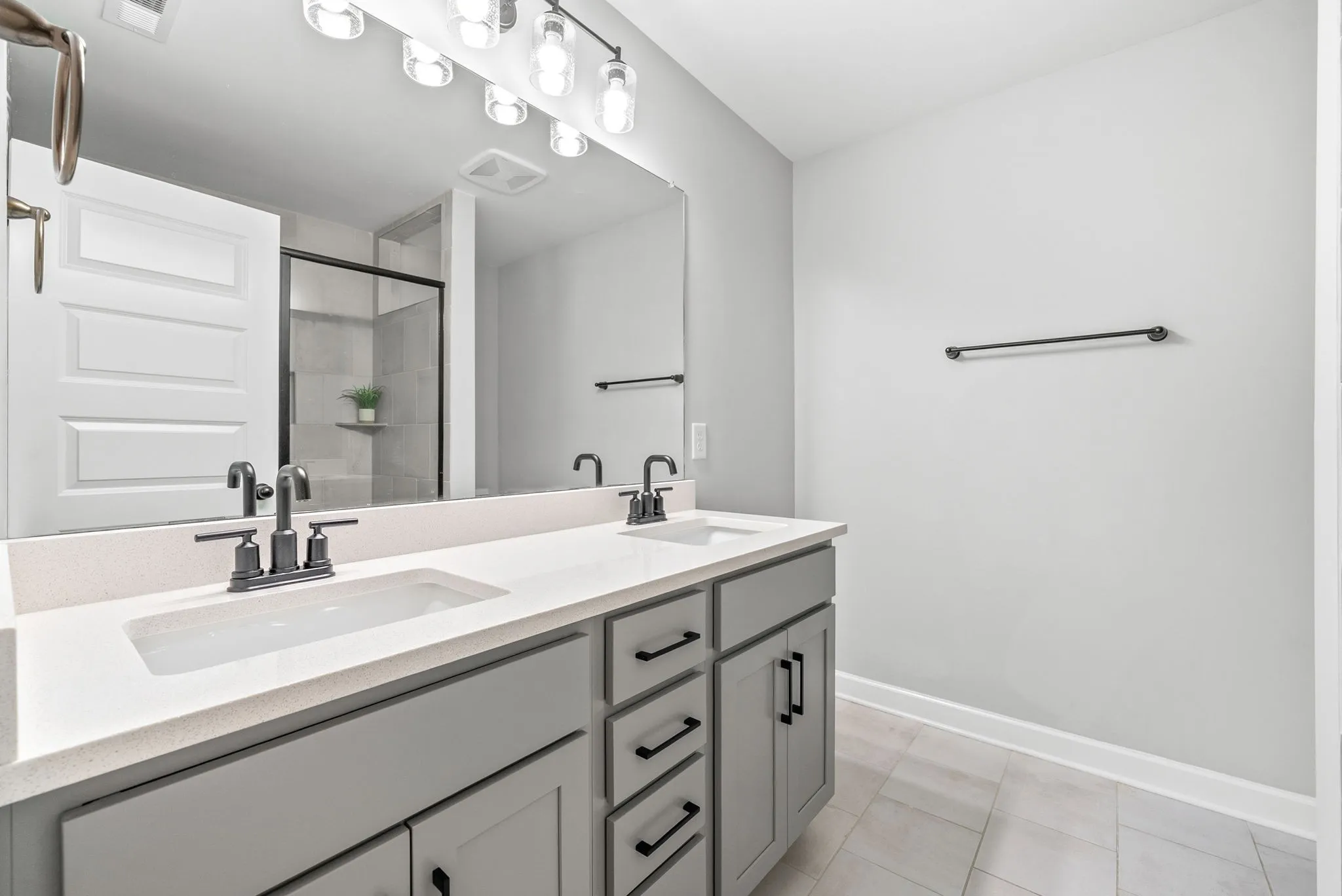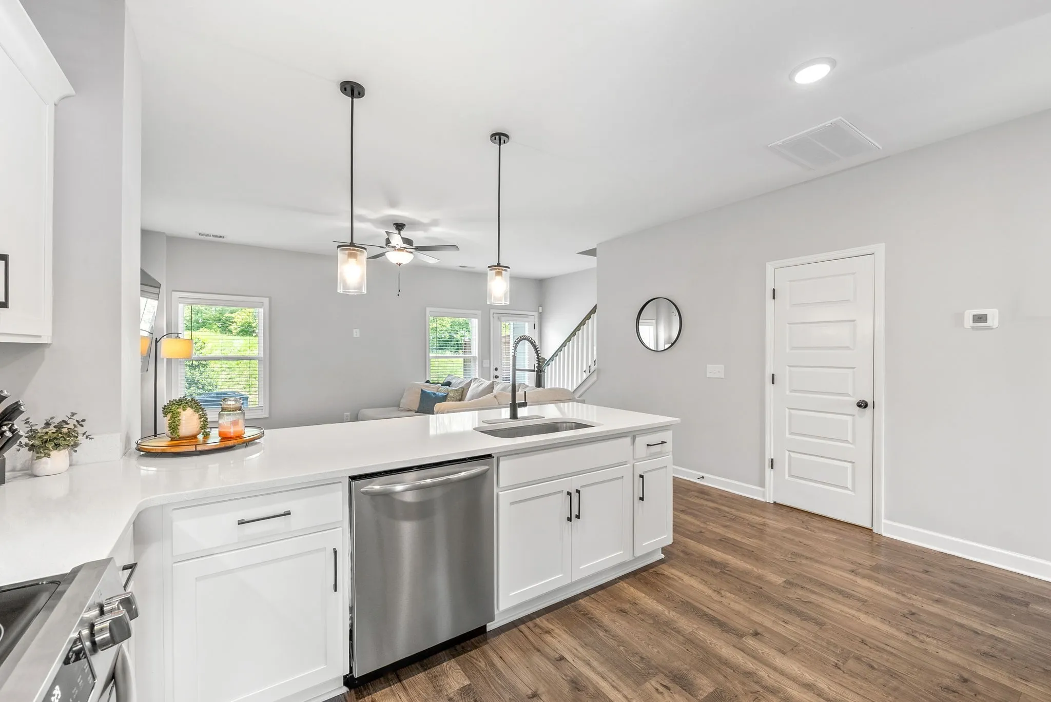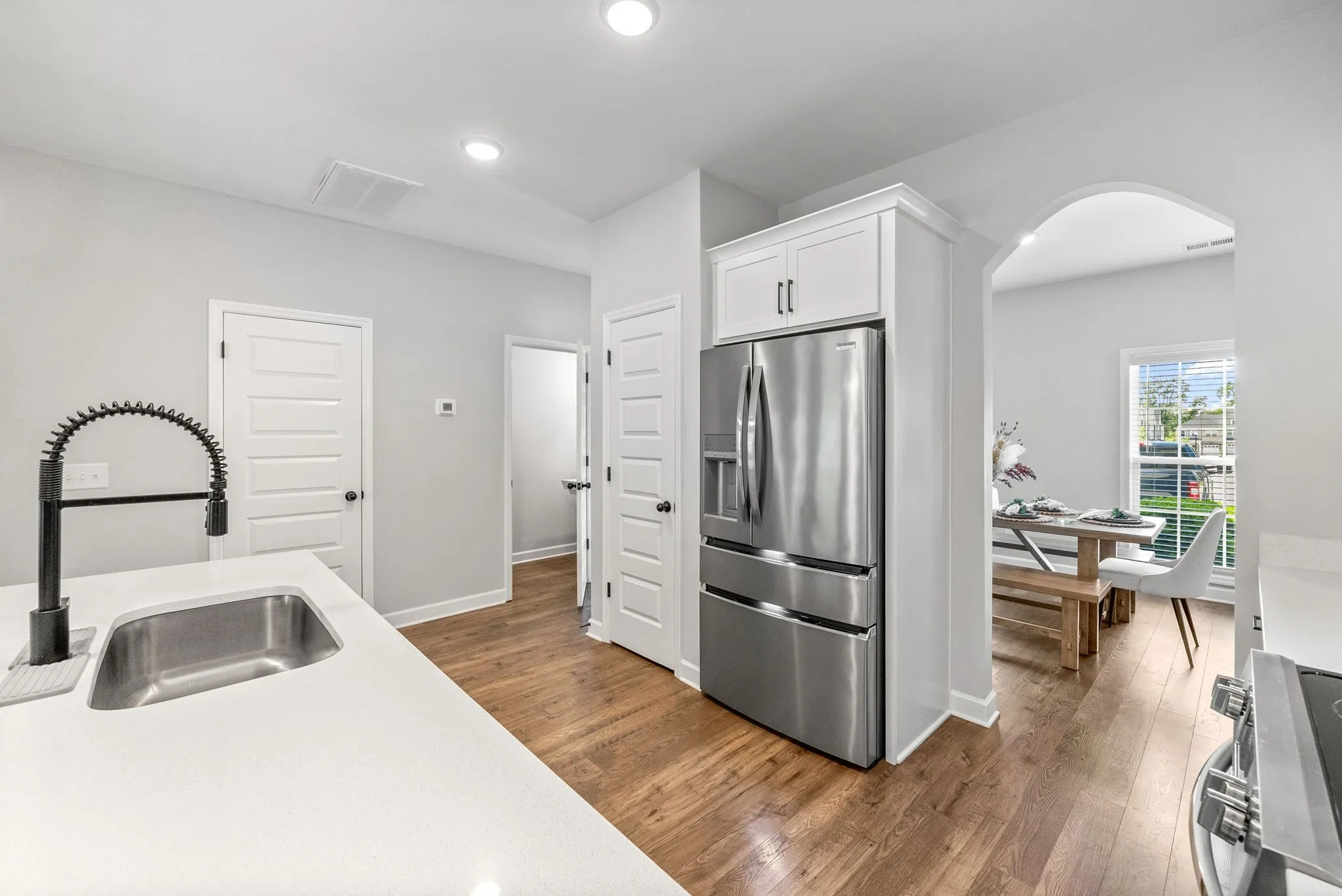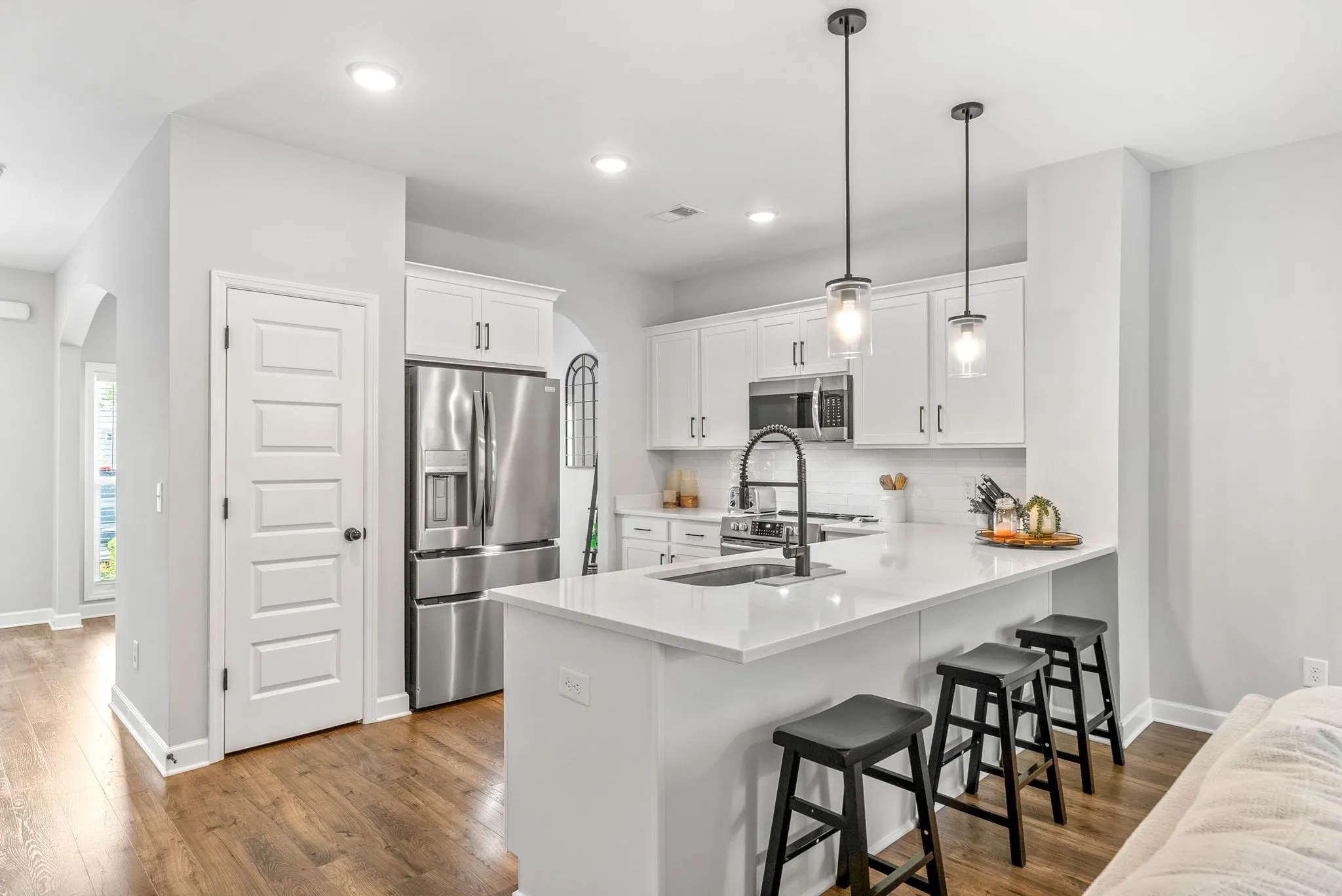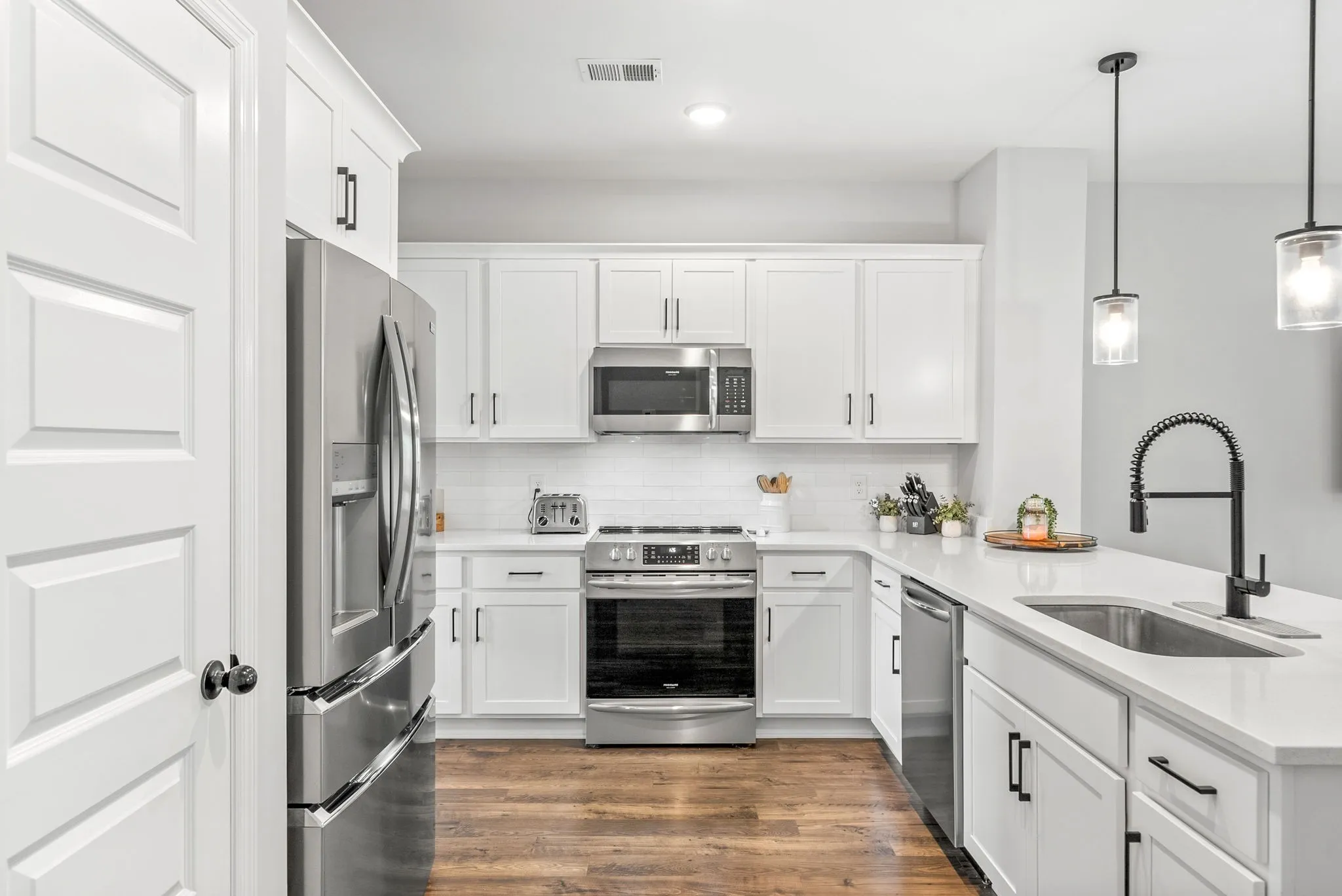 The chef-inspired kitchen showcases white maple cabinetry with crown molding, sleek black hardware and faucets, a single-bowl sink, and stunning quartz countertops that continue through all full bathrooms. High-end Frigidaire Gallery stainless steel appliances, including a built-in microwave, oven/stove, and dishwasher, add both style and convenience.\n