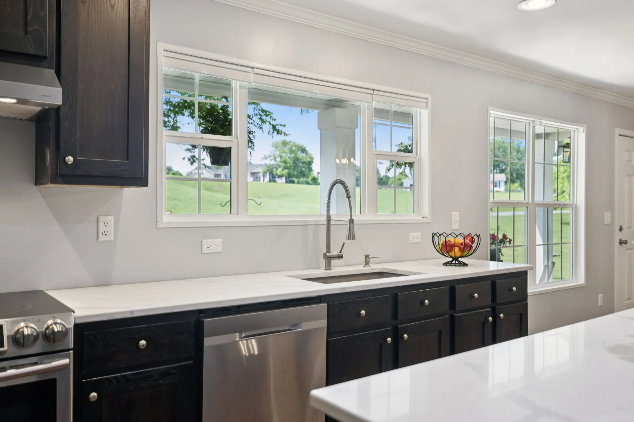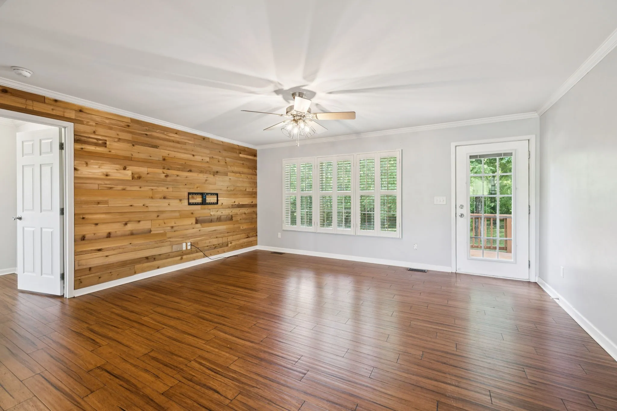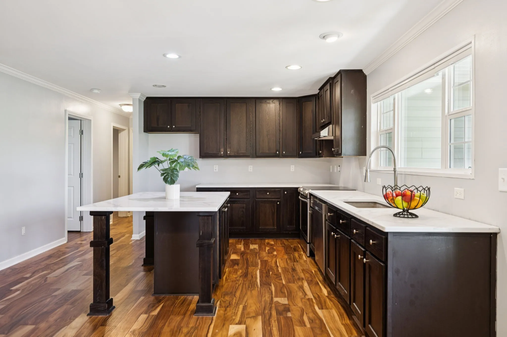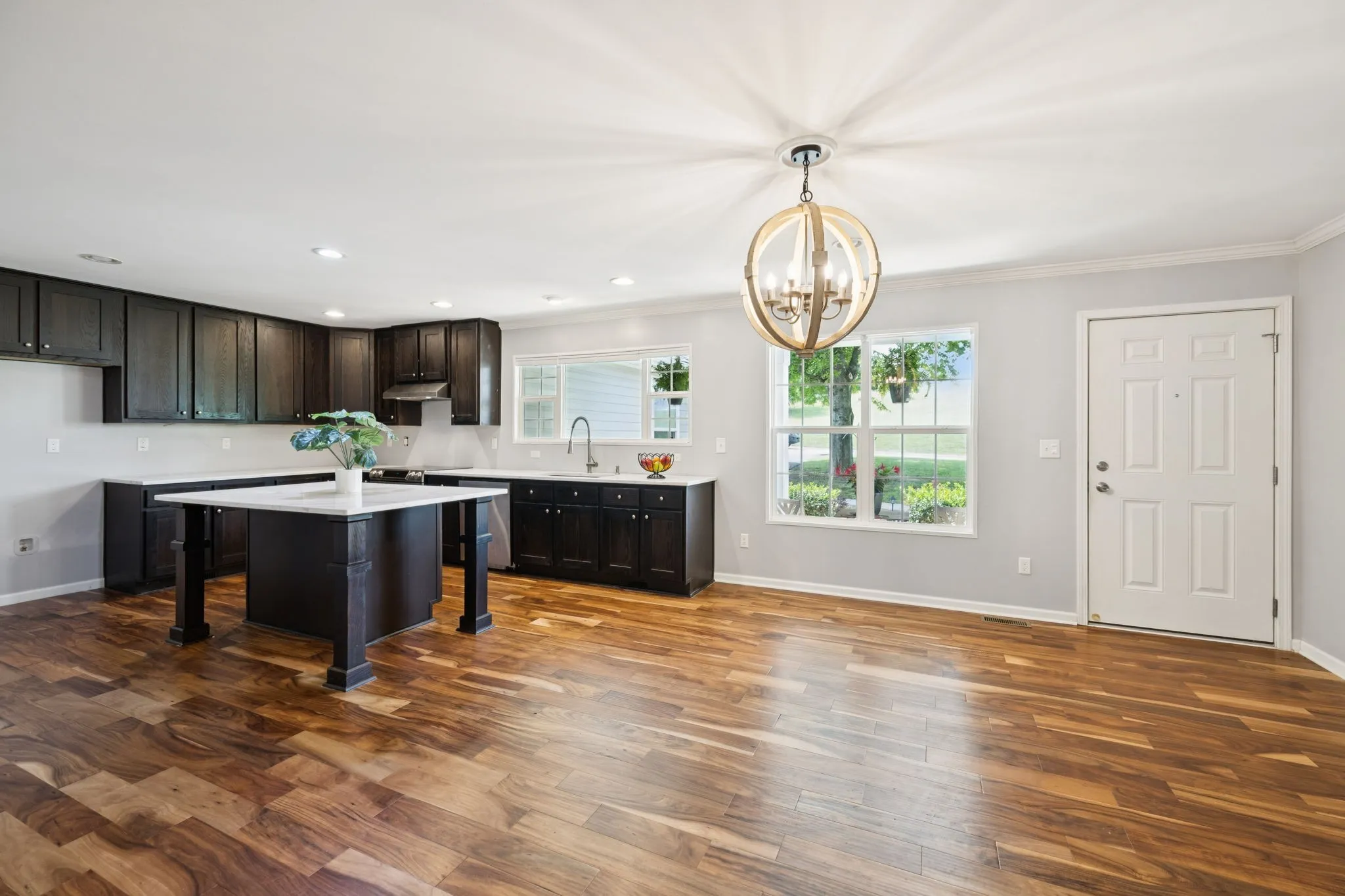 Inside, you’ll love the open, airy layout with no carpet!. The heart of the home is the fully renovated kitchen with quartz countertops, an oversized island, and soft recessed lighting. It flows seamlessly into the living room, featuring a warm wood accent wall, and into the dining area which is centrally located for everyday living and entertaining.