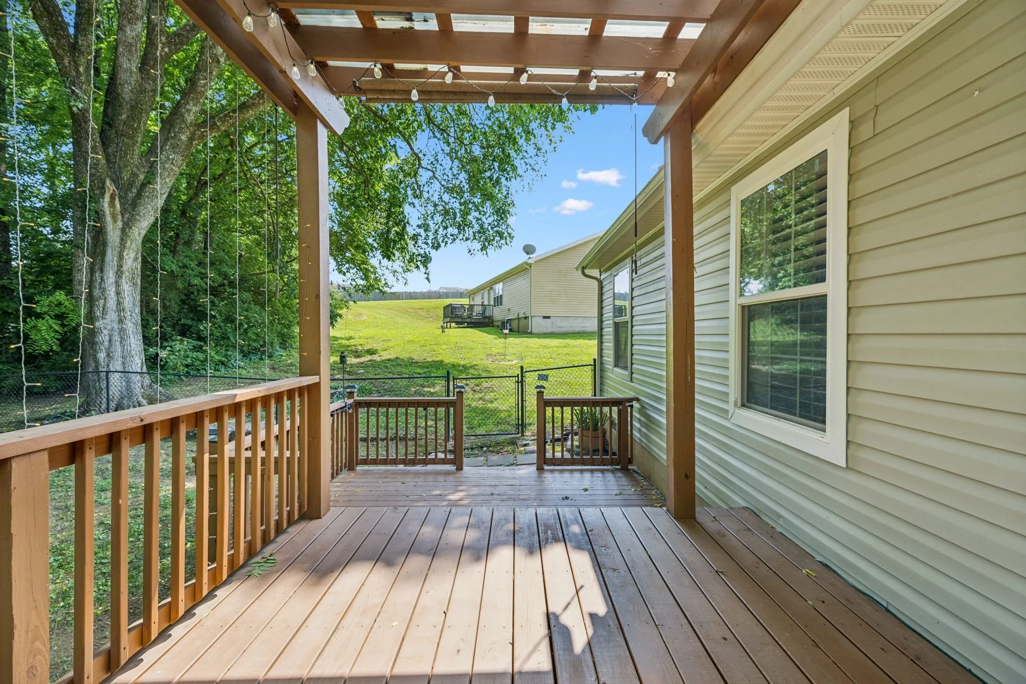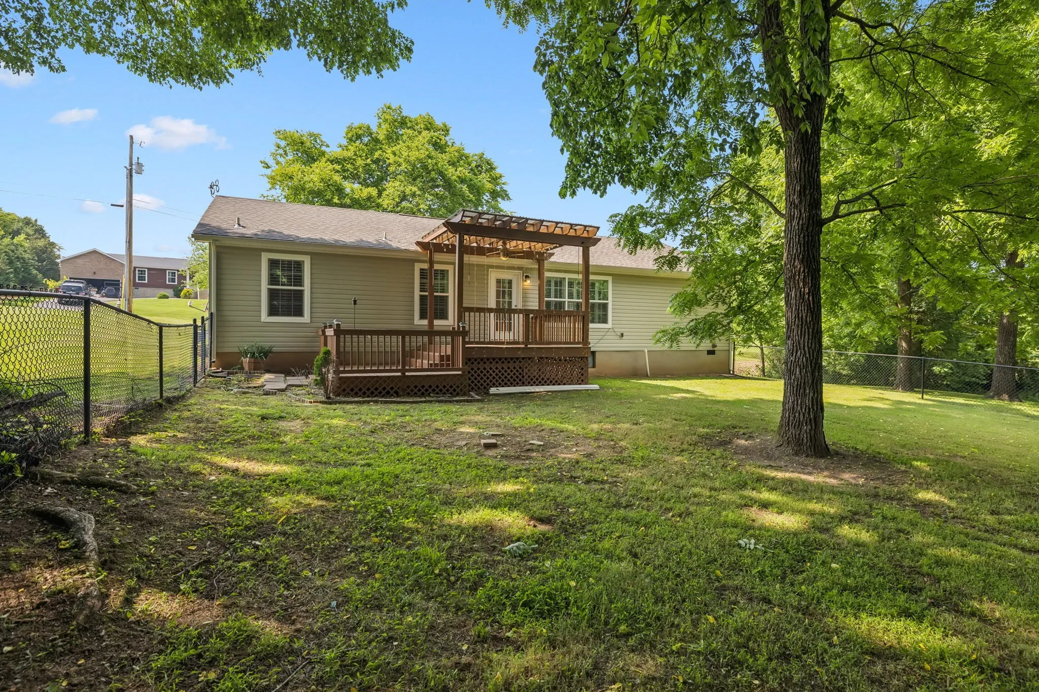Step outside to enjoy the expanded two-level deck with arbor, overlooking woods and nature. The fenced backyard is great for pets or play, and a storage building stays with the home.