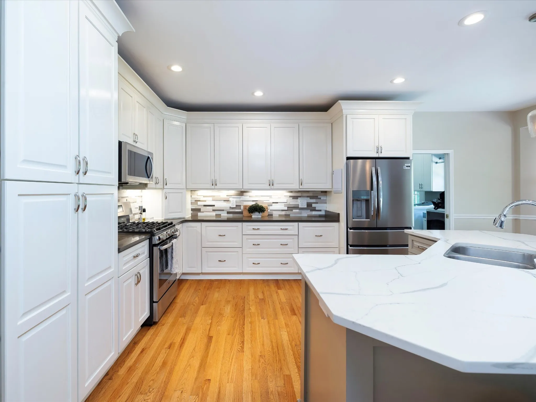 Step inside to a warm and inviting interior featuring an open-concept layout, and abundant natural light. The main level boasts a large living area, formal dining space, and chef's kitchen with brand new stainless steel appliances, and quartz countertops. A spacious primary suite includes a luxurious en-suite bathroom with dual vanities, a soaking tub, and a walk-in shower.\n