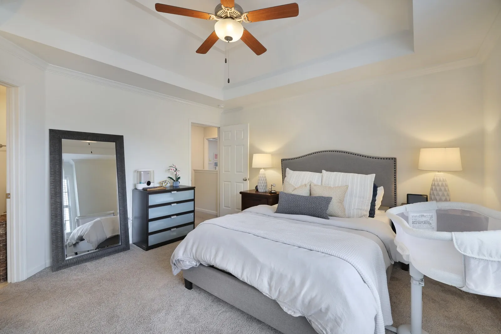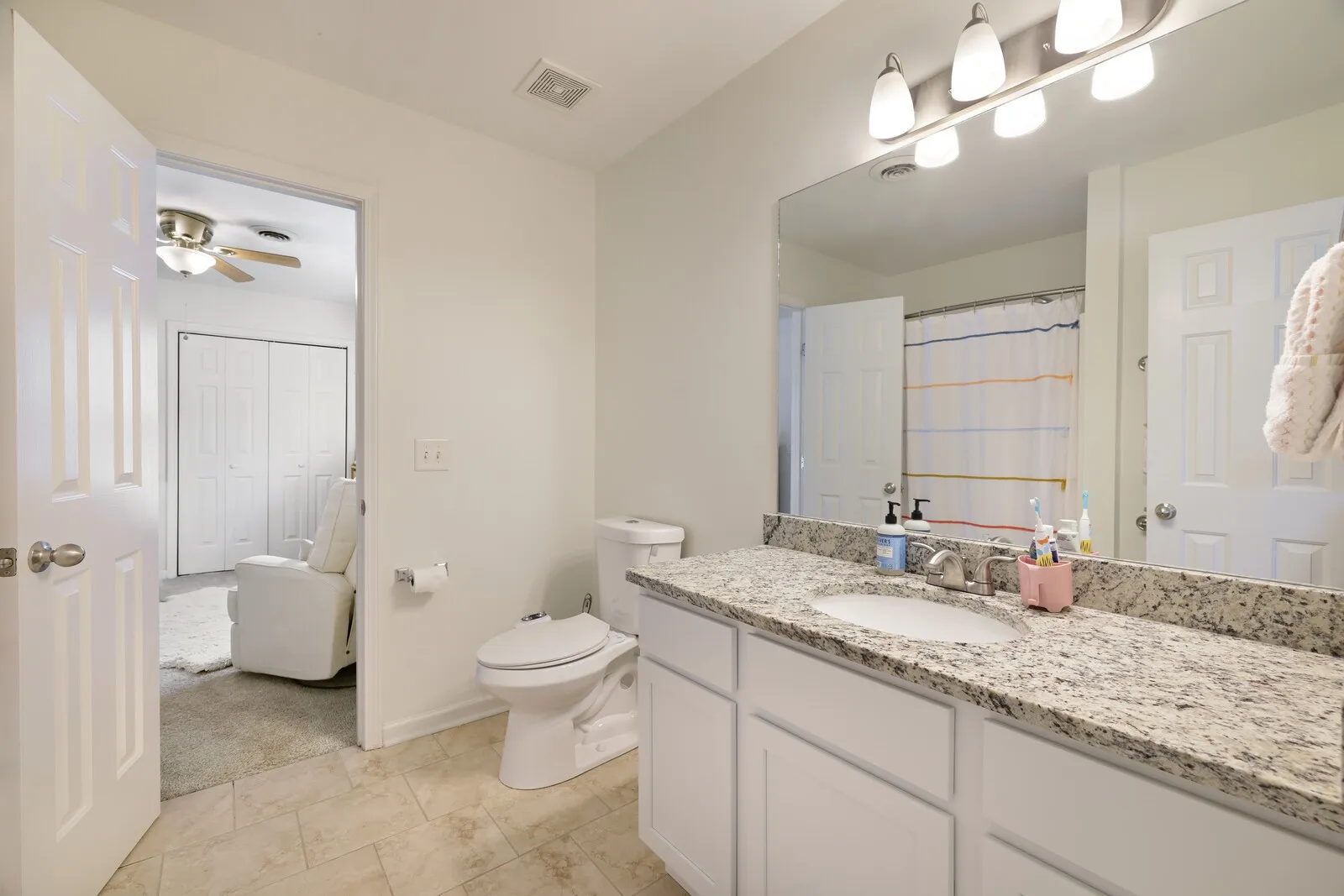 The spacious owner’s suite offers a serene retreat with a tray ceiling, walk-in closet, and private bath with dual vanities and granite countertops. Additional bedrooms are well-sized with ample closet space and share a generously sized Jack and Jill bathroom. A convenient half bath is located just off the living room for guests.