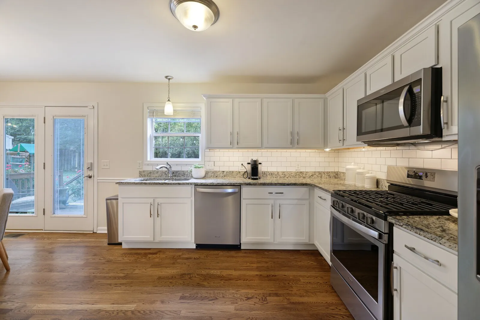 The inviting living room features a cozy fireplace and oversized arched windows, while both a formal dining room and an eat-in kitchen provide flexible spaces for gatherings. The updated kitchen boasts granite countertops, stainless steel appliances, subway tile backsplash, and crisp white cabinetry—perfect for both everyday meals and entertaining.
