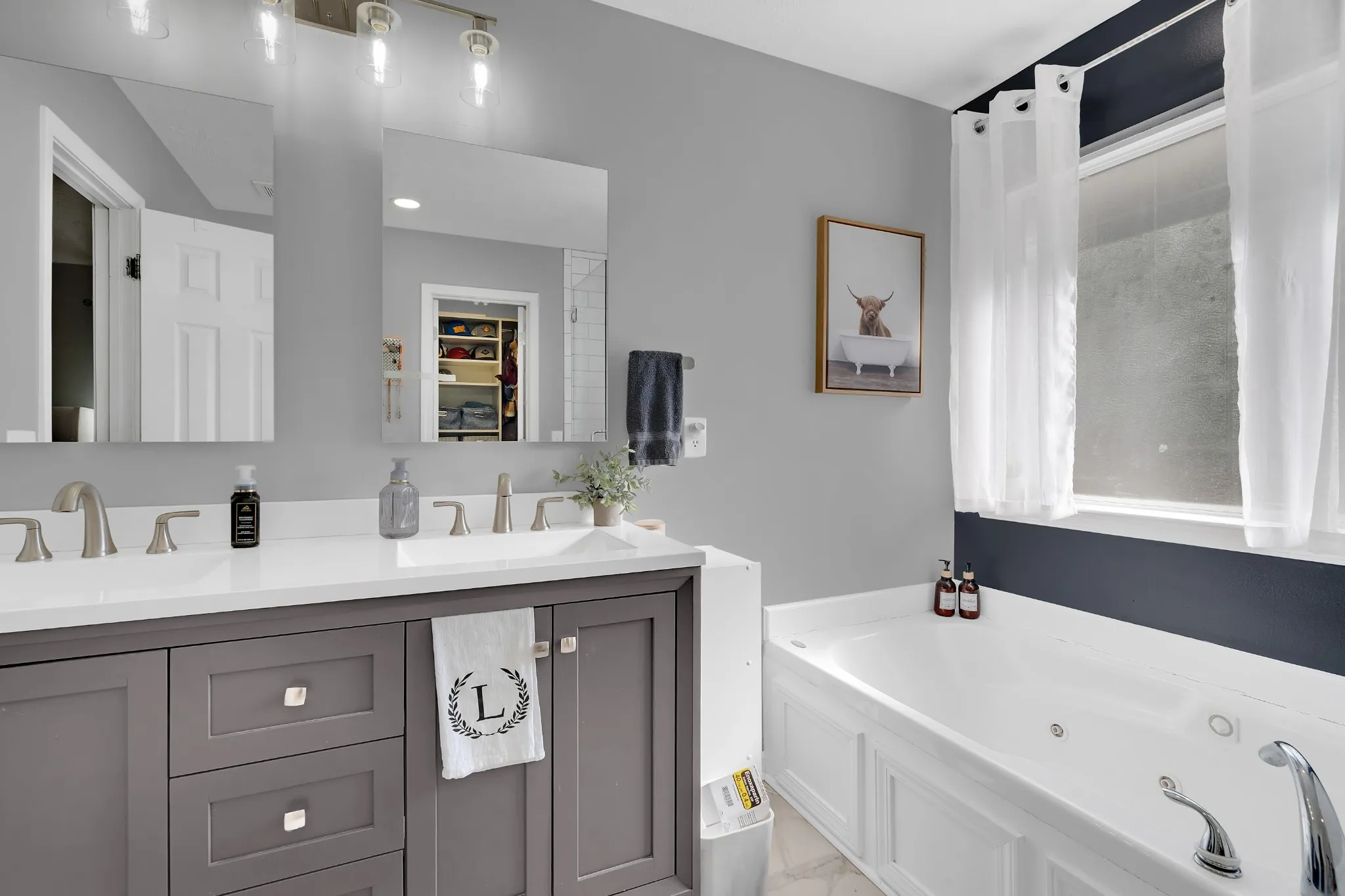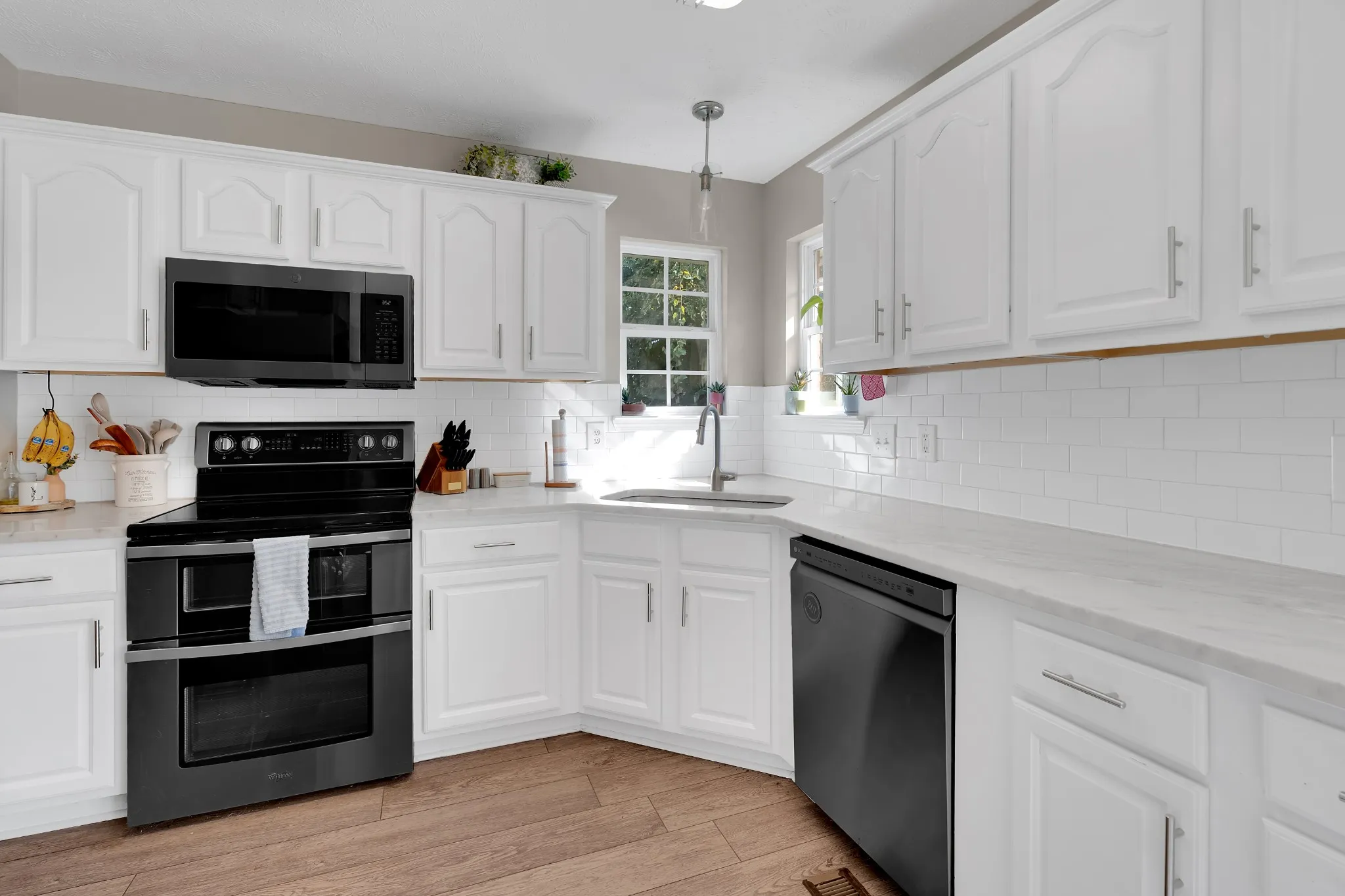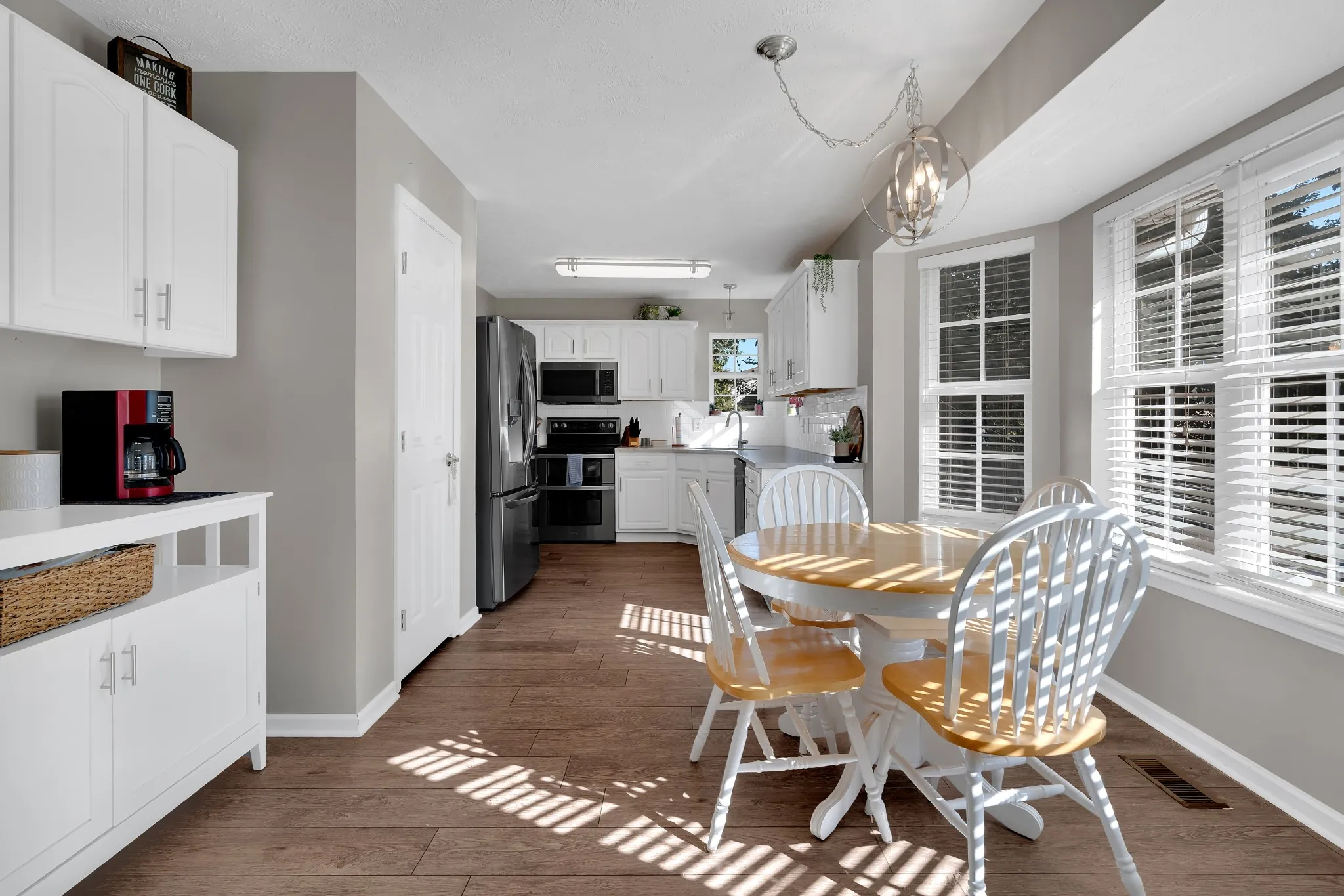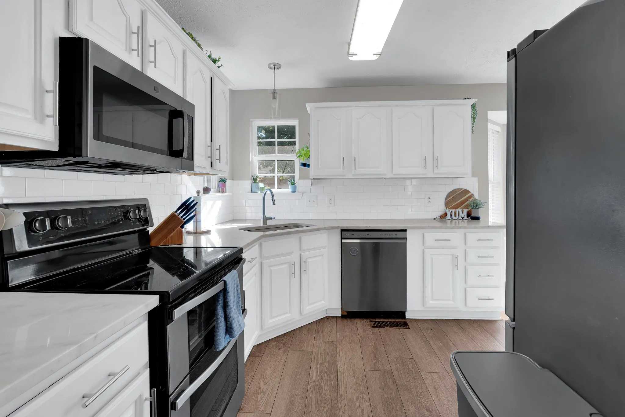 Inside, you’ll find thoughtful modern updates throughout. The home boasts a formal dining room as well as a breakfast nook with a cozy coffee bar in the eat-in kitchen, which has been beautifully updated with quartz countertops and stainless appliances. The spacious primary suite includes a double vanity, Jacuzzi tub, separate tile shower, and a walk-in closet. Two additional bedrooms and a full bath provide plenty of space, while the bonus room above the attached two car garage offers endless possibilities whether for a home office, playroom, or media space.
