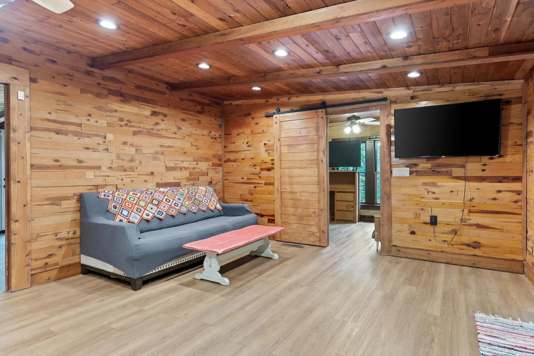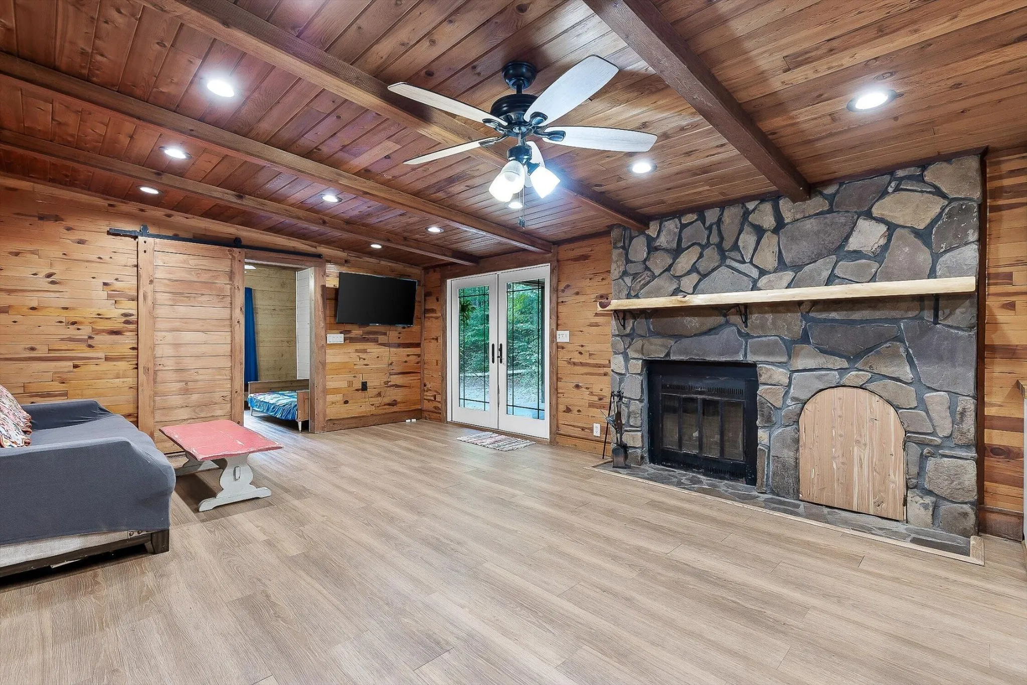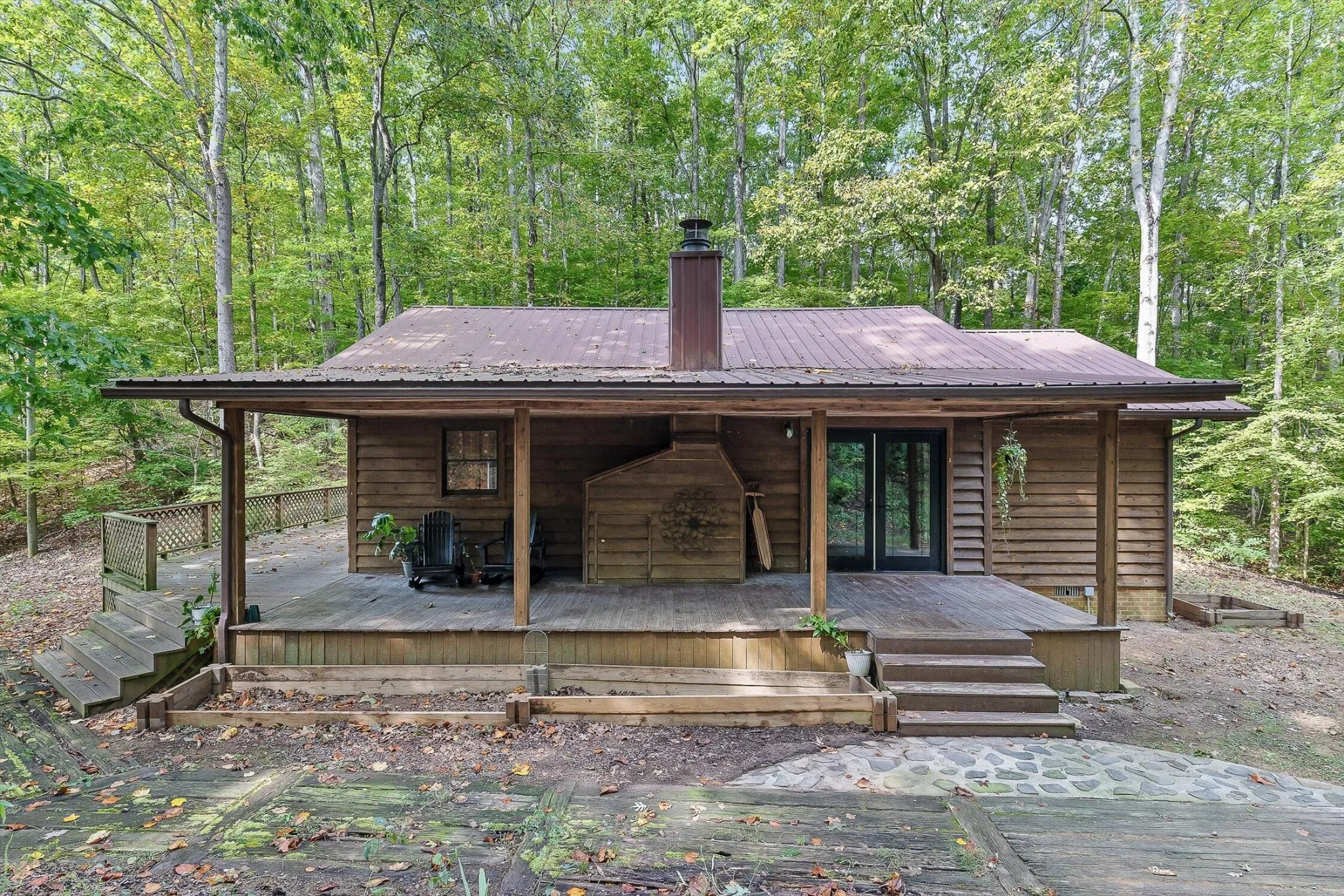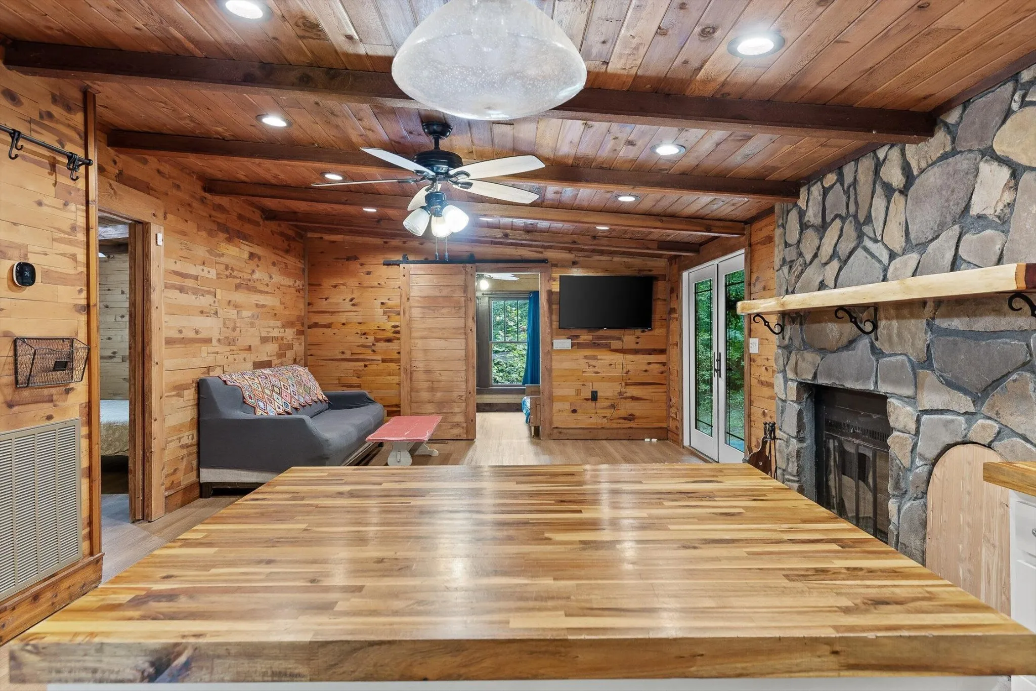 Calling all outdoorsmen and homesteaders looking for the perfect retreat in nature—this 20.079-acre property is a rare find. The land offers a mix of open pasture, wooded hillsides, and a stocked pond perfect for fishing, with a peaceful stream and creek that draw abundant wildlife. The main home has been completely remodeled with rustic charm, featuring an eye-catching rock fireplace, exposed wood-beam ceilings, pocket doors, and must-see custom tile showers. Durable wood-plank tile runs throughout, while the primary suite boasts a double vanity and dual closets. The kitchen has been beautifully updated with butcher-block countertops, new cabinetry, a pantry, and stainless appliances.