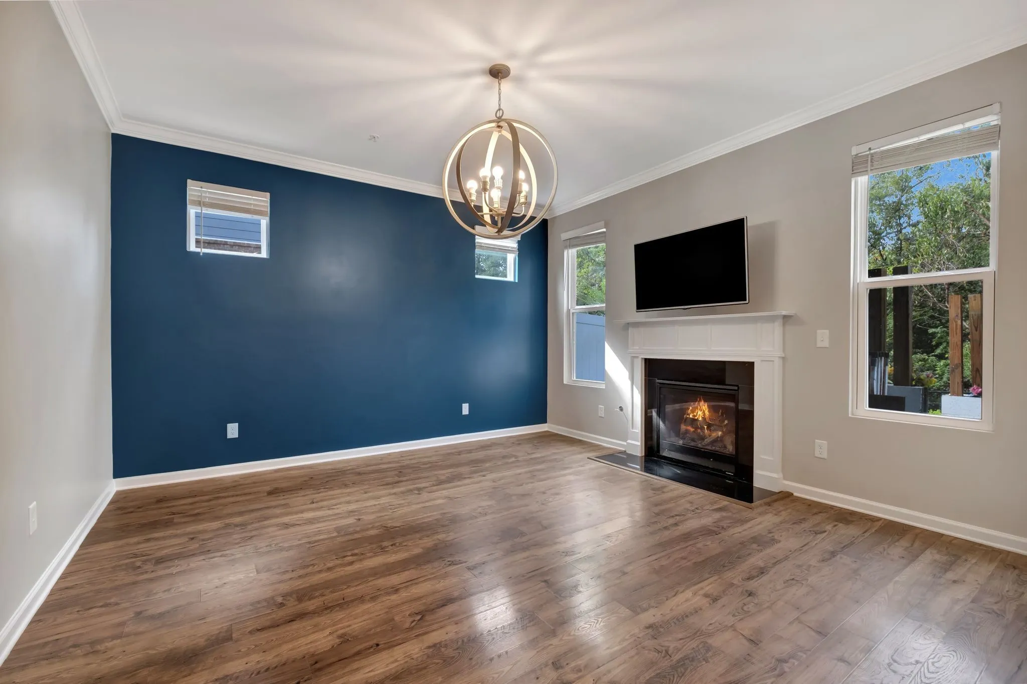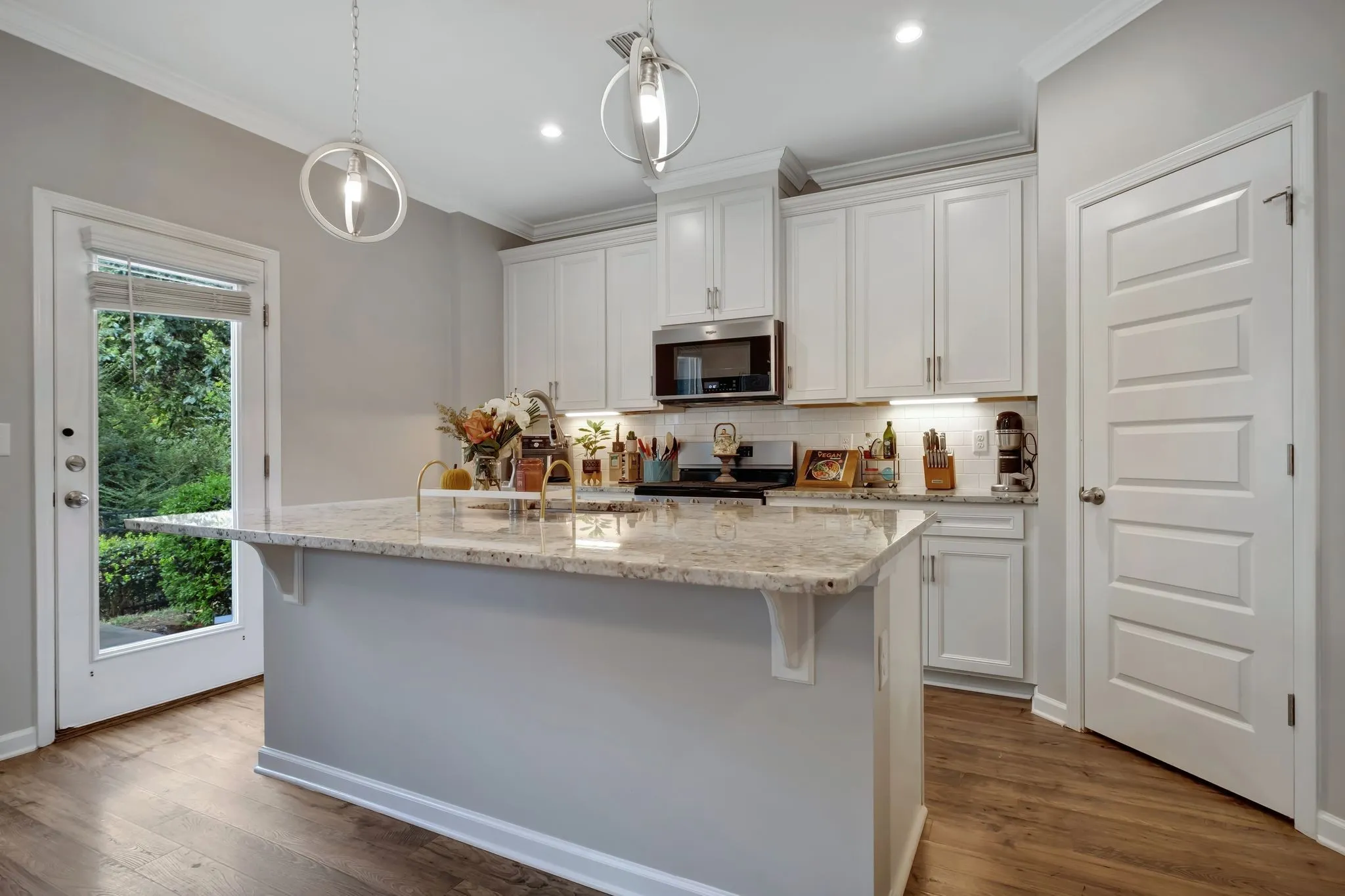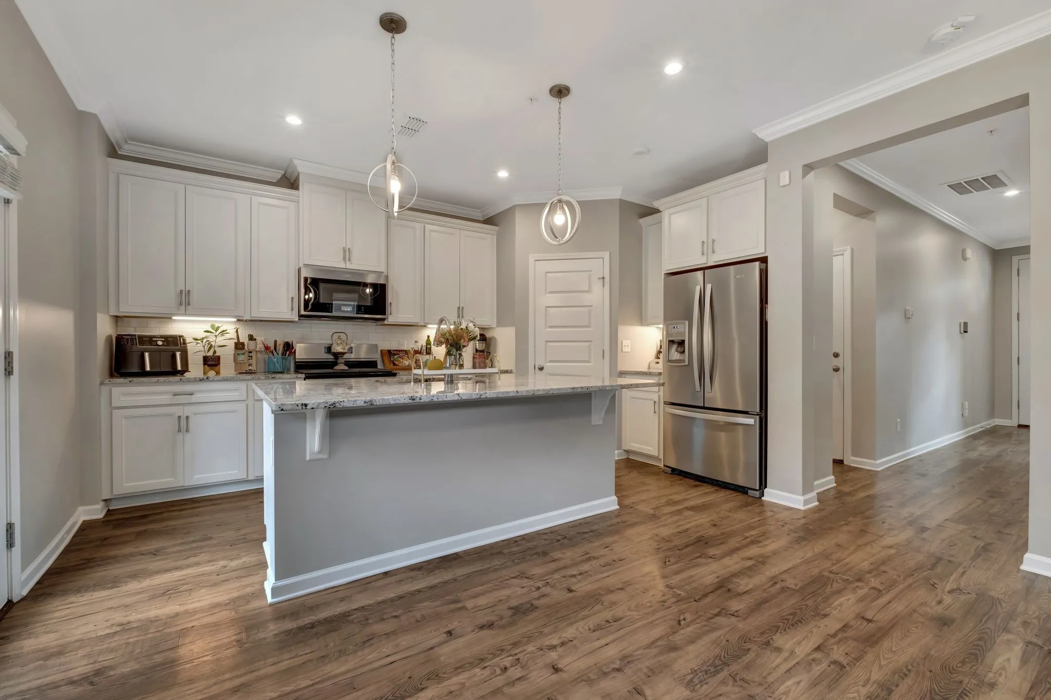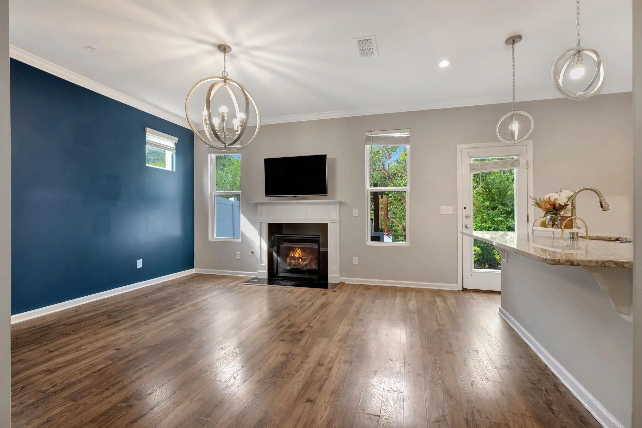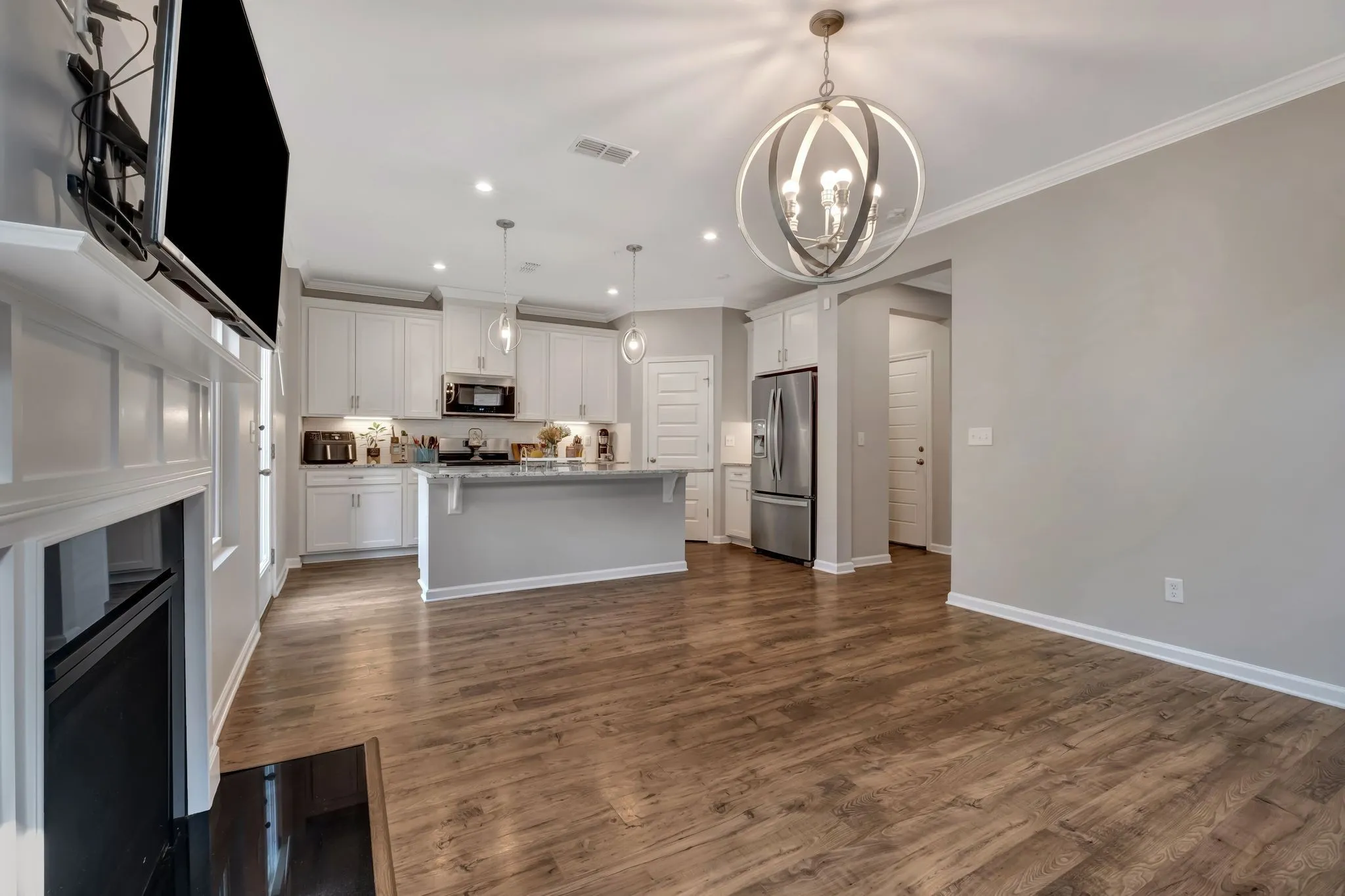You will love the space it provides, its open concept design, inviting living room, fireplace, elegant kitchen, with high ceilings, white cabinets, modern light fixtures, and granite countertops.