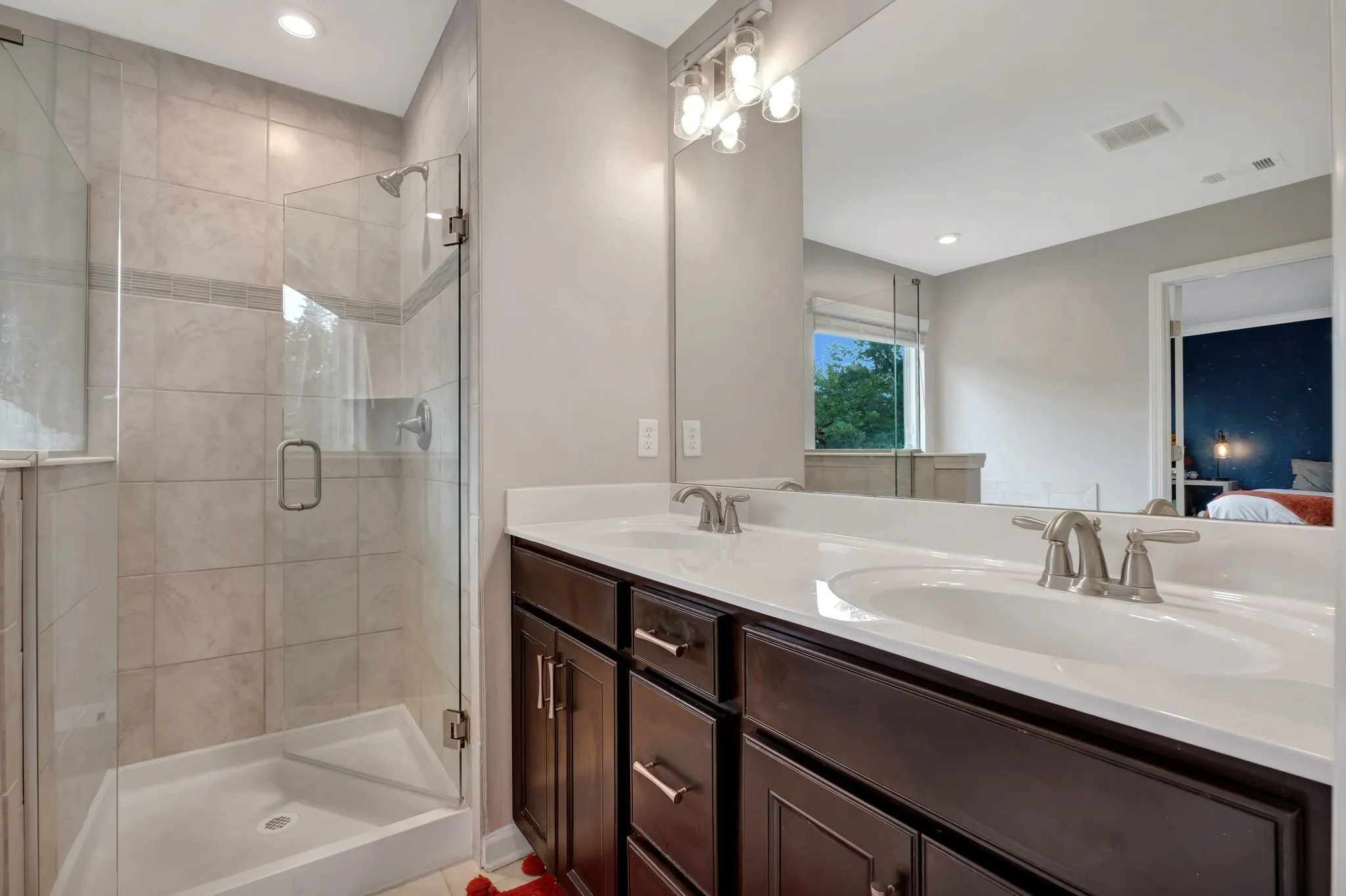 The master bath won’t fail to impress with a large soaking tub, double vanities, a walk-in closet and lots of windows with seasonal views of a creek!